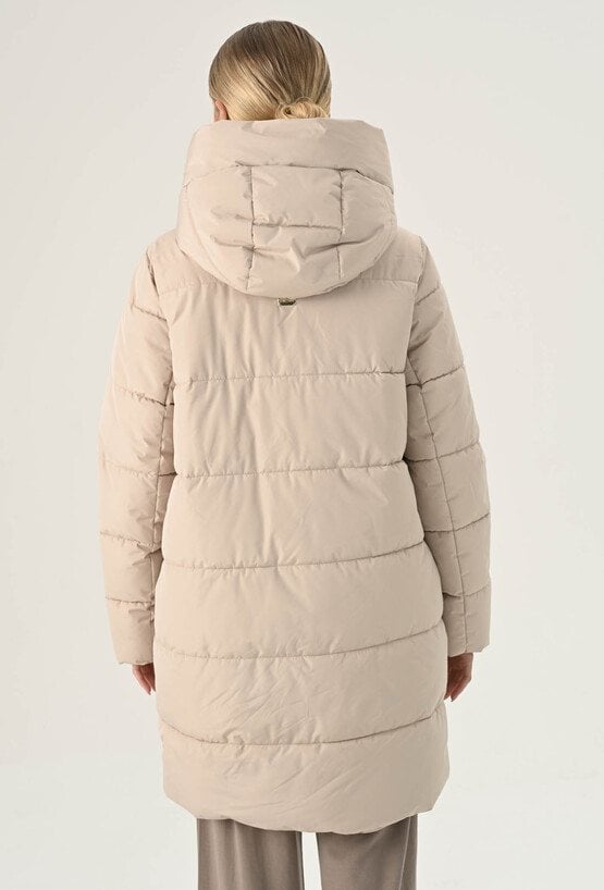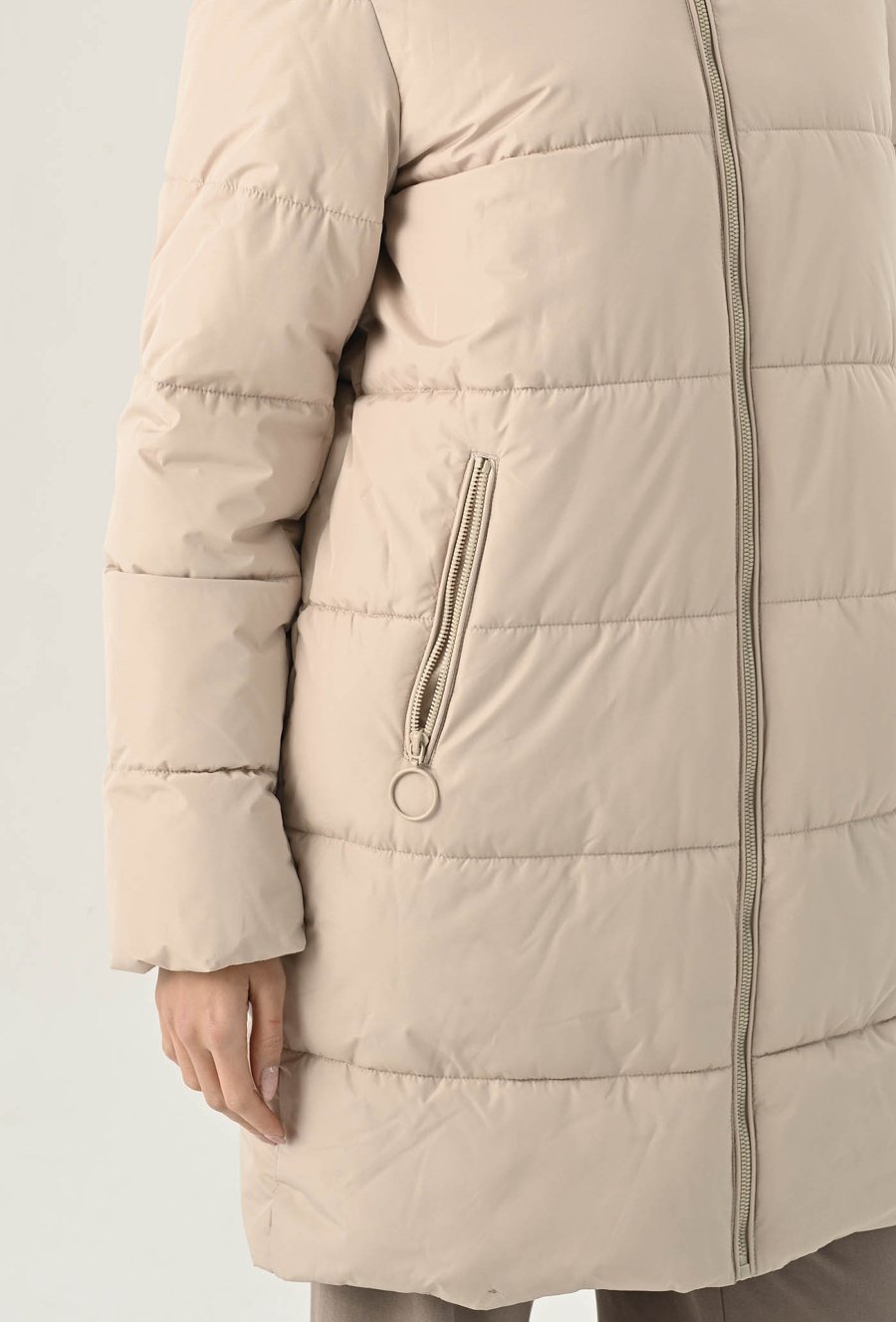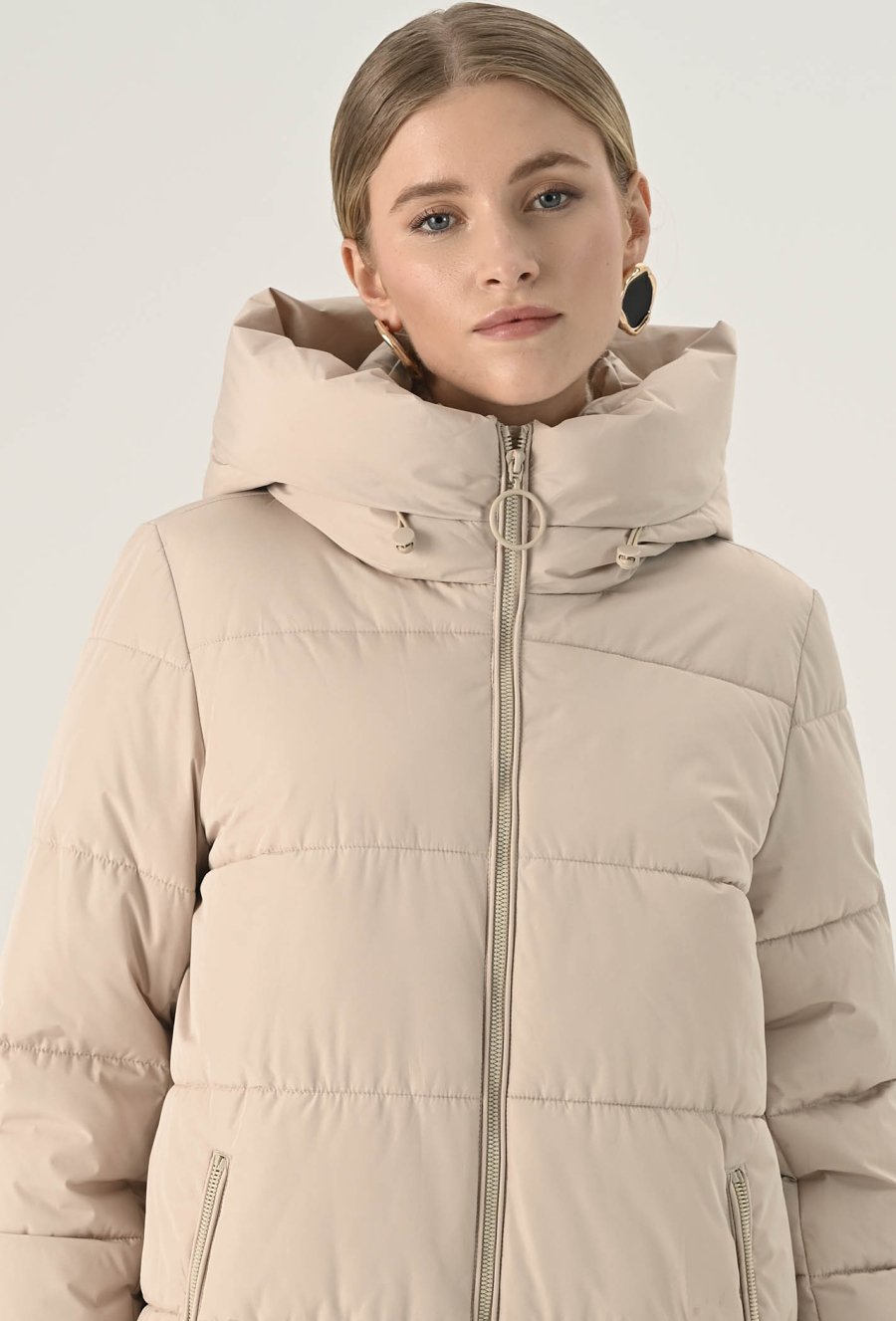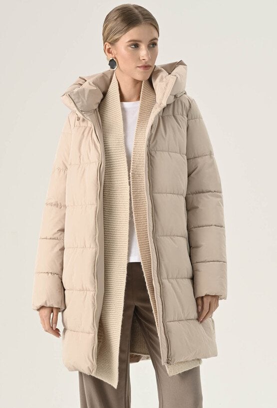 Beżowa, ciepła kurtka o prostym kroju z kapturem, idealna na chłodne dni. Kurtka zapinana jest na zamek z ozdobnym kołem, co zapewnia wygodę i dodatkową ochronę przed chłodem. Posiada dwie praktyczne kieszenie, idealne na drobiazgi lub ogrzanie dłoni. To doskonały wybór dla kobiet ceniących połączenie funkcjonalności i elegancji — sprawdzi się zarówno w codziennych, jak i bardziej stylowych zestawach. Modelka na zdjęciu ma 177 cm wzrostu i prezentuje rozmiar 36/S.