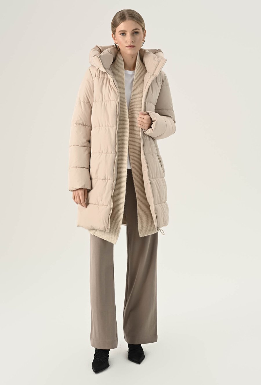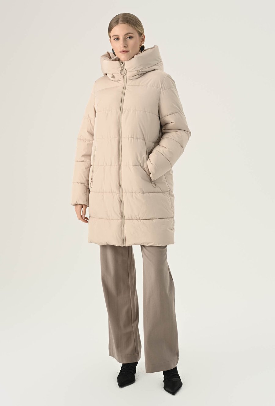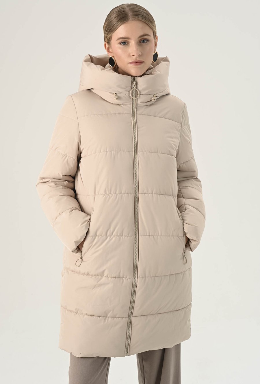 Beżowa, ciepła kurtka o prostym kroju z kapturem, idealna na chłodne dni. Kurtka zapinana jest na zamek z ozdobnym kołem, co zapewnia wygodę i dodatkową ochronę przed chłodem. Posiada dwie praktyczne kieszenie, idealne na drobiazgi lub ogrzanie dłoni. To doskonały wybór dla kobiet ceniących połączenie funkcjonalności i elegancji — sprawdzi się zarówno w codziennych, jak i bardziej stylowych zestawach. Modelka na zdjęciu ma 177 cm wzrostu i prezentuje rozmiar 36/S.