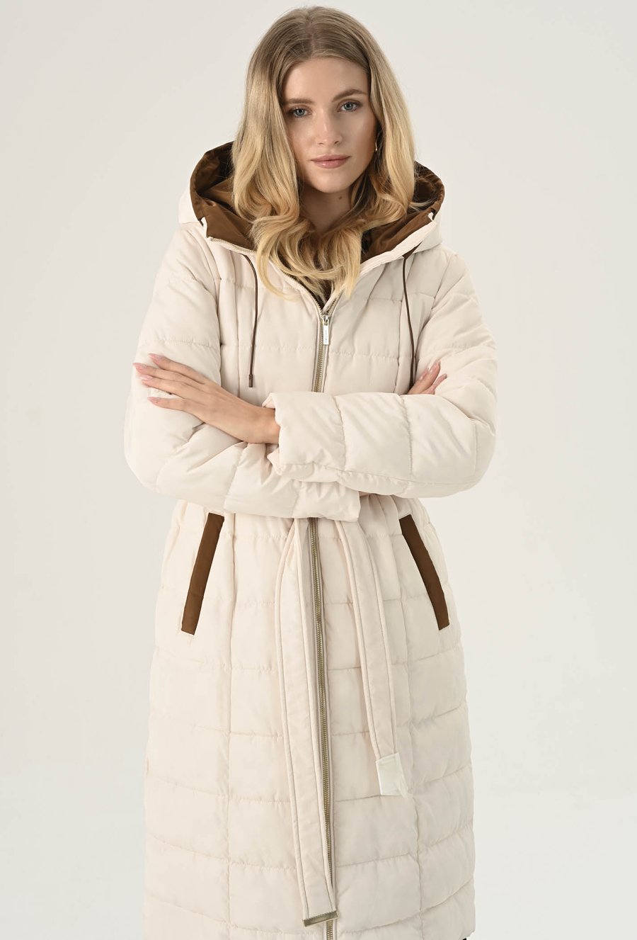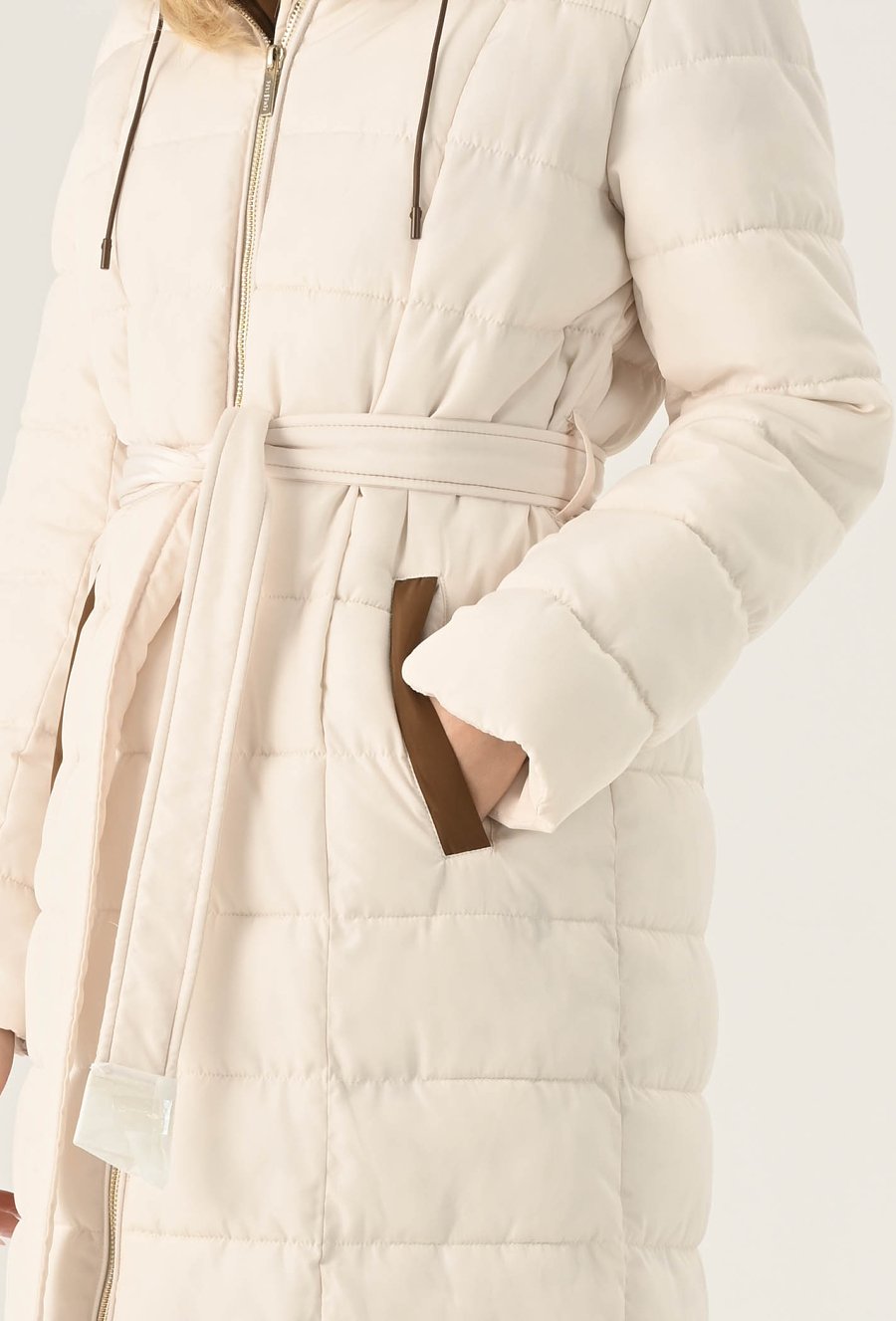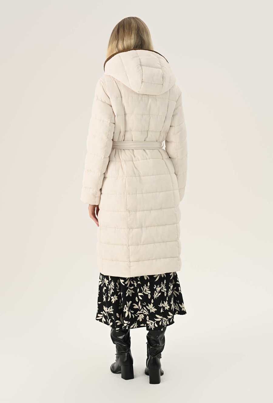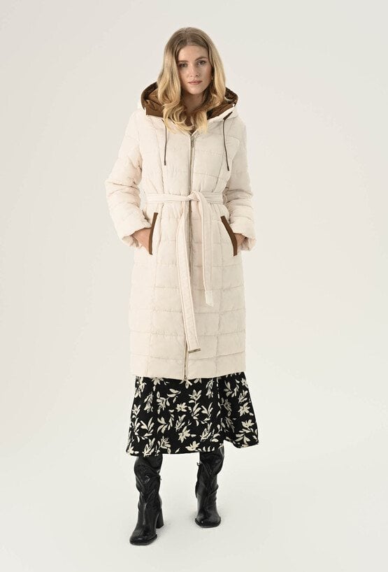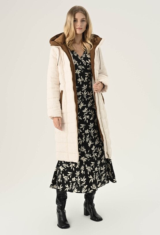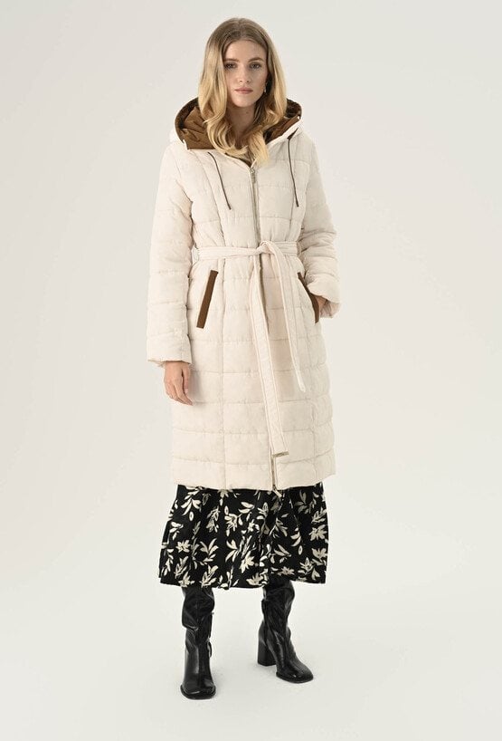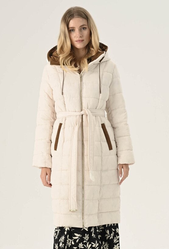 Elegancki płaszcz damski w białym kolorze. To bardzo fajna propozycja na chłodne dni. Ma ponadczasowy, szlafrokowy fason z podkreślającym sylwetkę wiązaniem w talii, duży kaptur, który osłoni nas przed chłodem oraz praktyczną długość, idealną do spódnic i spodni. Charakteru dodaje mu kontrastowe wykończenie. Został wykonany z pikowanego materiału z ciepłym wypełnieniem, dzięki czemu sprawdzi się doskonale jako okrycie wierzchnie w sezonie jesienno-zimowym. Modelka na zdjęciu ma 177 cm wzrostu i prezentuje rozmiar 36.