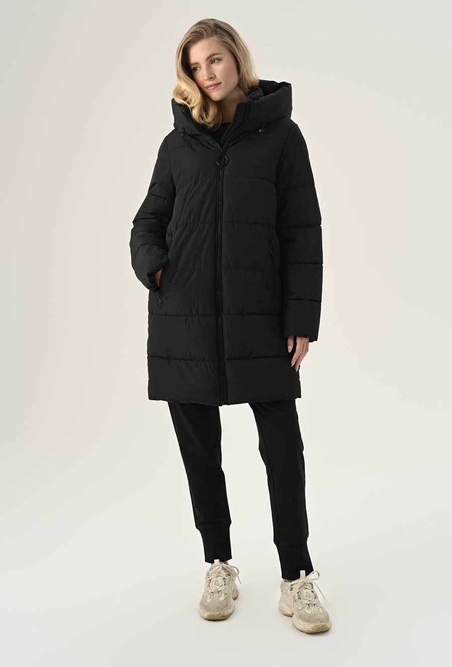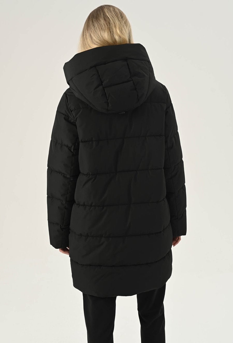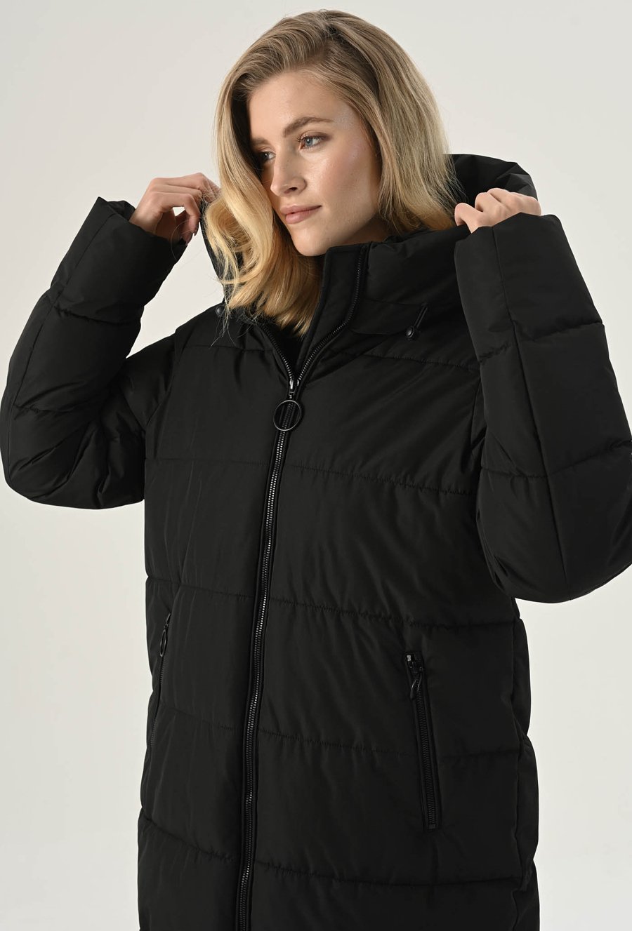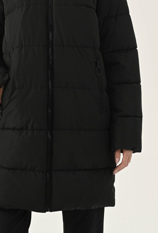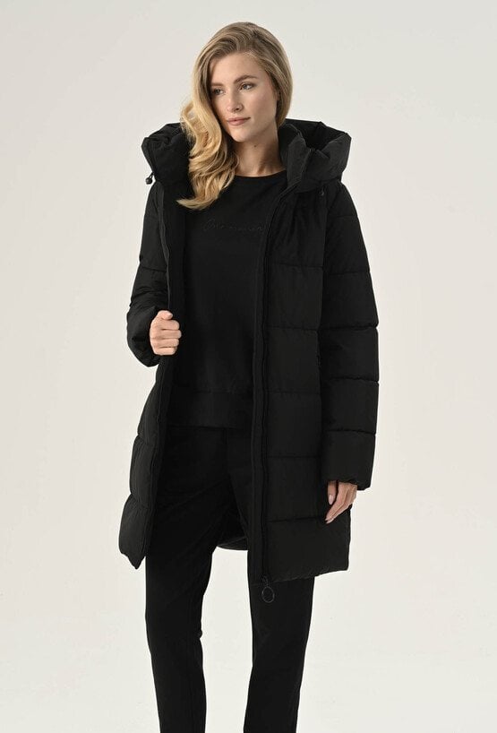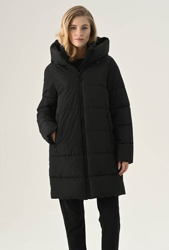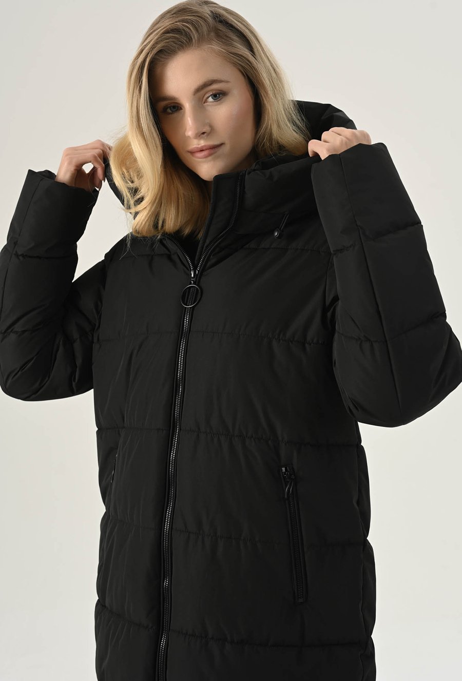 Czarna, ciepła kurtka o prostym kroju z kapturem, idealna na chłodne dni. Kurtka zapinana jest na zamek z ozdobnym kołem, co zapewnia wygodę i dodatkową ochronę przed chłodem. Posiada dwie praktyczne kieszenie, idealne na drobiazgi lub ogrzanie dłoni. To doskonały wybór dla kobiet ceniących połączenie funkcjonalności i elegancji — sprawdzi się zarówno w codziennych, jak i bardziej stylowych zestawach. Modelka na zdjęciu ma 177 cm wzrostu i prezentuje rozmiar 36/S.