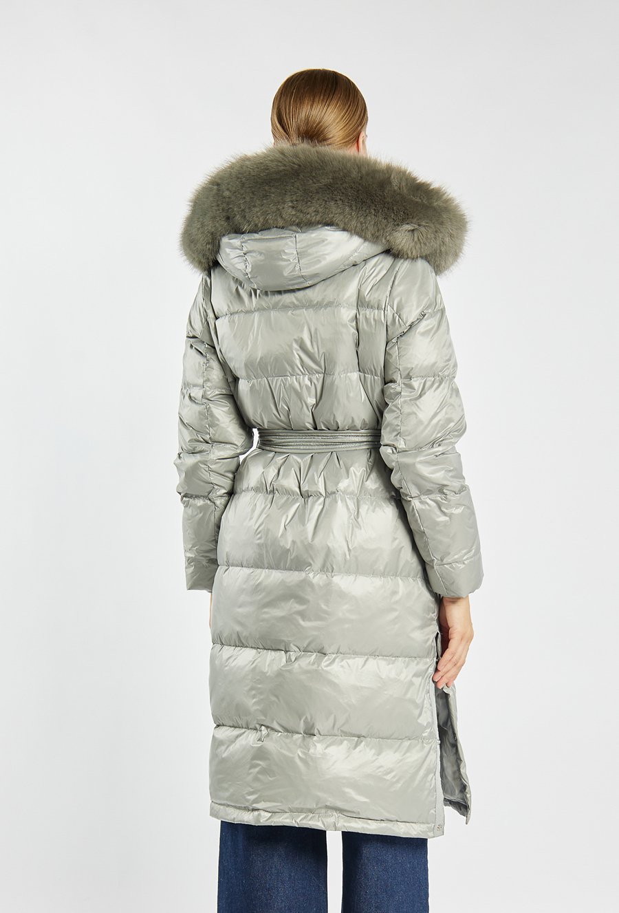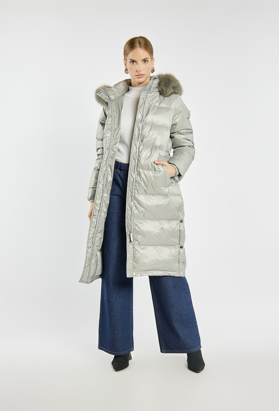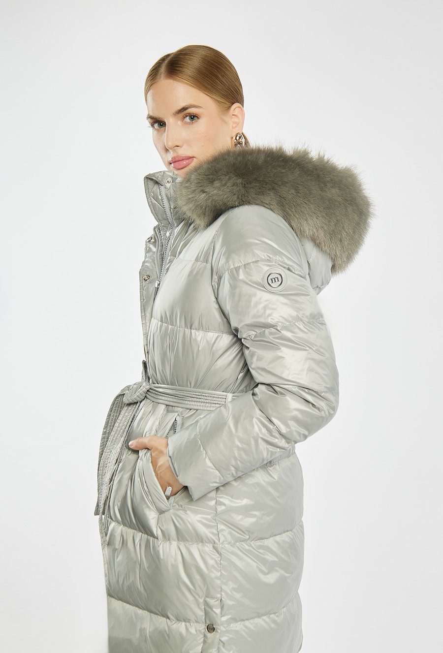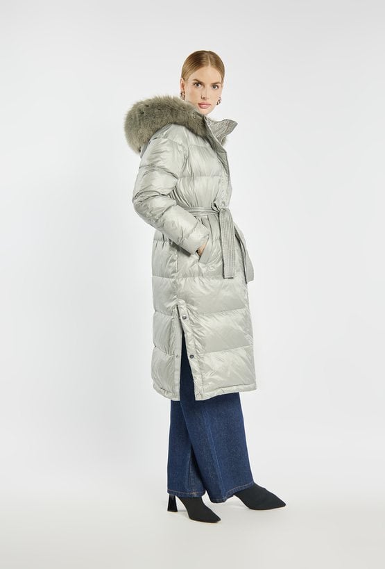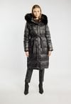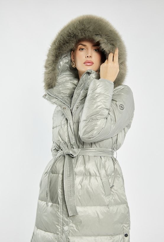Długi, pikowany płaszcz o prostym kroju, zapinany na suwak i zatrzaski. osiada praktyczny kaptur z obszyciem z futerka – zarówno kaptur, jak i futerko można odpiąć, co pozwala na różne sposoby noszenia. Idealny wybór na zimowe dni, gwarantujący ciepło i elegancję. Modelka na zdjęciu ma 177 cm wzrostu i prezentuje rozmiar 36.