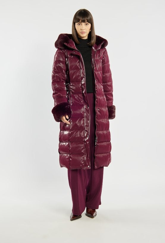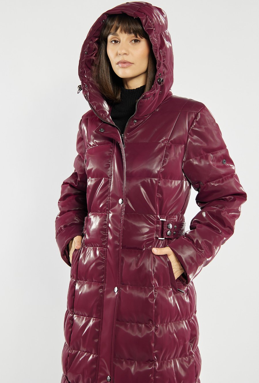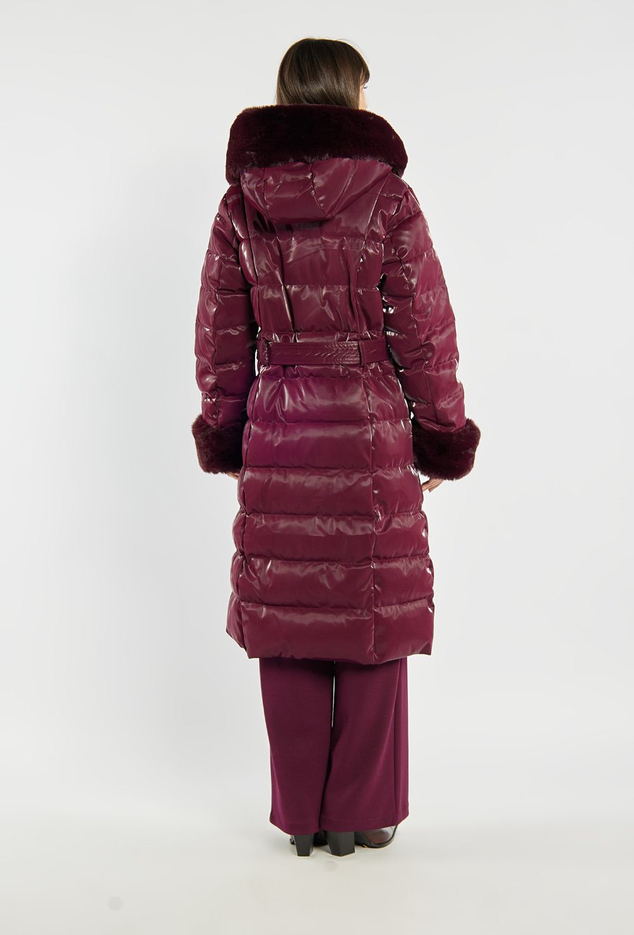 Długi pikowany płaszcz damski z eleganckim połyskiem. Płaszcz wyposażony w pasek podkreślający talię, zapinane kieszenie oraz praktyczny kaptur. Ozdobne futerko przy kołnierzu i mankietach nadaje całości luksusowego charakteru, a możliwość jego odpięcia pozwala na łatwe dopasowanie stylizacji do okazji. Idealna propozycja na zimowe dni. Modelka na zdjęciu ma 177 cm wzrostu i prezentuje rozmiar 36.