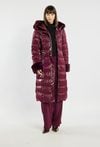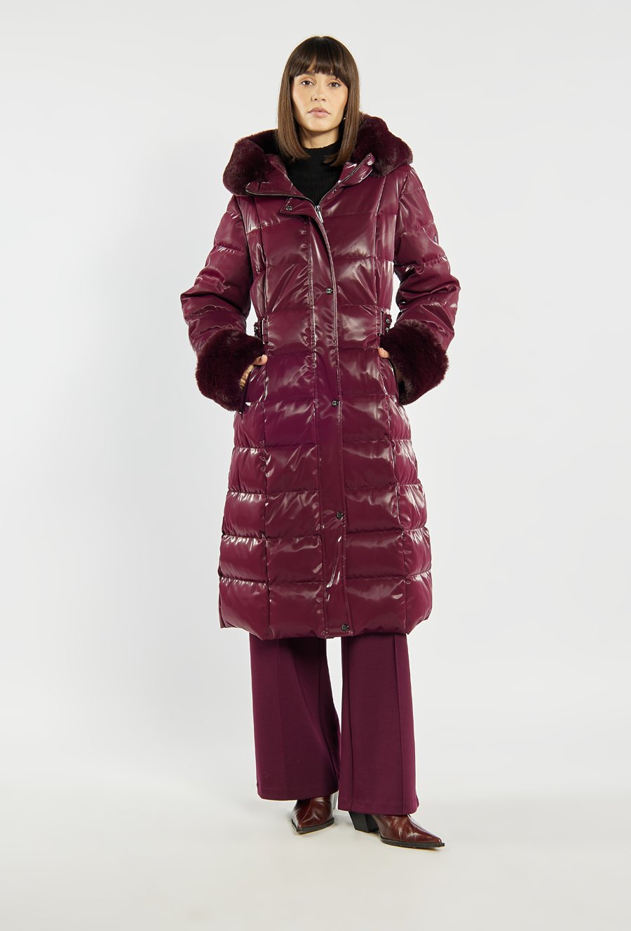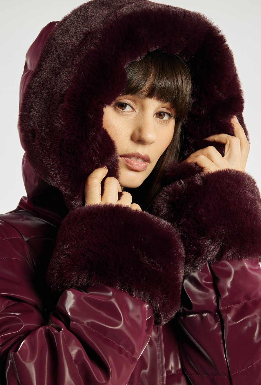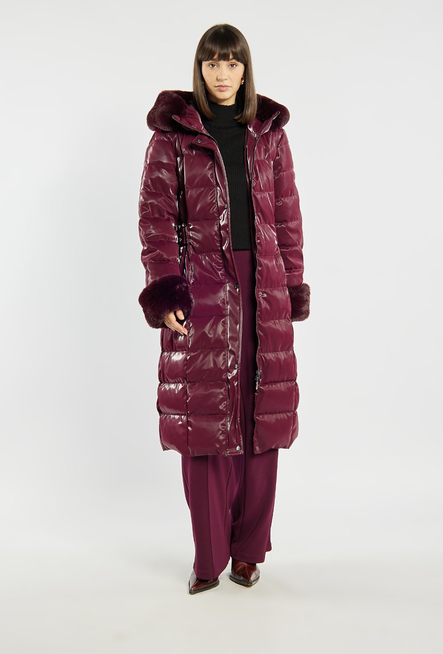 Długi pikowany płaszcz damski z eleganckim połyskiem. Płaszcz wyposażony w pasek podkreślający talię, zapinane kieszenie oraz praktyczny kaptur. Ozdobne futerko przy kołnierzu i mankietach nadaje całości luksusowego charakteru, a możliwość jego odpięcia pozwala na łatwe dopasowanie stylizacji do okazji. Idealna propozycja na zimowe dni. Modelka na zdjęciu ma 177 cm wzrostu i prezentuje rozmiar 36.
