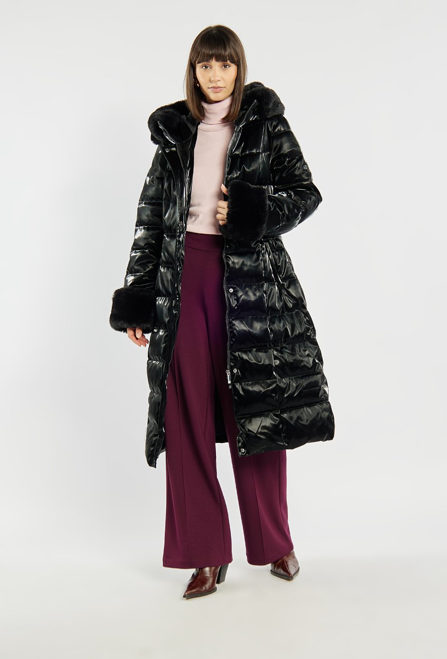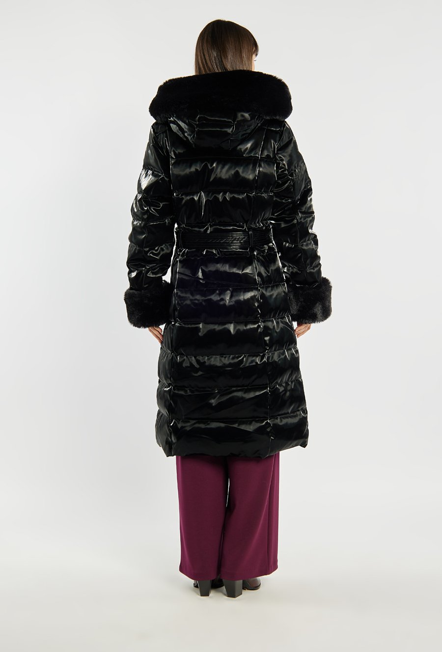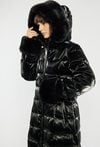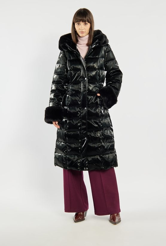 Długi pikowany płaszcz damski z eleganckim połyskiem. Płaszcz wyposażony w pasek podkreślający talię, zapinane kieszenie oraz praktyczny kaptur. Ozdobne futerko przy kołnierzu i mankietach nadaje całości luksusowego charakteru, a możliwość jego odpięcia pozwala na łatwe dopasowanie stylizacji do okazji. Idealna propozycja na zimowe dni. Modelka na zdjęciu ma 177 cm wzrostu i prezentuje rozmiar 36.