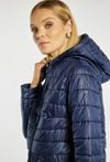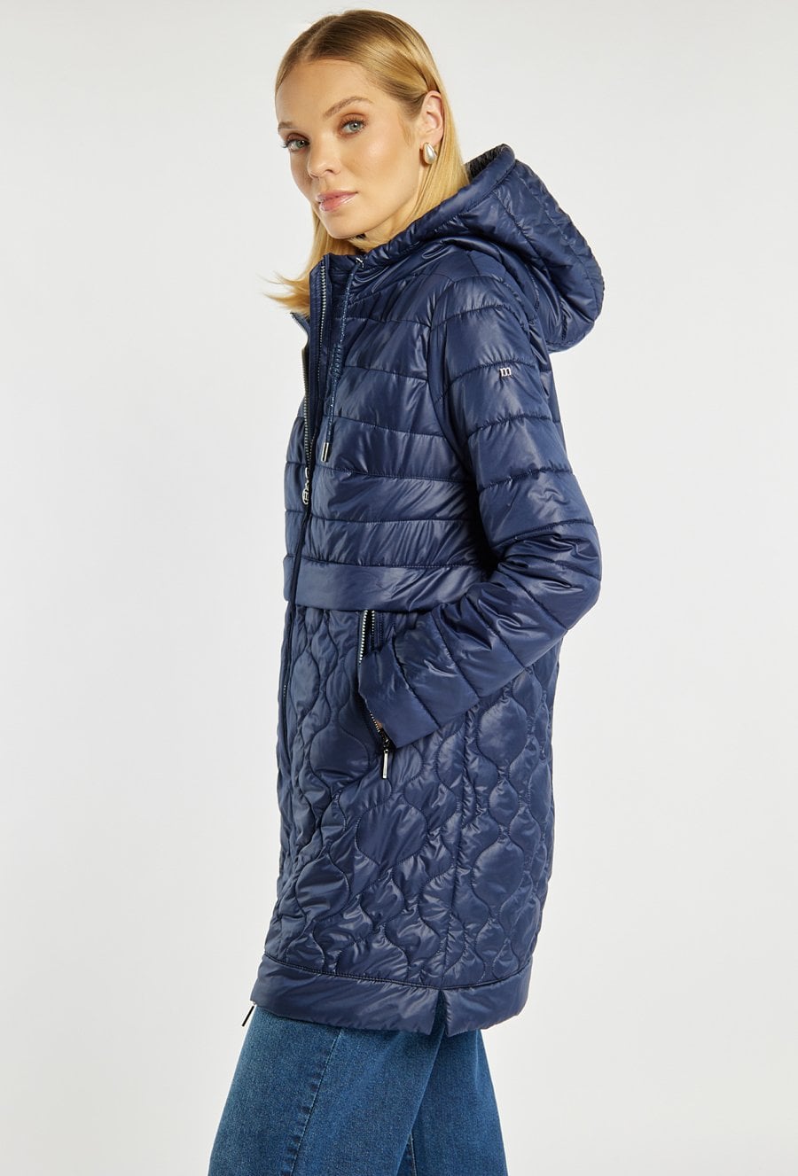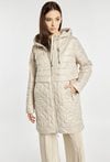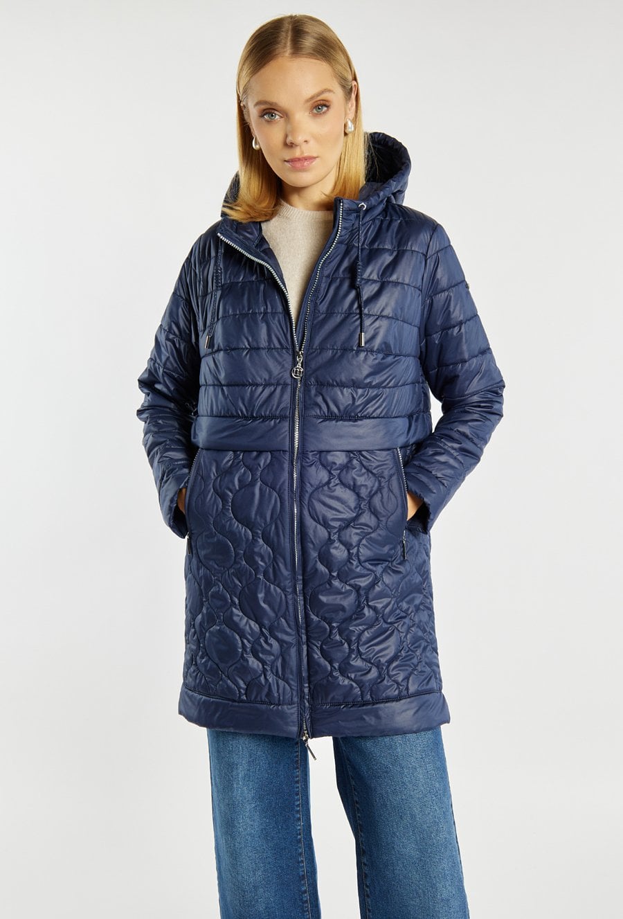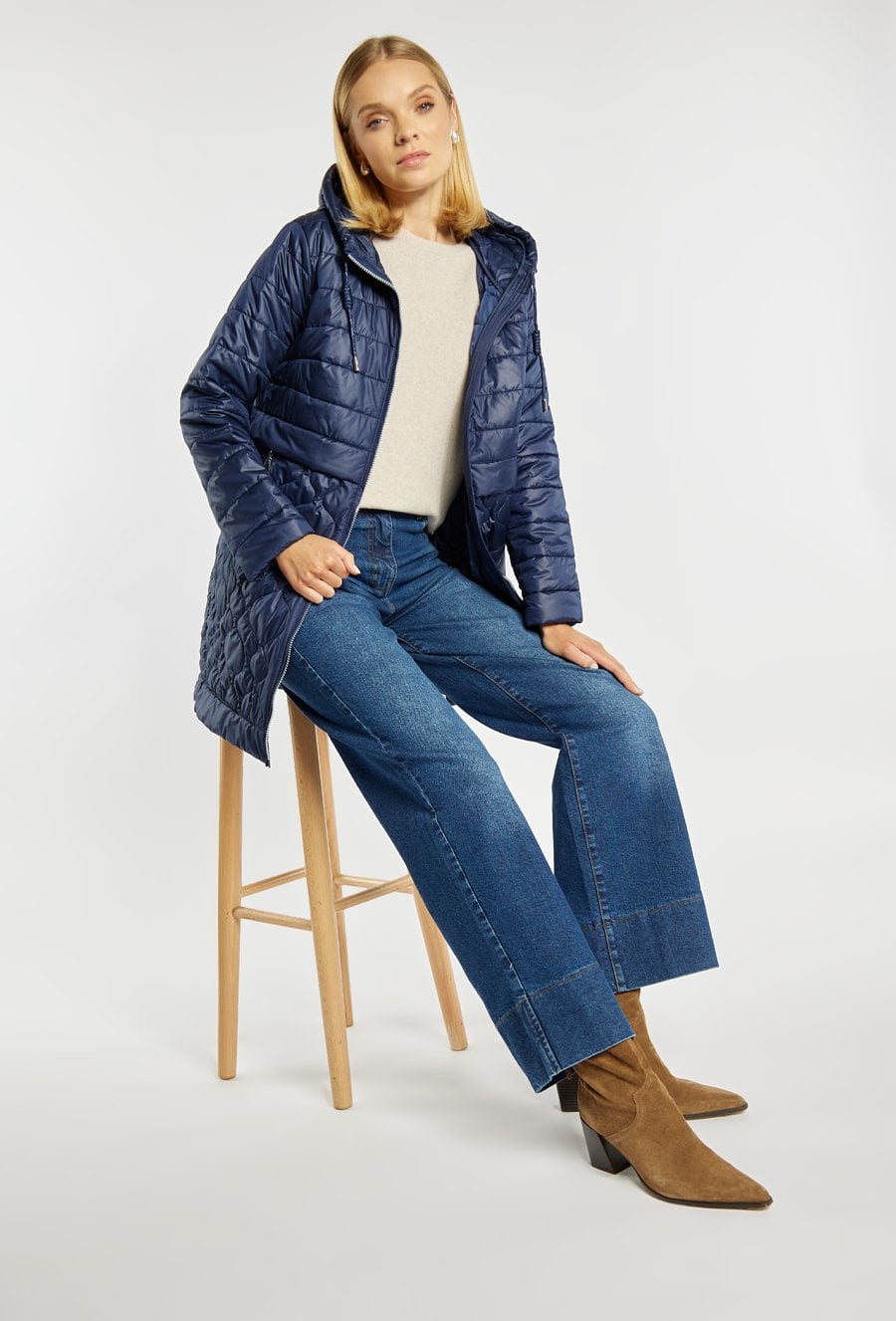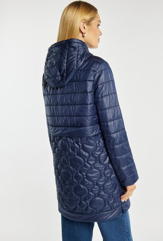 Lekki, pikowany płaszcz idealny na wiosnę. Model ma przedłużony krój, wygodne kieszenie i kaptur regulowany sznurkami, dzięki czemu dobrze sprawdza się przy zmiennej pogodzie. Płaszcz świetnie komponuje się z codziennymi stylizacjami i zapewnia komfort w chłodniejsze, wiosenne dni. Modelka na zdjęciu ma 177 cm wzrostu i prezentuje rozmiar 36.
