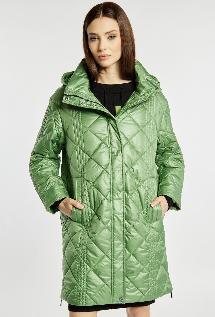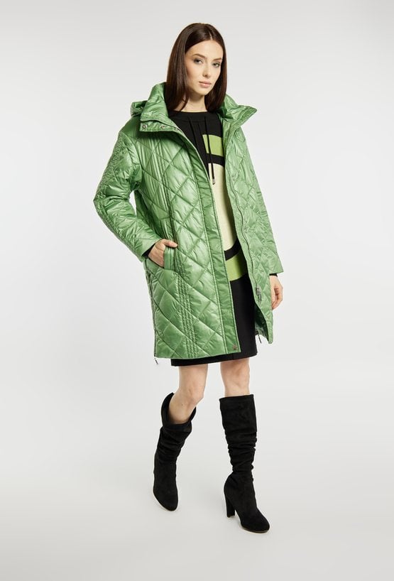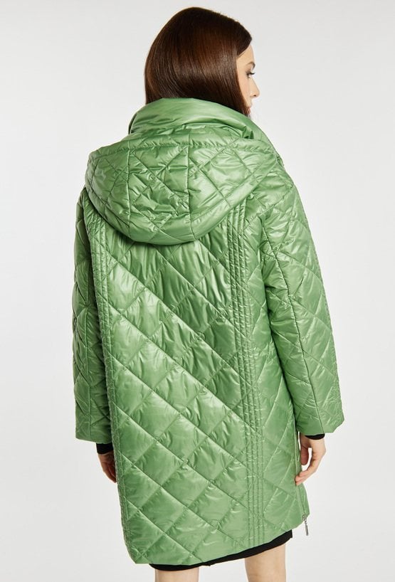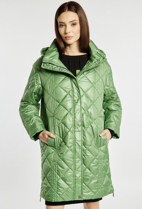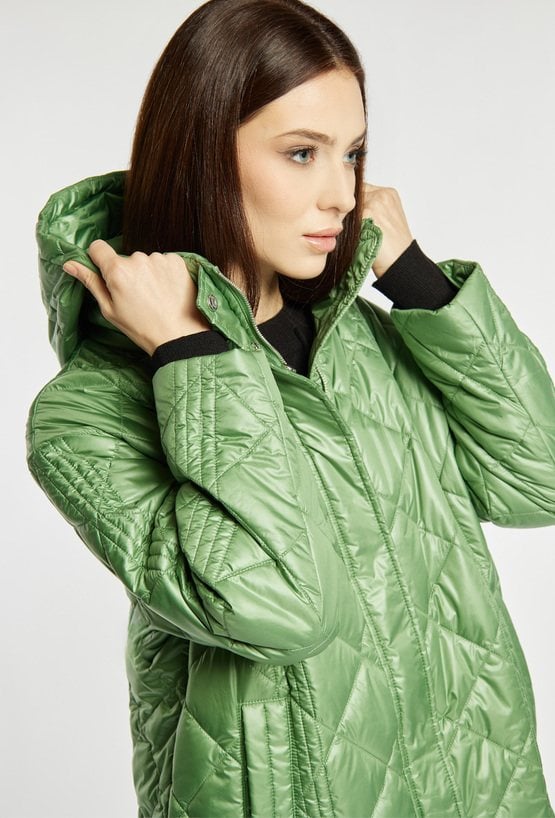 Płaszcz damski z długimi rękawami i odpinanym kapturem zapinany jest na suwak i napy, co zapewnia wygodę noszenia i ochronę przed chłodem. Lekki, pikowany płaszcz idealny na wiosenne i przejściowe dni. Modelka na zdjęciu ma 177 cm wzrostu i prezentuje rozmiar 36.