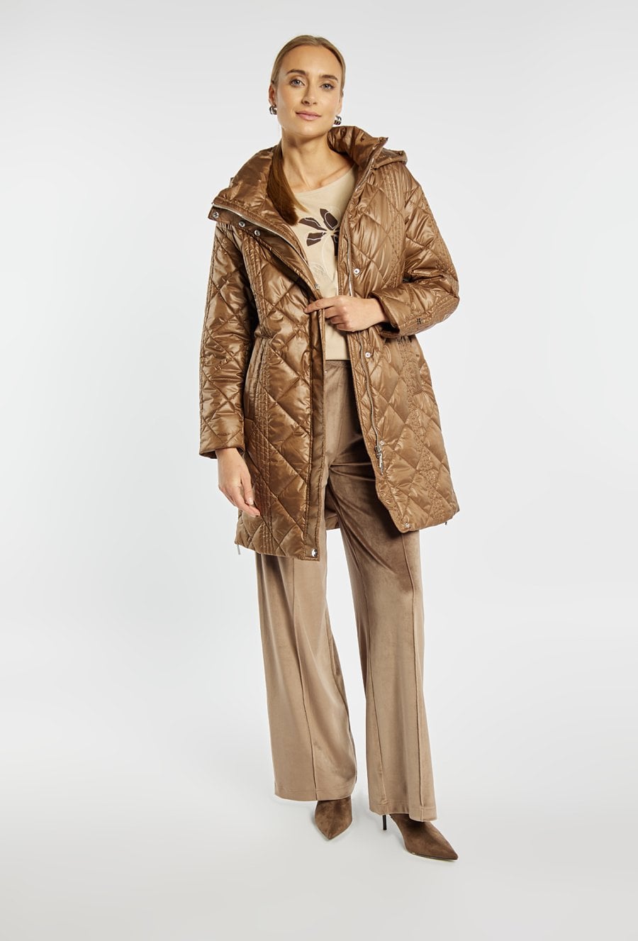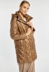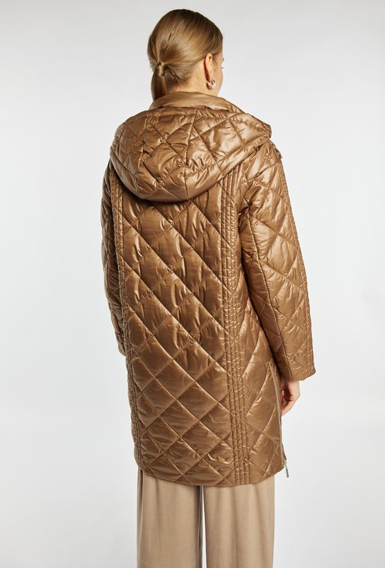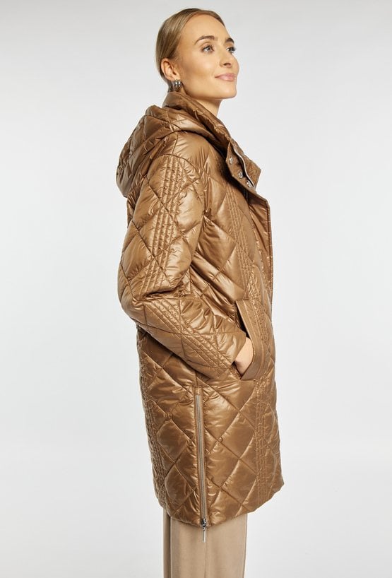 Płaszcz damski z długimi rękawami i odpinanym kapturem zapinany jest na suwak i napy, co zapewnia wygodę noszenia i ochronę przed chłodem. Lekki, pikowany płaszcz idealny na wiosenne i przejściowe dni. Modelka na zdjęciu ma 177 cm wzrostu i prezentuje rozmiar 36.