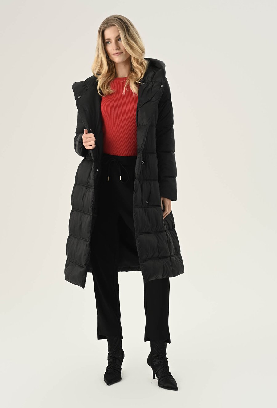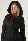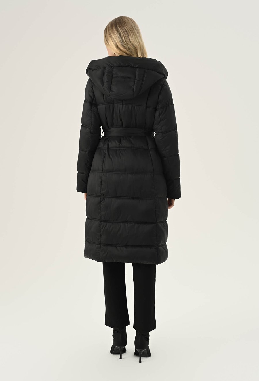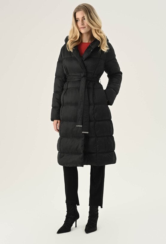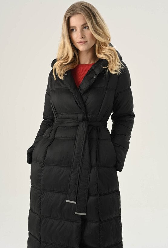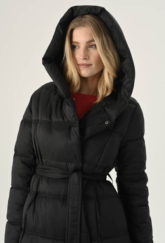 Elegancki płaszcz damski w czarnym klasycznym kolorze. To bardzo fajna propozycja na chłodne dni. Ma ponadczasowy, szlafrokowy fason z podkreślającym sylwetkę wiązaniem w talii, duży kaptur, który osłoni nas przed chłodem oraz praktyczną długość, idealną do spódnic i spodni. Został wykonany z pikowanego materiału z ciepłym wypełnieniem, dzięki czemu sprawdzi się doskonale jako okrycie wierzchnie w sezonie jesienno-zimowym. Modelka na zdjęciu ma 177 cm wzrostu i prezentuje rozmiar 36.