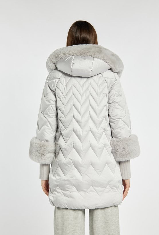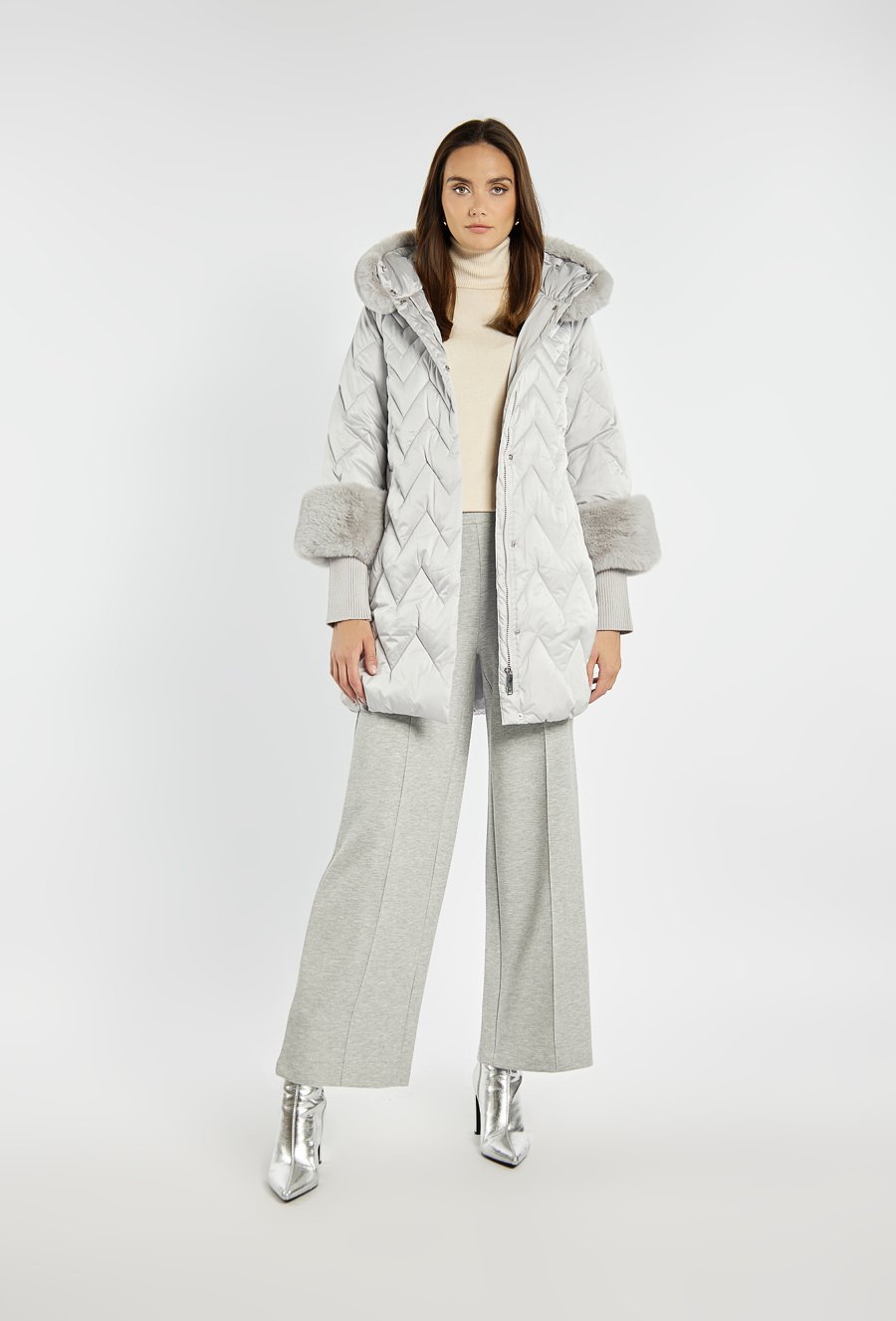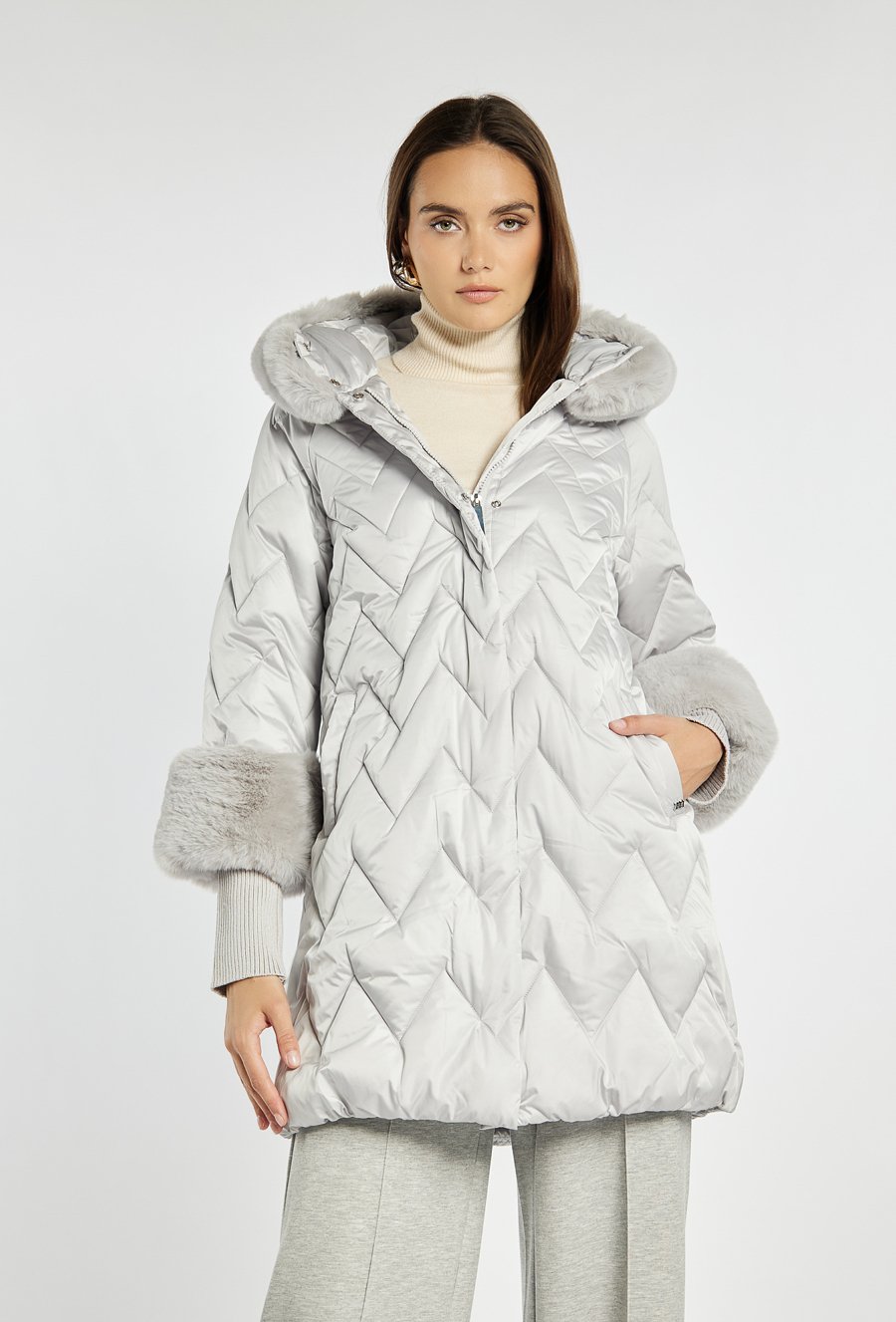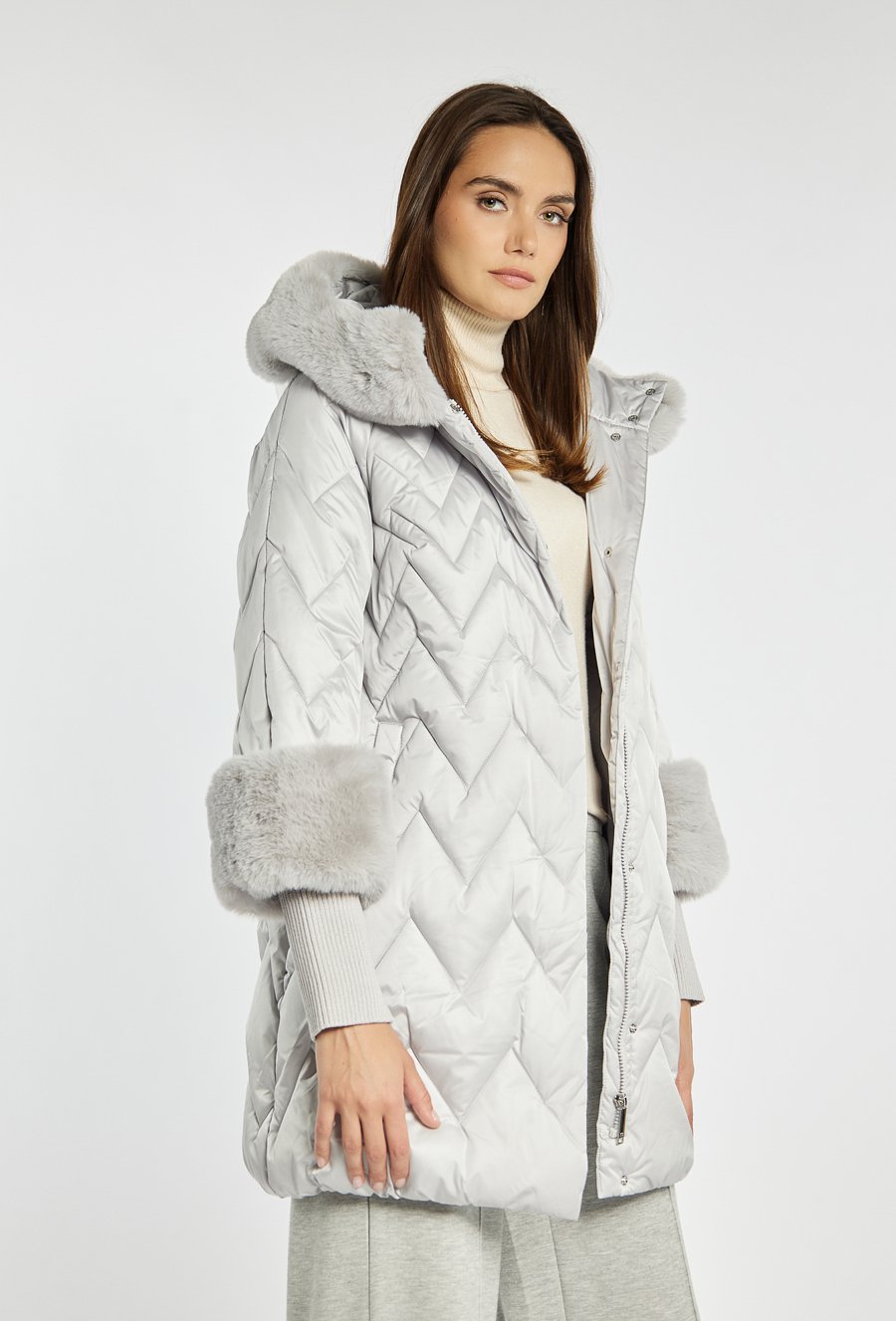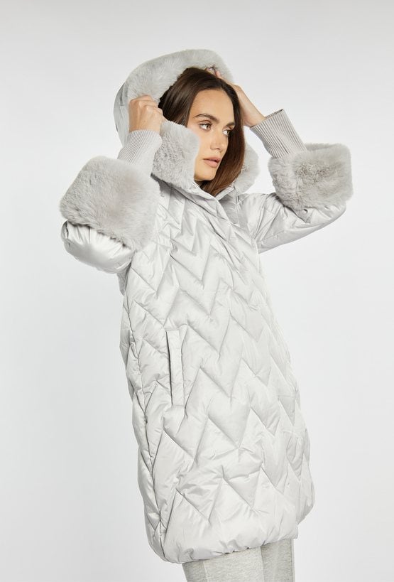 Płaszcz pikowany z kapturem to elegancka i funkcjonalna propozycja na zimowe dni. Płaszcz zapinany na suwak i napy, z ozdobnym pikowaniem w jodełkę. Rękawy oraz kaptur wykończone są efektownym futerkiem z możliwością odpięcia. Modelka na zdjęciu ma 177 cm wzrostu i prezentuje rozmiar 36.