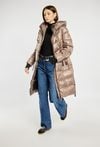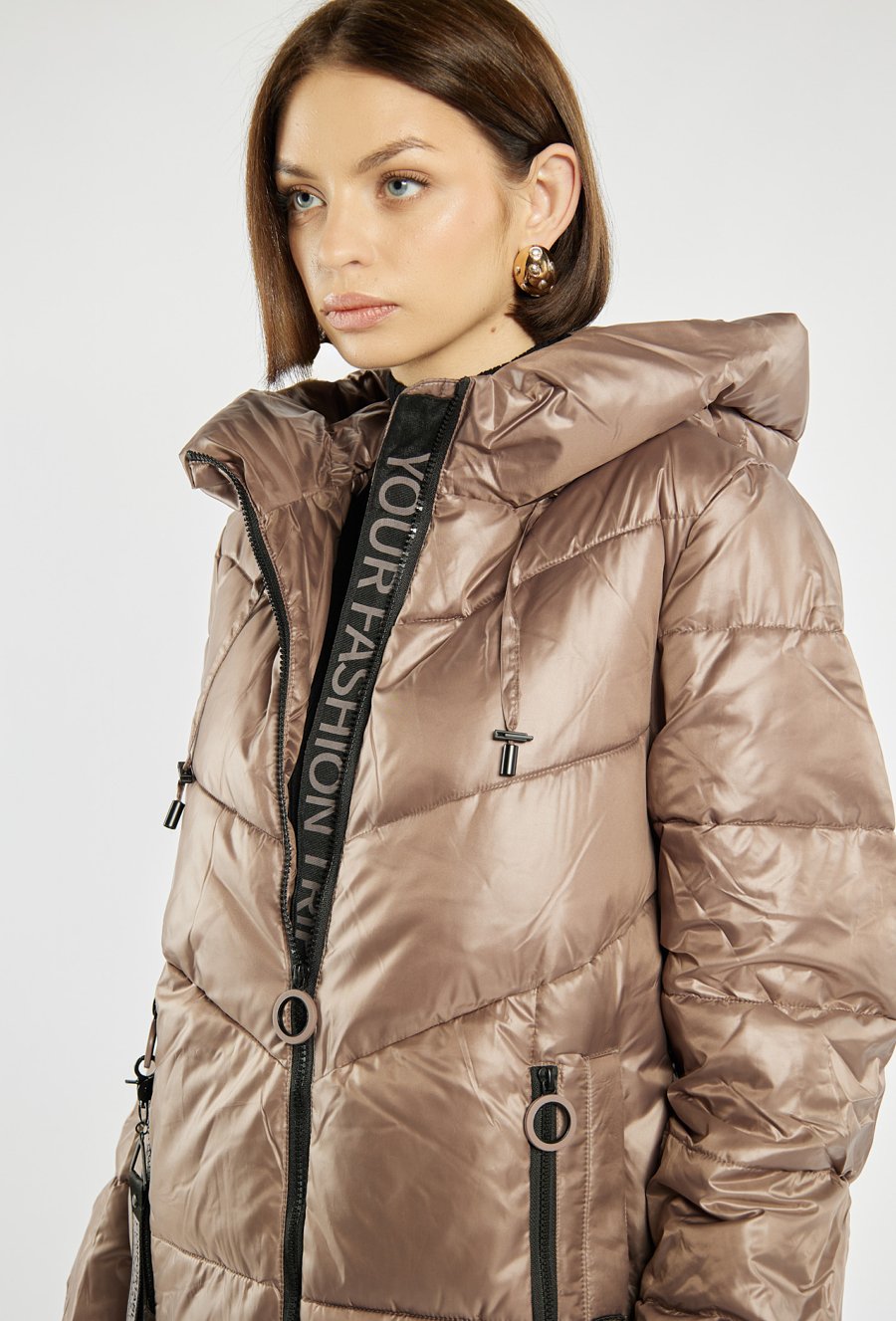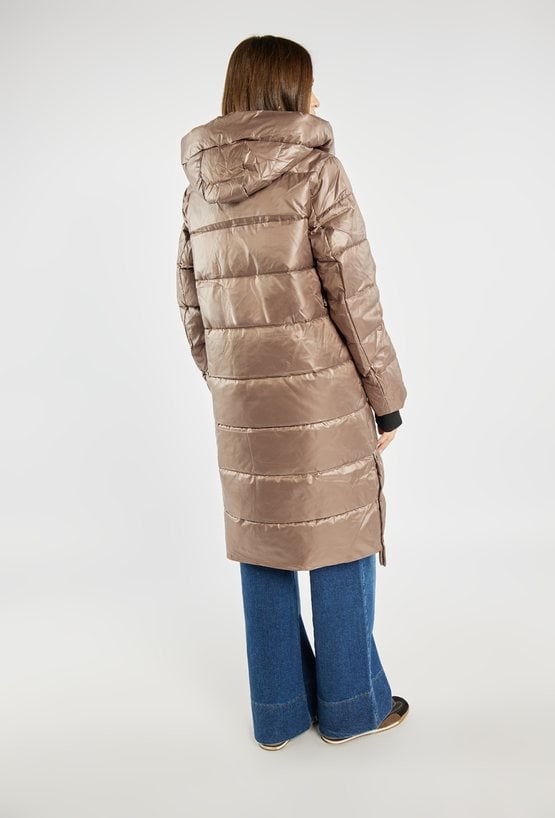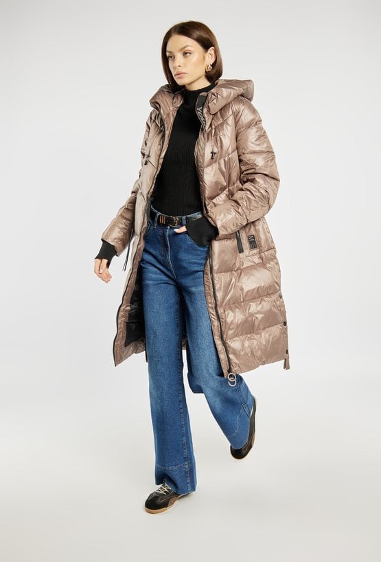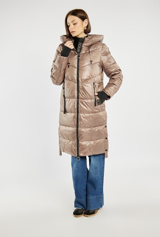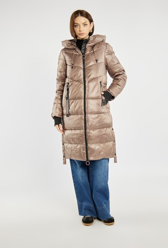 Płaszcz damski z pikowaniem. Wyposażony w praktyczny kaptur, który chroni przed chłodem i wiatrem. Model ma wygodne kieszenie oraz ozdobne suwaki umieszczone po bokach, dodające mu nowoczesnego charakteru. Długi krój zapewnia komfort i ciepło, dzięki czemu płaszcz doskonale sprawdzi się w chłodniejsze dni, łącząc funkcjonalność ze stylowym wyglądem.