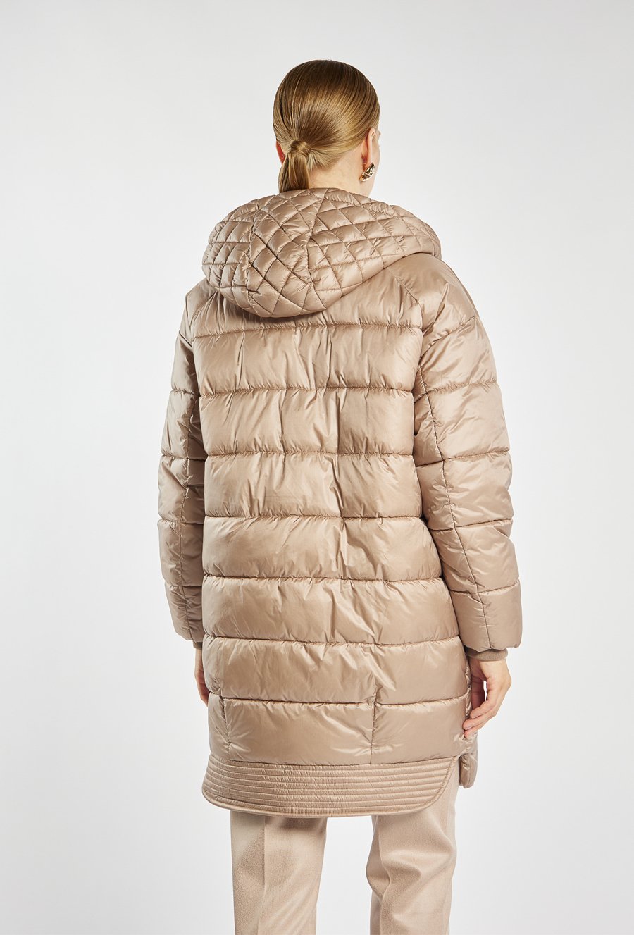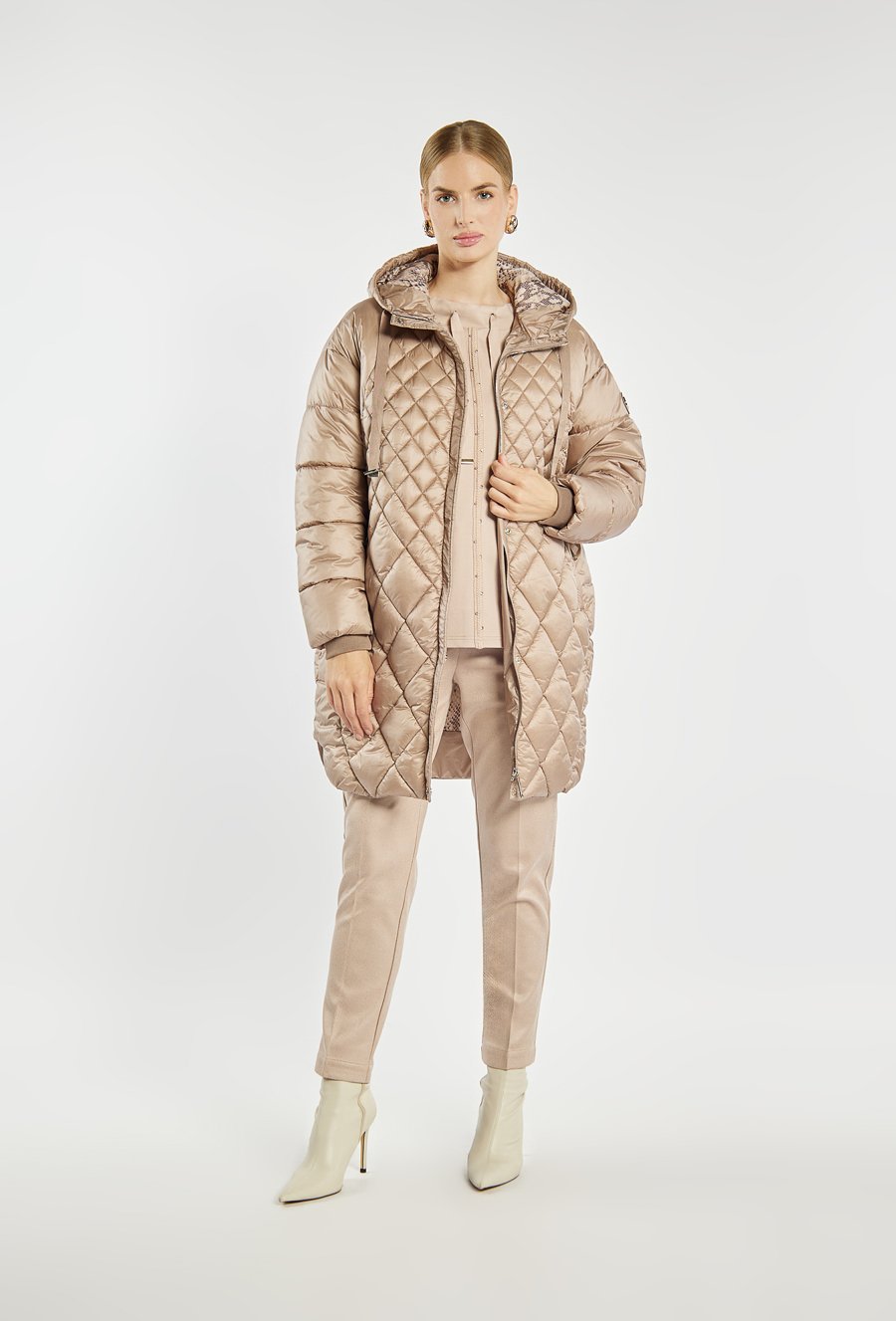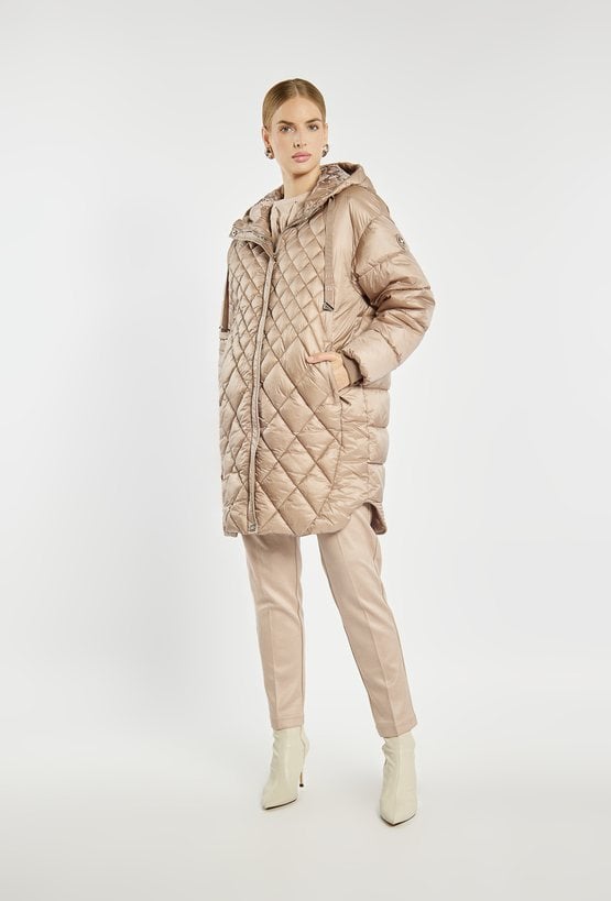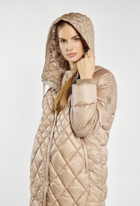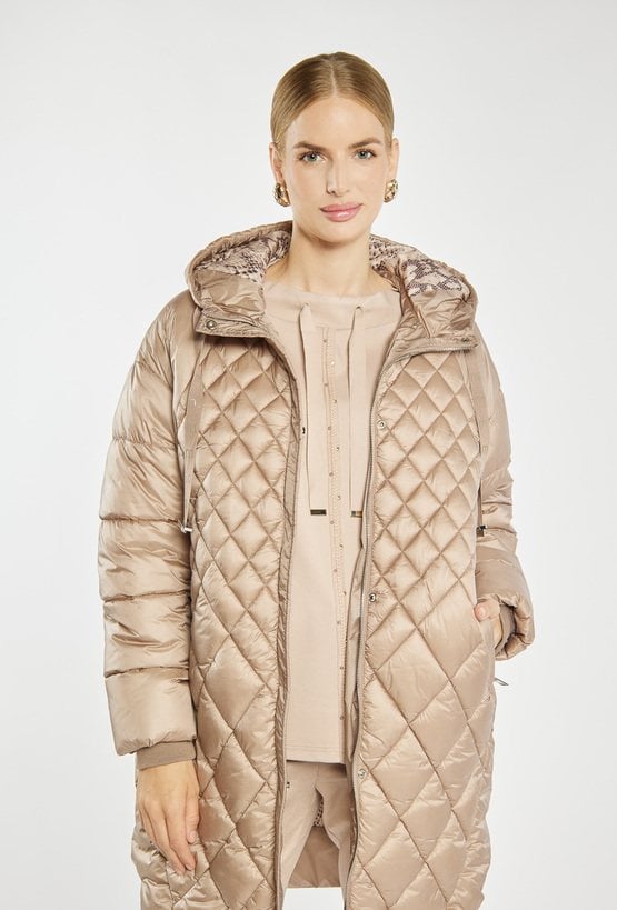 Pikowany płaszcz o kobiecym, lekko wydłużonym kroju to idealne połączenie komfortu i nowoczesnego stylu. Praktyczny kaptur zapewnia ochronę przed chłodem. Świetna propozycja na co dzień w sezonie jesienno-zimowym. Modelka na zdjęciu ma 177 cm wzrostu i prezentuje rozmiar 36.