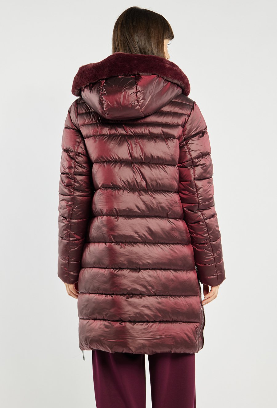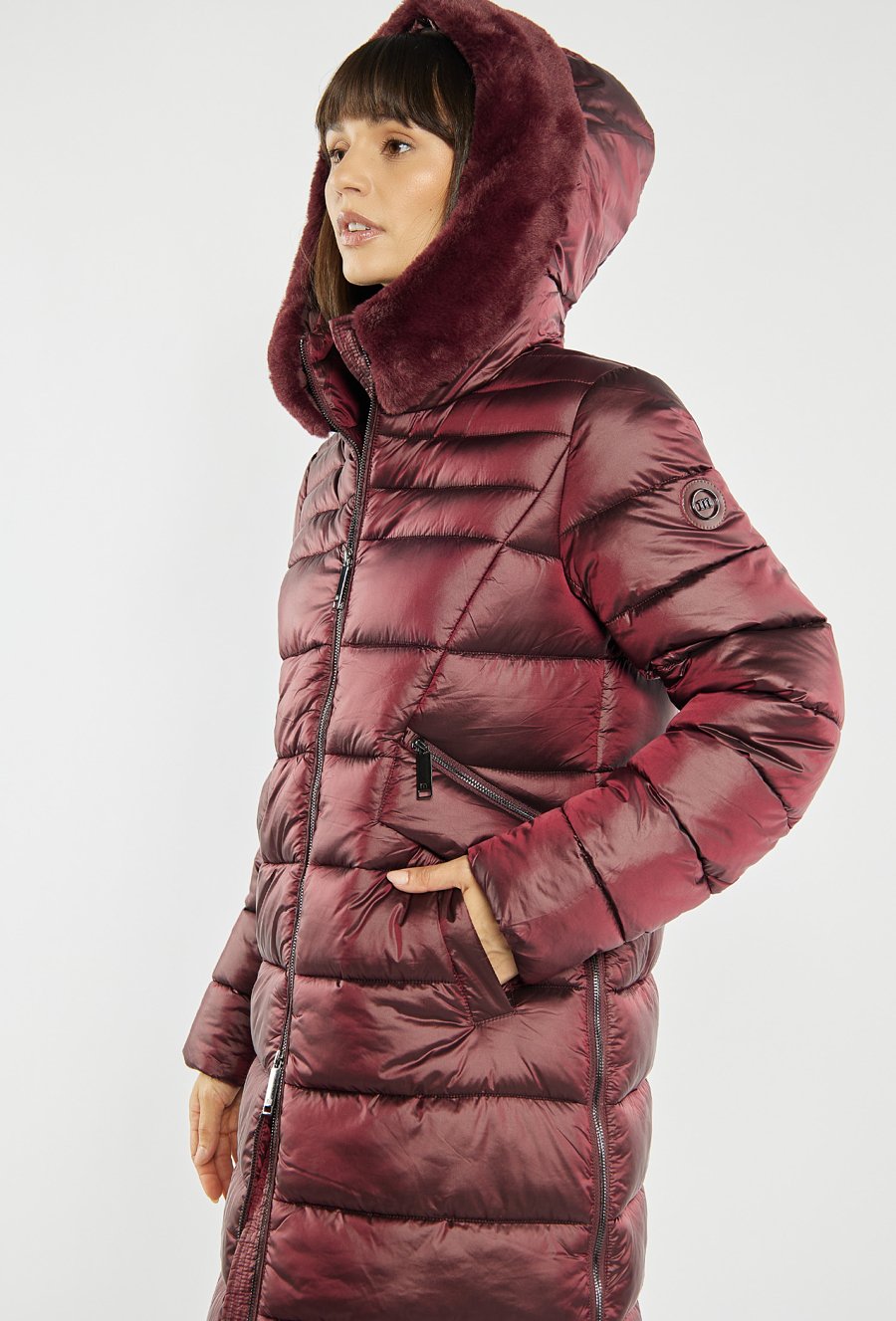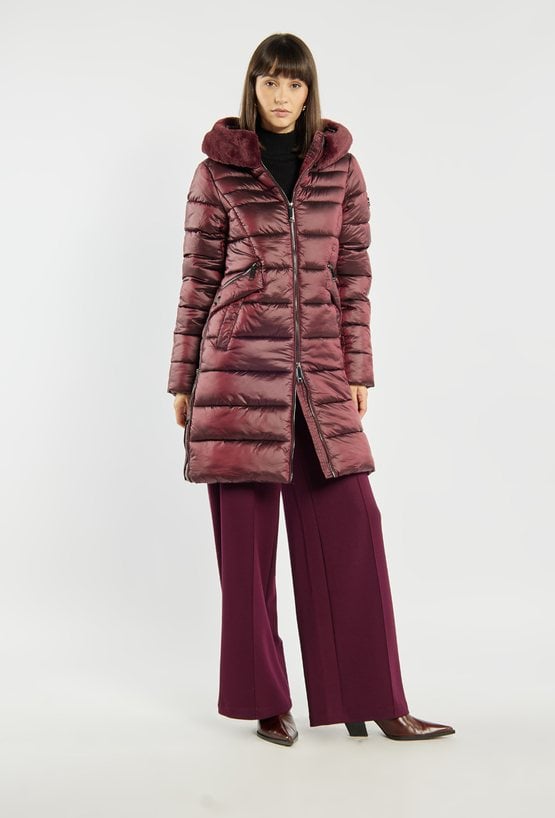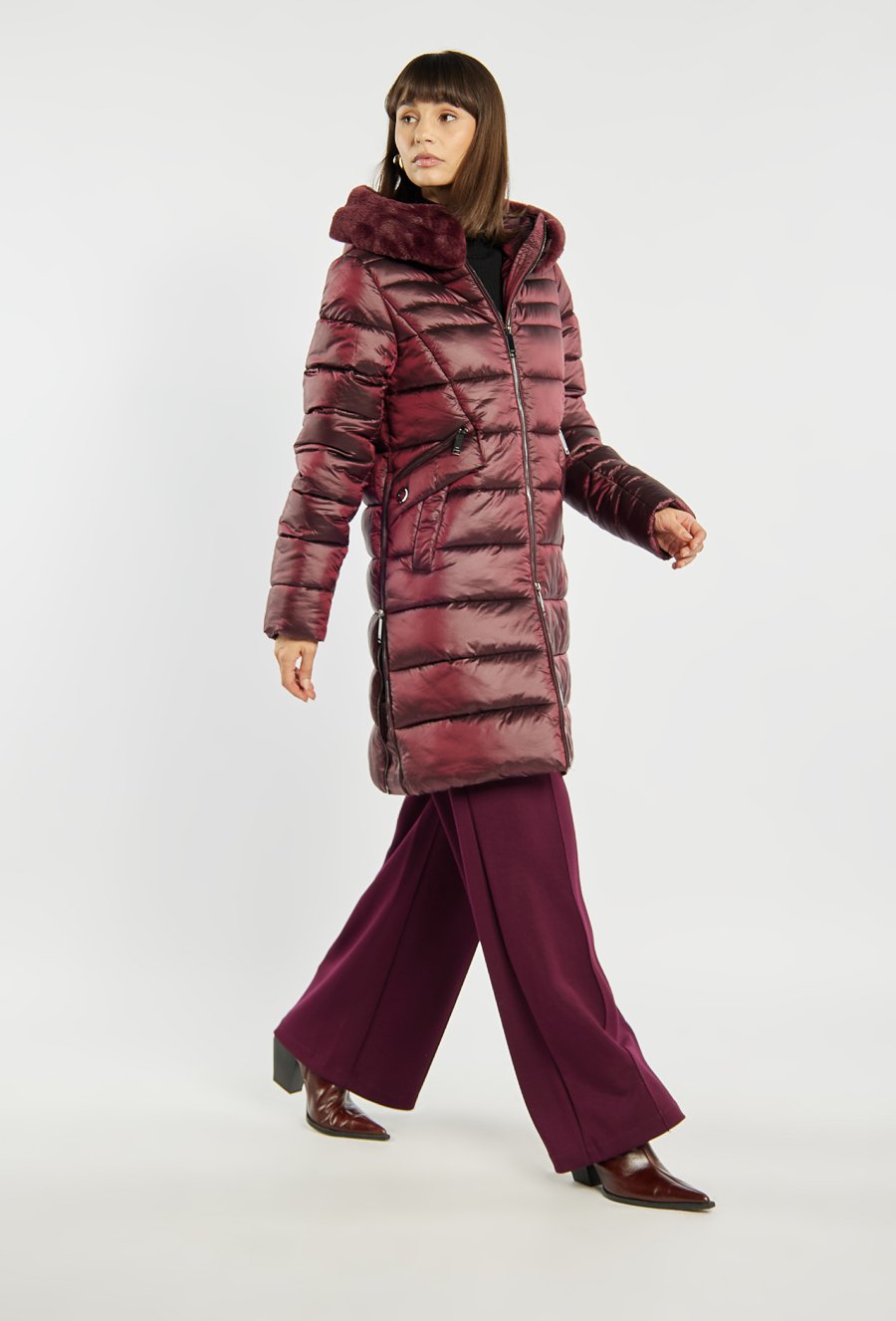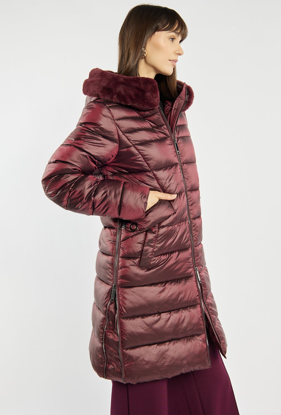 Płaszcz damski z pikowaniem, idealny na chłodniejsze dni. Model z długimi rękawami i praktycznym kapturem wykończonym futerkiem, które można odpiąć w zależności od potrzeb. Po bokach znajdują się ozdobne suwaki dodające całości nowoczesnego charakteru. Funkcjonalne kieszenie podkreślają wygodę i praktyczność tego modelu. Modelka na zdjęciu ma 177 cm wzrostu i prezentuje rozmiar 36.