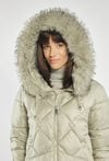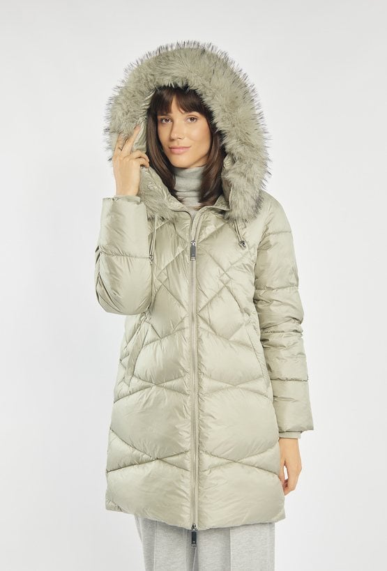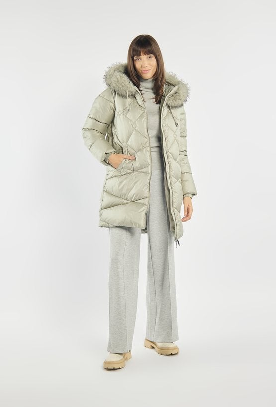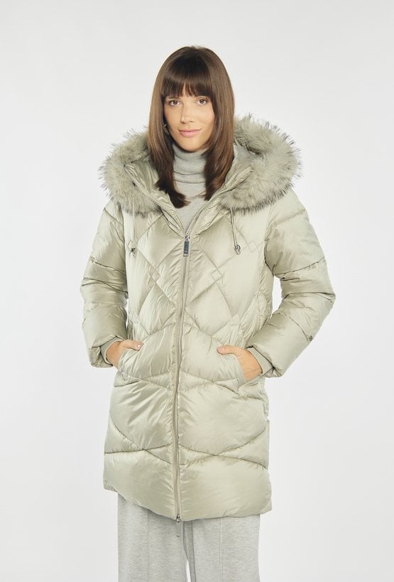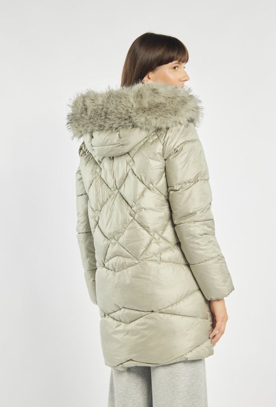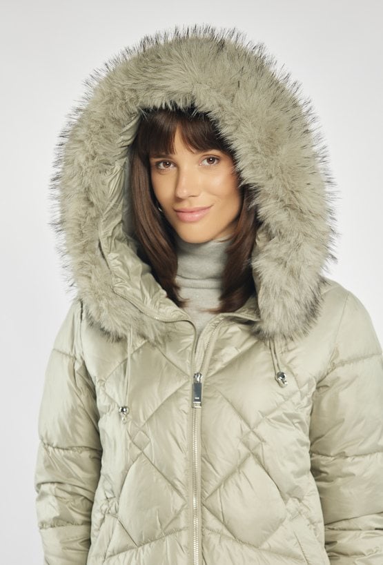Pikowany płaszcz damski to doskonała propozycja na chłodniejsze dni. Płaszcz o długości za biodra zapinany jest na zamek i wyposażony w obszerny kaptur z odpinanym futerkiem, który nie tylko chroni przed zimnem, ale i dodaje całości stylowego akcentu. Modelka na zdjęciu ma 177 cm wzrostu i prezentuje rozmiar 36.