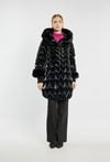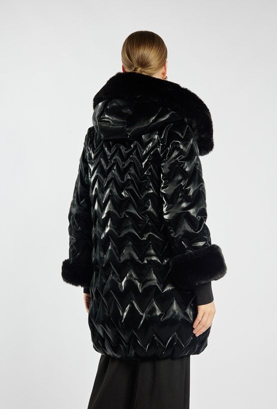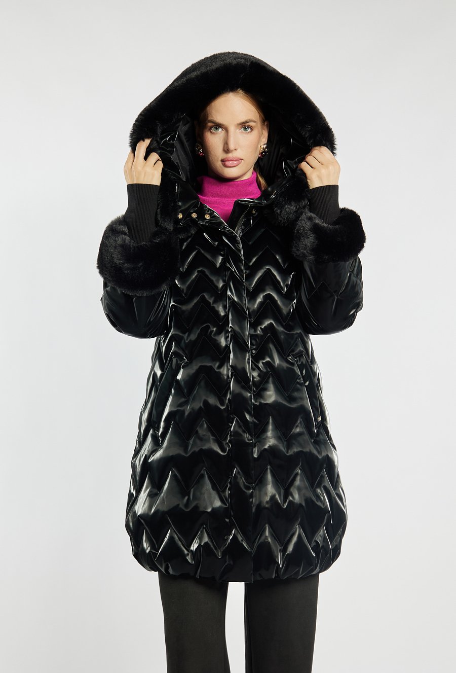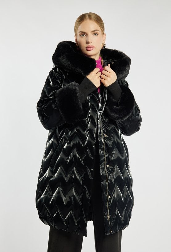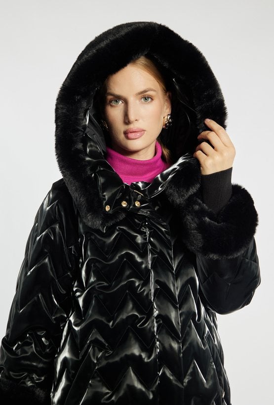 Pikowany płaszcz damski z delikatnym połyskiem. Charakterystyczny wzór przeszyć w jodełkę nadaje mu nowoczesnego wyglądu, a odpinane futerka przy kapturze i mankietach pozwalają na łatwą zmianę charakteru stylizacji. Model posiada praktyczne kieszenie zapinane na napy oraz ściągacz na dole. Modelka na zdjęciu ma 177 cm wzrostu i prezentuje rozmiar 36.