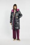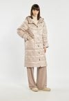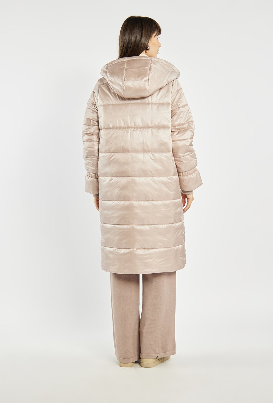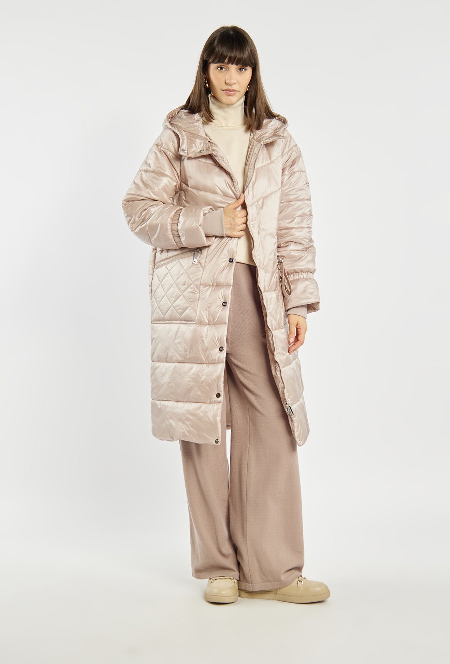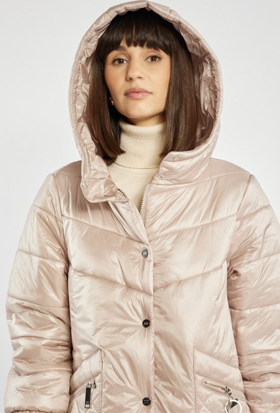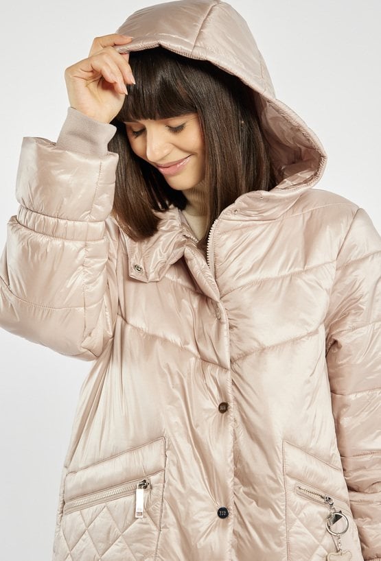 Płaszcz damski z pikowaniem, zapinany na suwak i wyposażony w praktyczny kaptur. Model ma wygodne kieszenie, a przy jednej z nich ozdobną zawieszkę w kształcie misia, dodającą całości oryginalności. To ciepły i stylowy wybór idealny na chłodniejsze dni.