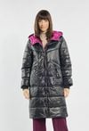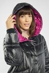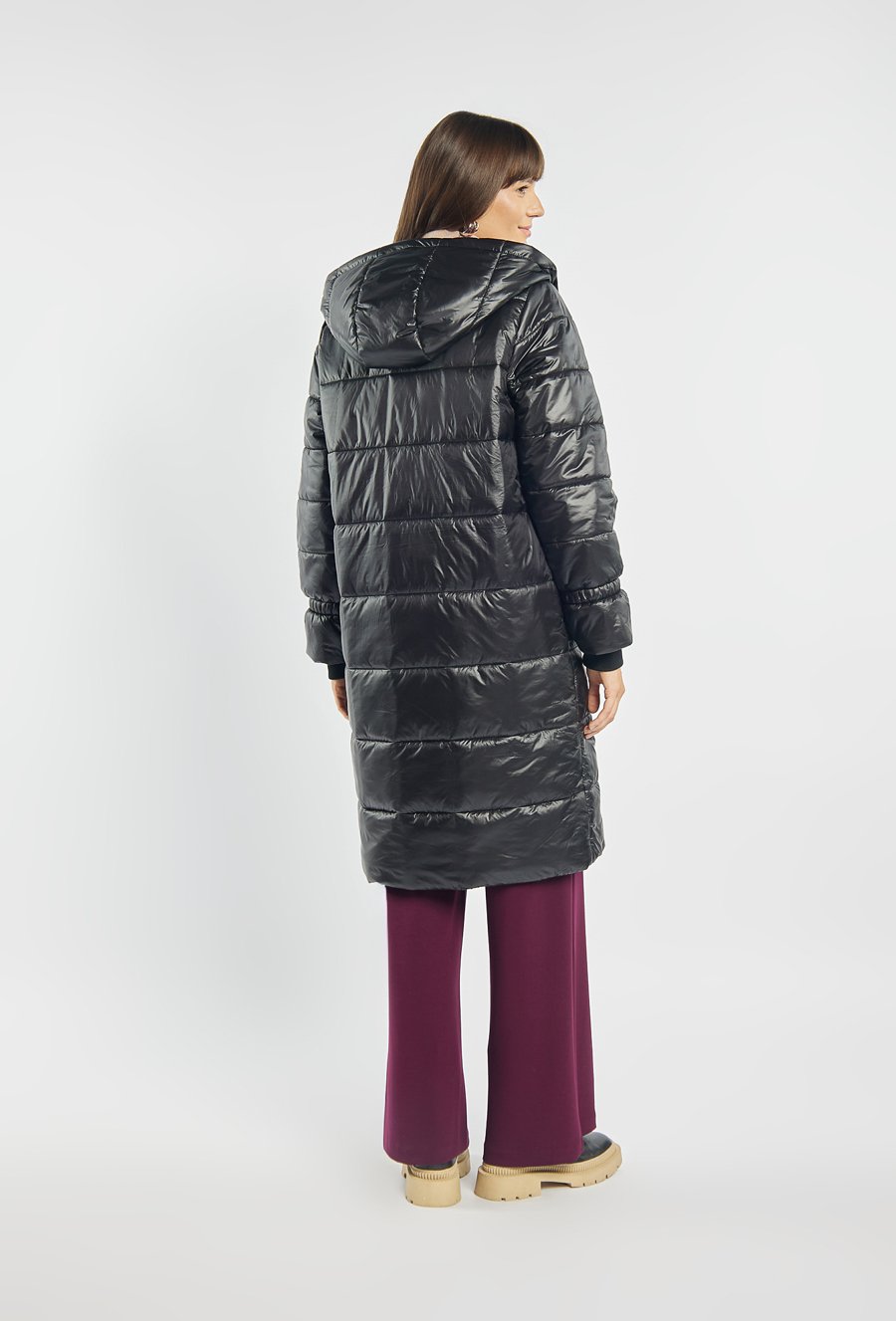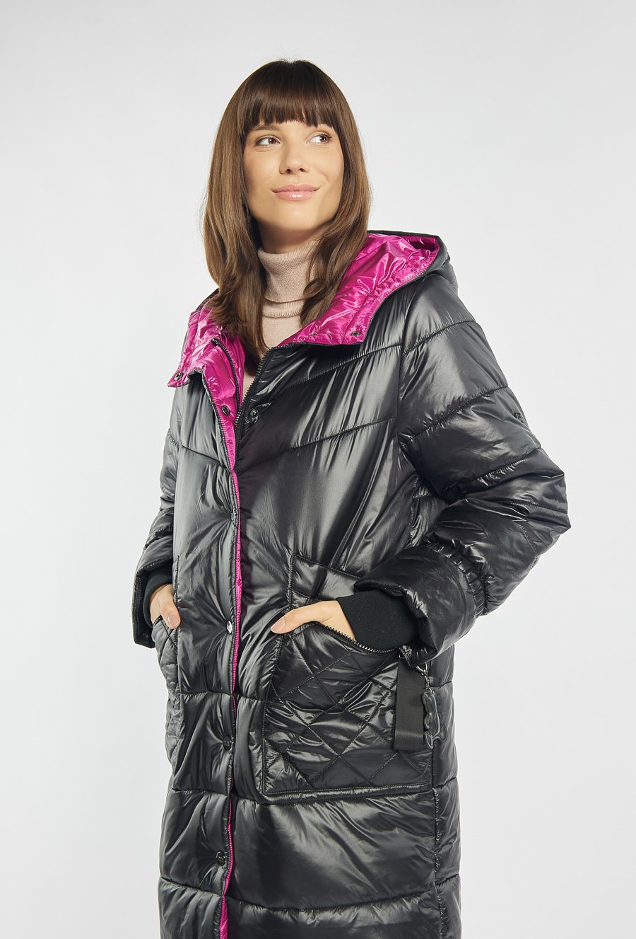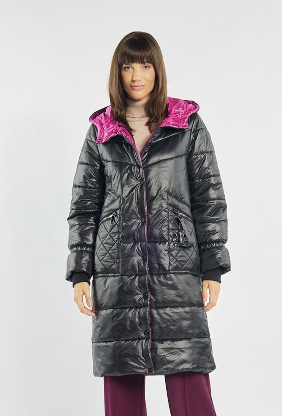 Płaszcz damski z pikowaniem, zapinany na suwak i wyposażony w praktyczny kaptur. Model ma wygodne kieszenie, a przy jednej z nich ozdobną zawieszkę w kształcie misia, dodającą całości oryginalności. To ciepły i stylowy wybór idealny na chłodniejsze dni.