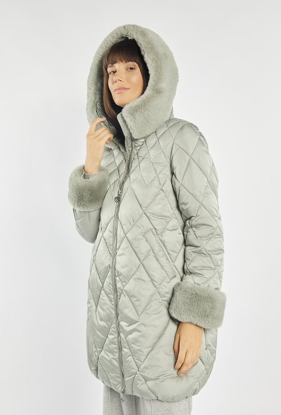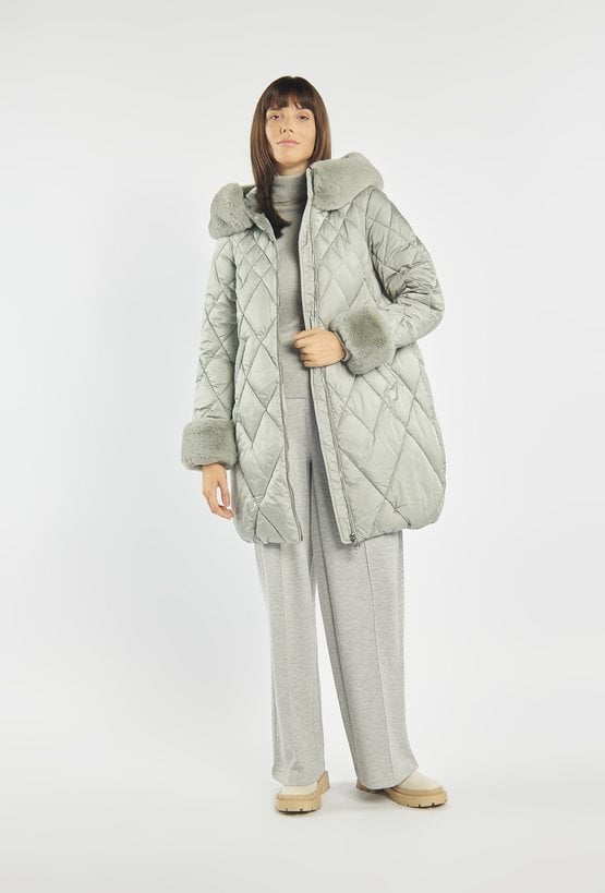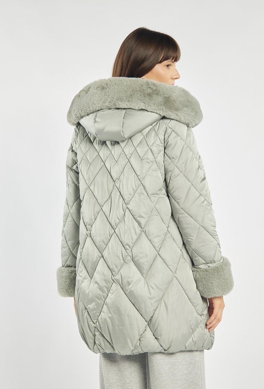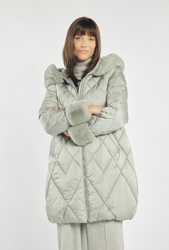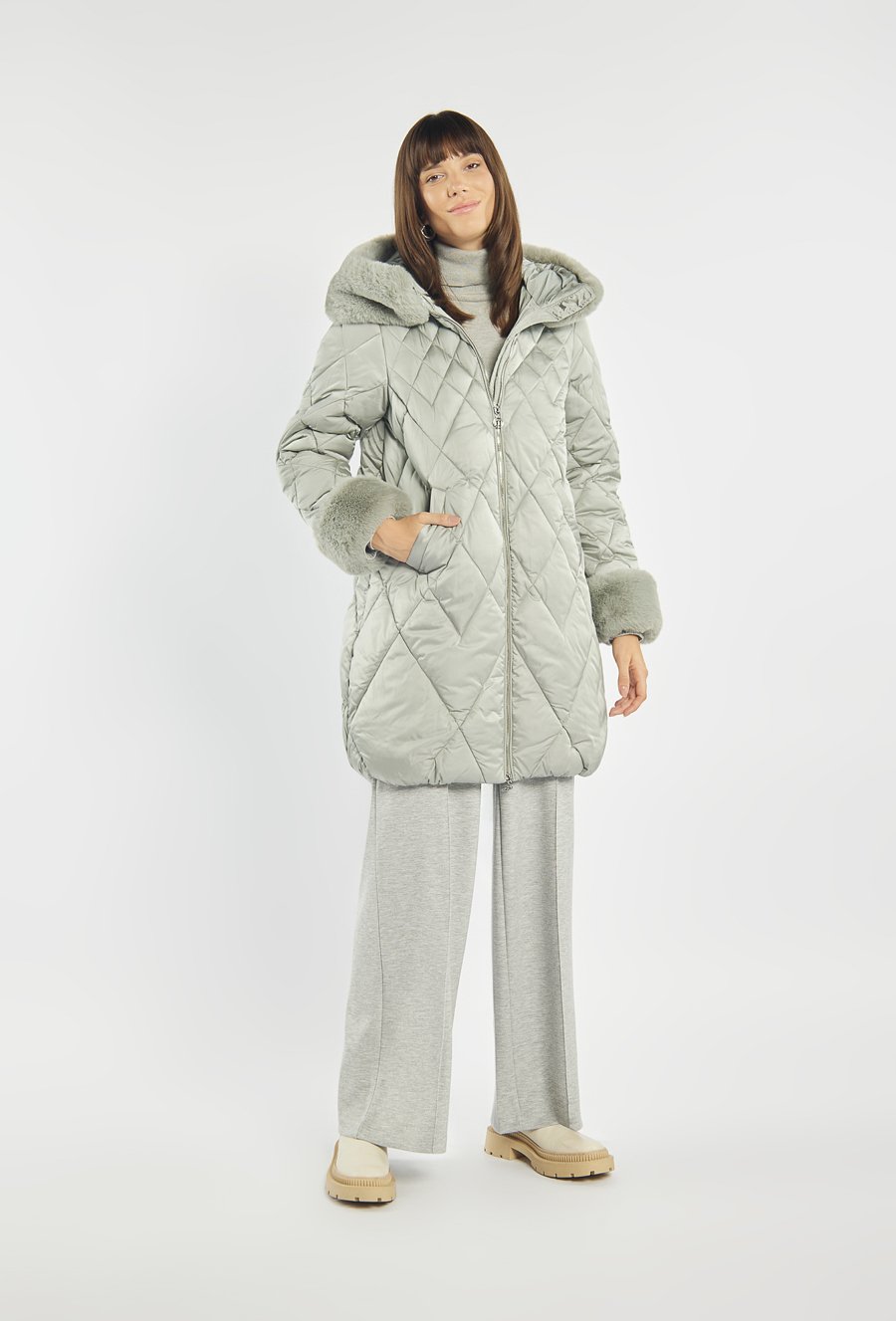 Pikowany płaszcz o długości za biodro, stworzony z myślą o stylowych i ciepłych zimowych stylizacjach. Ozdobne futerko przy kapturze i mankietach można w razie potrzeby odpiąć, co pozwala dostosować styl płaszcza do okazji i pogody. Modelka na zdjęciu ma 177 cm wzrostu i prezentuje rozmiar 36.