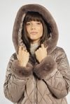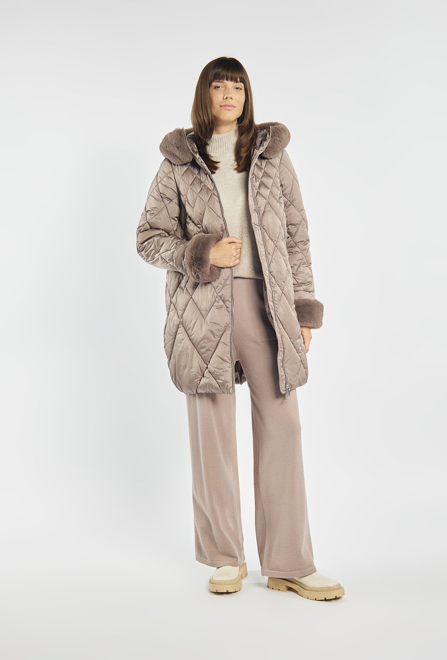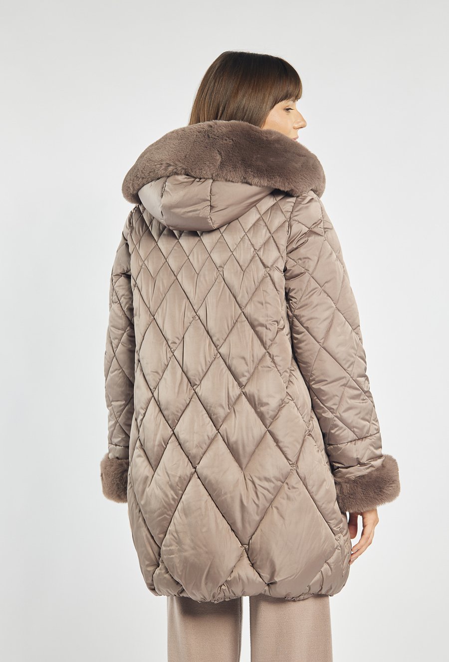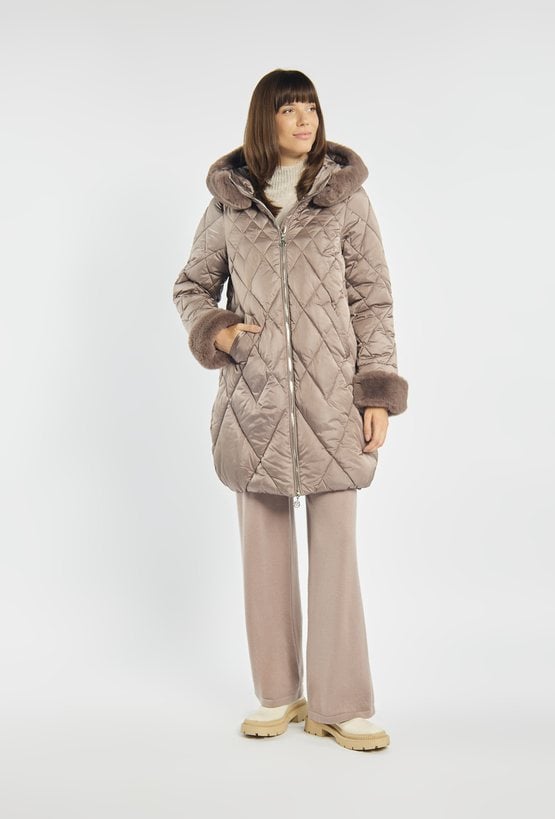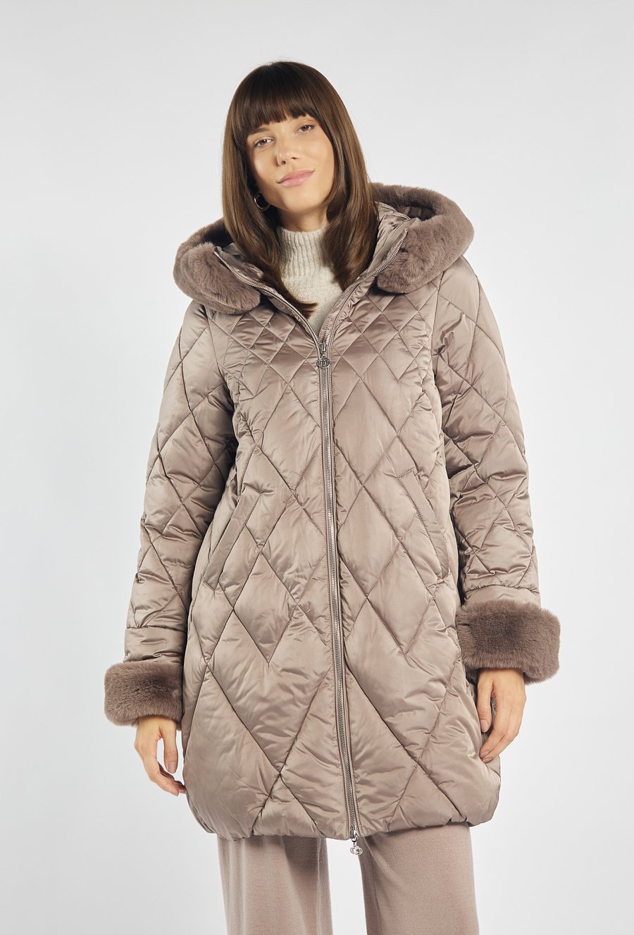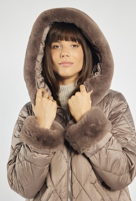 Pikowany płaszcz o długości za biodro, stworzony z myślą o stylowych i ciepłych zimowych stylizacjach. Ozdobne futerko przy kapturze i mankietach można w razie potrzeby odpiąć, co pozwala dostosować styl płaszcza do okazji i pogody. Modelka na zdjęciu ma 177 cm wzrostu i prezentuje rozmiar 36.