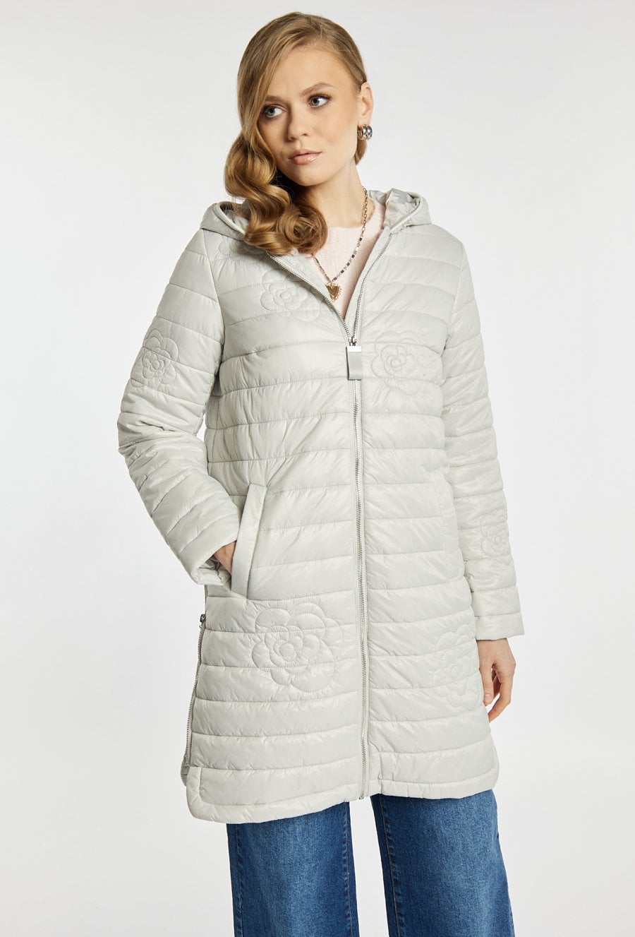 Płaszcz o lekkim, pikowanym fasonie, idealny na wiosenne dni. Model zapinany na zamek, z delikatnym kwiatowym pikowaniem, które dodaje całości subtelnej elegancji. Płaszcz ma praktyczne suwaki po bokach, pozwalające regulować swobodę ruchów. Sprawdzi się zarówno w codziennych stylizacjach, jak i w bardziej eleganckim wydaniu. Modelka na zdjęciu ma 177 cm wzrostu i prezentuje rozmiar 36.