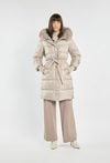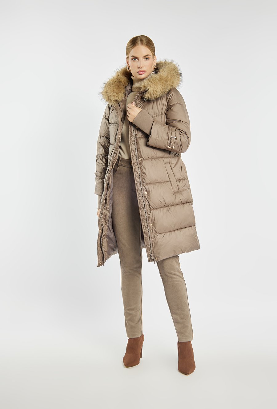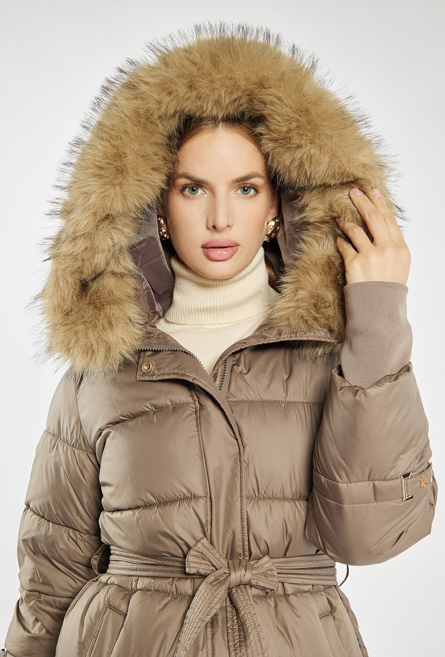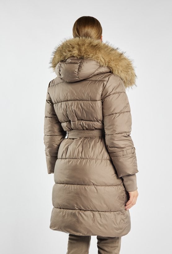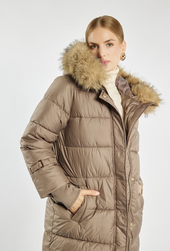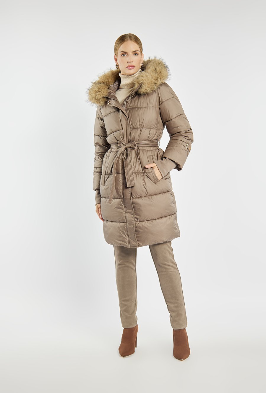 Elegancki płaszcz o klasycznym kroju, wiązany w pasie paskiem. Model z praktycznym kapturem, wykończonym efektownym futerkiem, które można odpiąć. Idealny na chłodniejsze dni. Modelka na zdjęciu ma 177 cm wzrostu i prezentuje rozmiar 36.