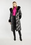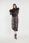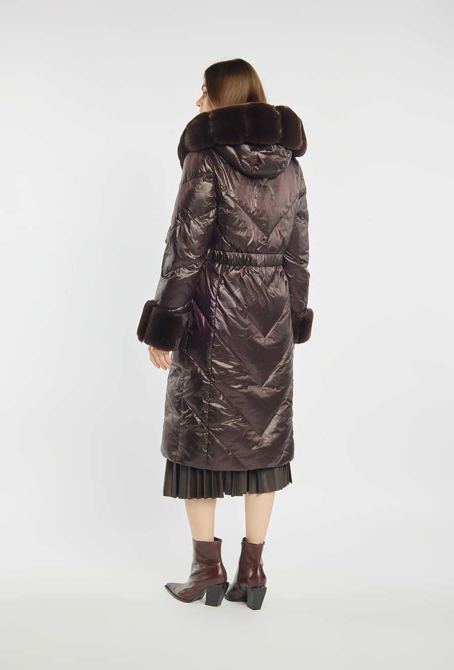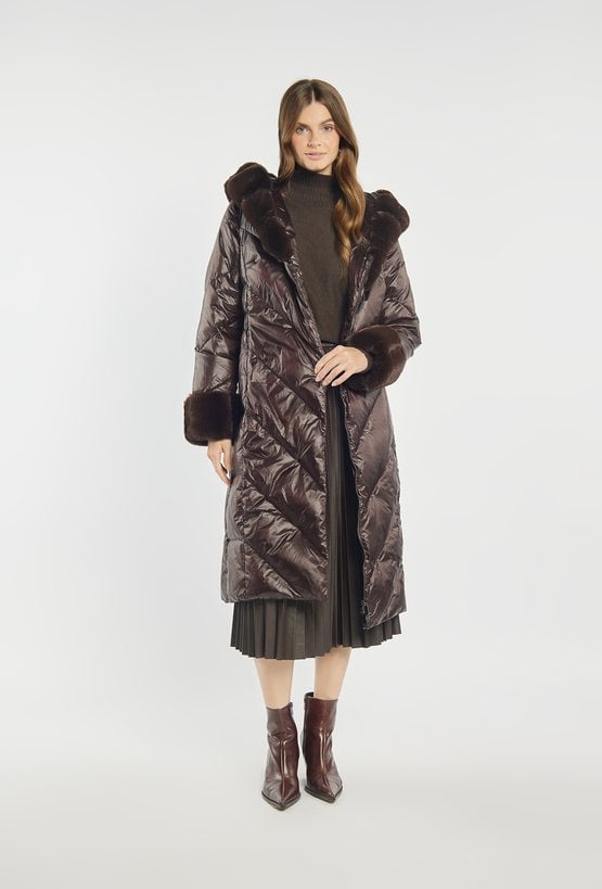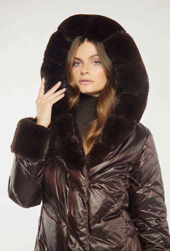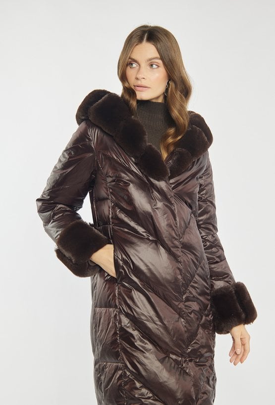 Pikowany płaszcz puchowy. Długość midi zapewnia komfort i ochronę przed chłodem, a jednocześnie nadaje stylowego charakteru. Płaszcz wykończony futerkiem przy kapturze oraz rękawach, które można odpiąć. Idealny wybór na zimowe dni, łączący funkcjonalność z szykiem. Modelka na zdjęciu ma 177 cm wzrostu i prezentuje rozmiar 36.