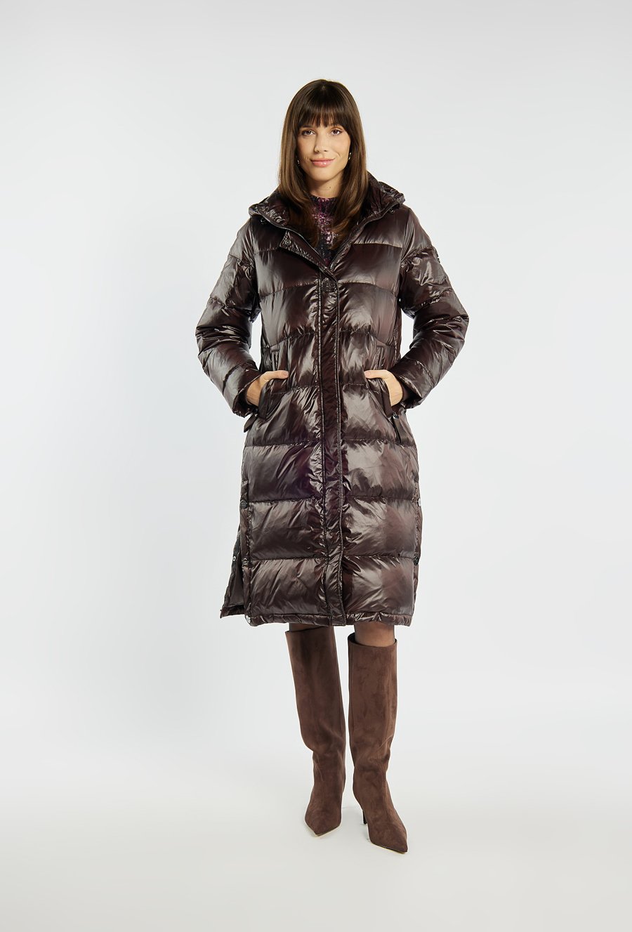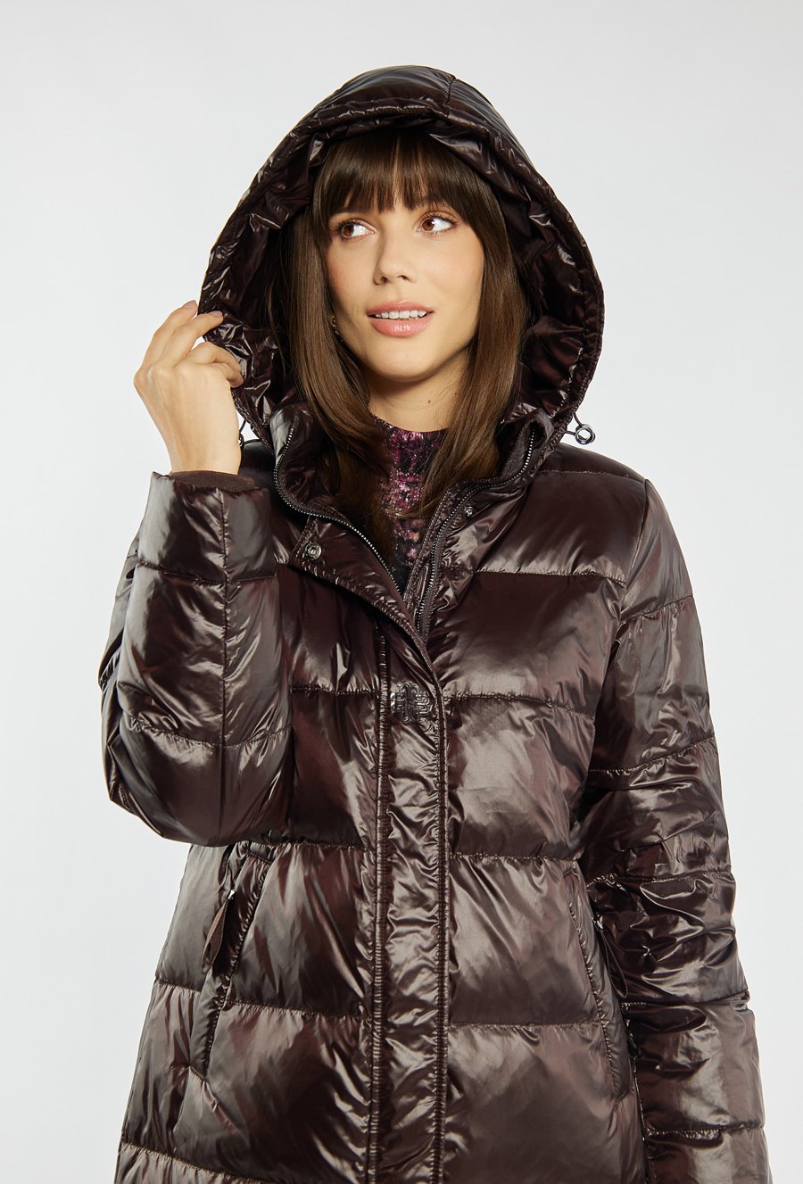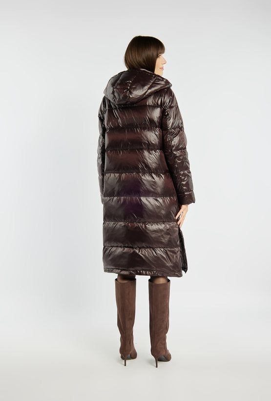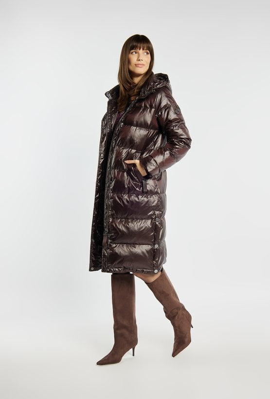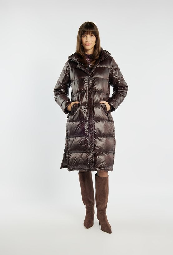 Pikowany płaszcz o długości midi, zapinany na suwak i napy. Kaptur odpinany, praktyczne kieszenie po bokach, rozpinane boki dodające funkcjonalności i swobody ruchów. Idealny na chłodniejsze dni, łączy wygodę z nowoczesnym stylem. Modelka na zdjęciu ma 177 cm wzrostu i prezentuje rozmiar 36.