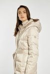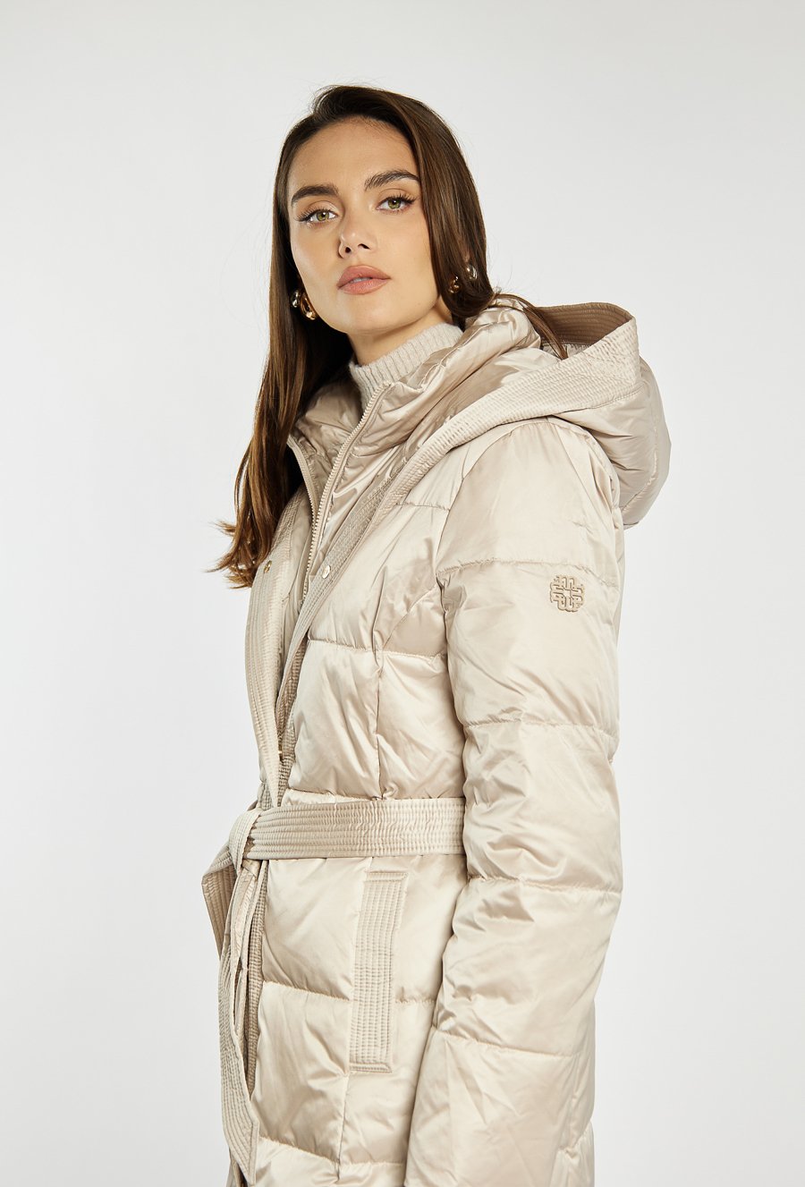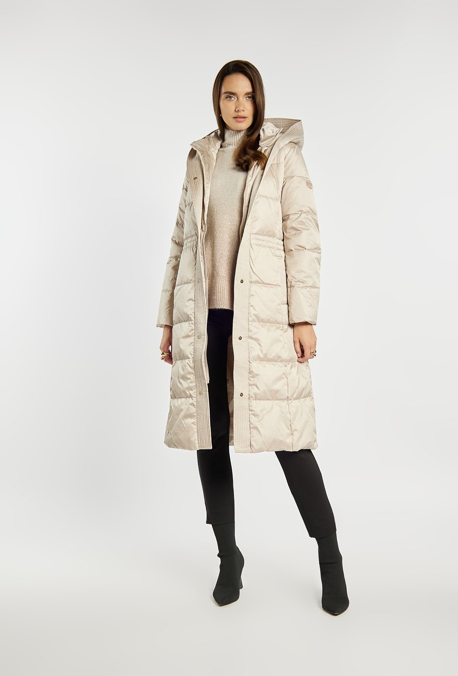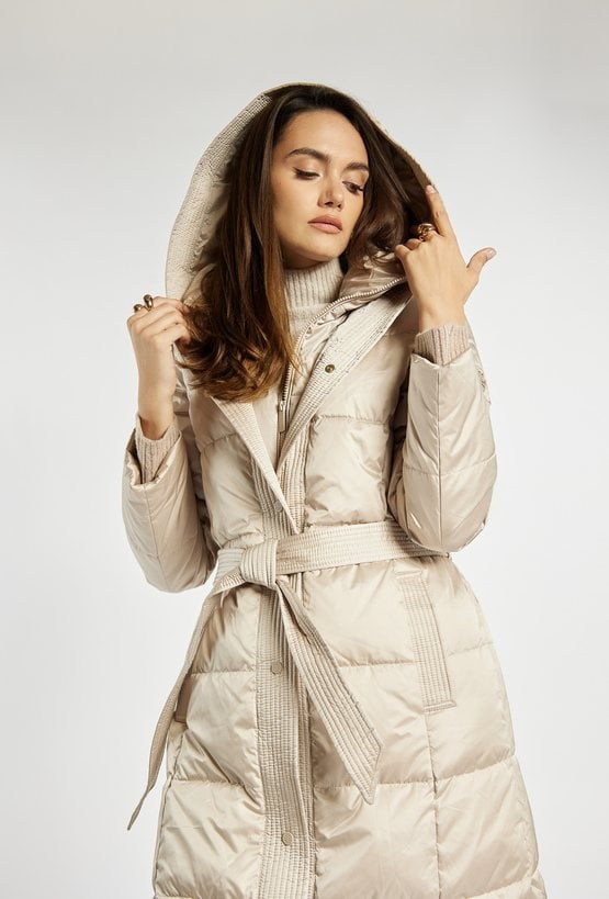 Płaszcz puchowy w eleganckim, wydłużonym fasonie to niezawodna propozycja na chłodniejsze dni. Pikowany płaszcz z kapturem, zapinany na suwak i napy, wyposażono w pasek podkreślający talię oraz praktyczne kieszenie. Modelka na zdjęciu ma 177 cm wzrostu i prezentuje rozmiar 36