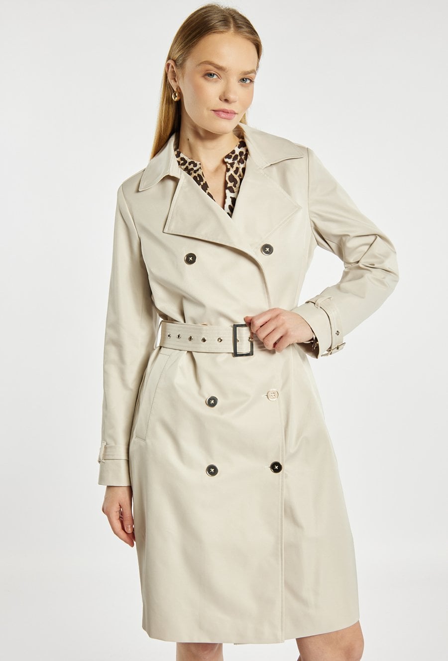 Klasyczny płaszcz typu trencz o eleganckim, ponadczasowym kroju. Model dwurzędowy, z charakterystycznymi guzikami i wiązanym paskiem w talii, który ładnie podkreśla sylwetkę. Płaszcz ma klasyczne klapy, długie rękawy z regulowanymi patkami oraz długość do kolan, dzięki czemu jest bardzo uniwersalny. Doskonały wybór na wiosnę i jesień. Modelka na zdjęciu ma 177 cm wzrostu i prezentuje rozmiar 36.
