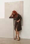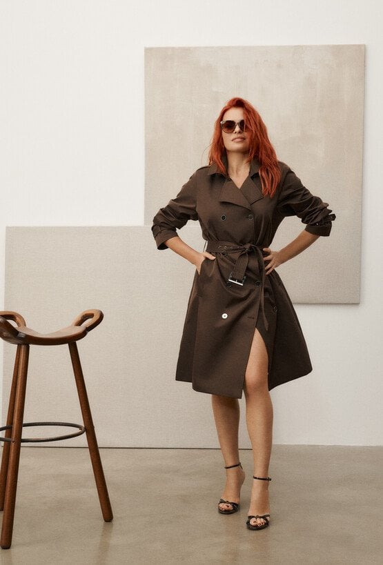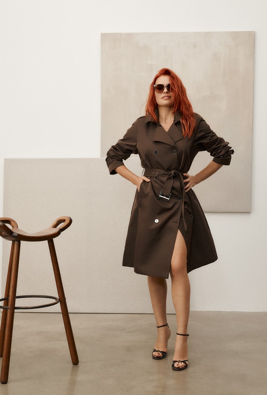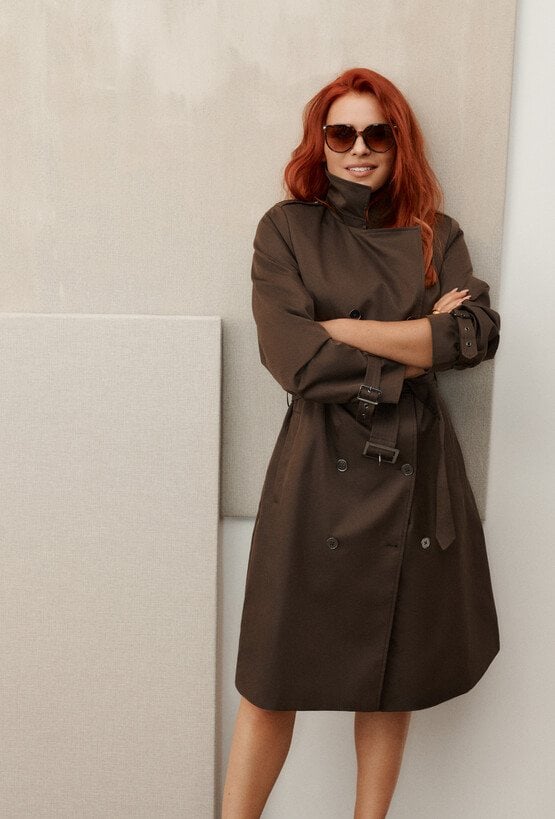 Klasyczny płaszcz typu trencz o eleganckim, ponadczasowym kroju. Model dwurzędowy, z charakterystycznymi guzikami i wiązanym paskiem w talii, który ładnie podkreśla sylwetkę. Płaszcz ma klasyczne klapy, długie rękawy z regulowanymi patkami oraz długość do kolan, dzięki czemu jest bardzo uniwersalny. Doskonały wybór na wiosnę i jesień. Modelka na zdjęciu ma 177 cm wzrostu i prezentuje rozmiar 36.