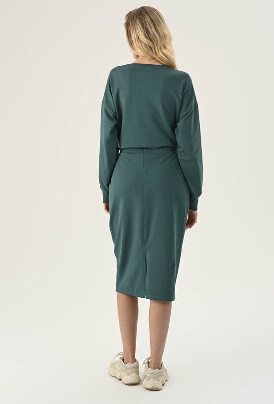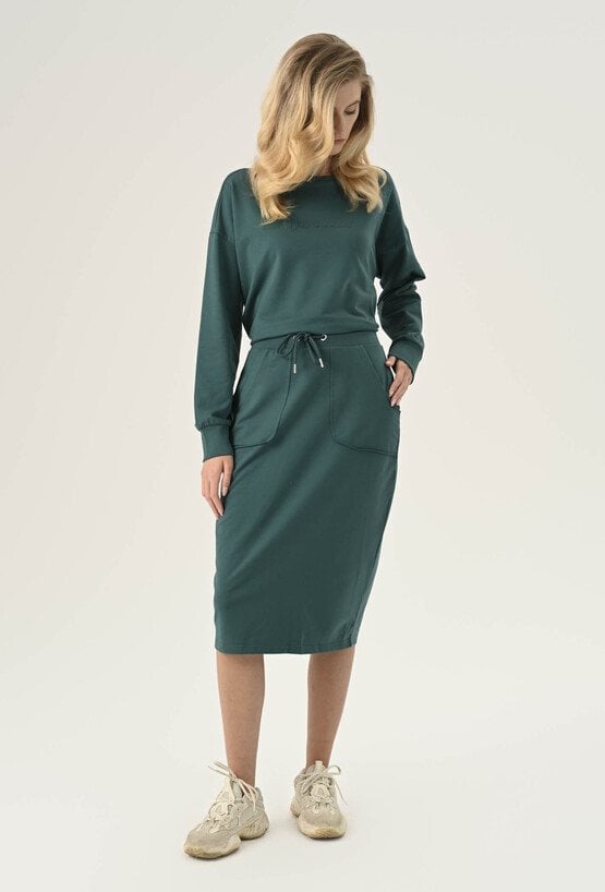 Bawełniana, wygodna spódnica midi to idealna propozycja dla kobiet ceniących sobie wygodę i styl. Elastyczna guma w pasie gwarantuje idealne dopasowanie do Twojej sylwetki, a kieszenie dodają funkcjonalności. Wykonana z przyjemnej, bawełnianej dzianiny zapewni Ci komfort noszenia przez cały dzień, a surowe wykończenie nadaje modowego charakteru. Spódnica świetnie sprawdzi się w codziennych stylizacjach. Modelka na zdjęciu ma 177 cm wzrostu i prezentuje rozmiar 36.