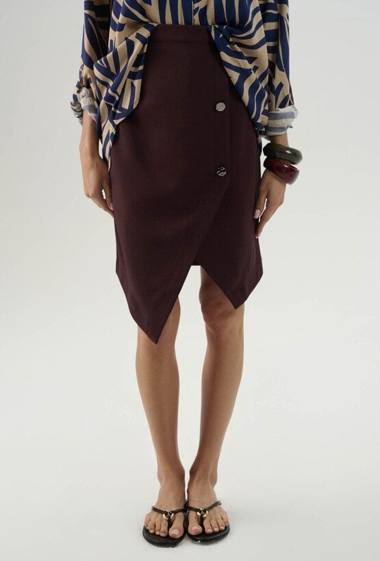 Stylowa i kobieca spódnica przed kolano. Asymetryczny przód z ozdobnymi guzikami nadaje całości nowoczesnego charakteru, a kryty zamek z tyłu zapewnia wygodne zakładanie i idealne dopasowanie. Świetnie komponuje się zarówno z elegancką koszulą, jak i casualowym T-shirtem — must-have w Twojej szafie! Modelka na zdjęciu ma 177 cm wzrostu i prezentuje rozmiar 36.