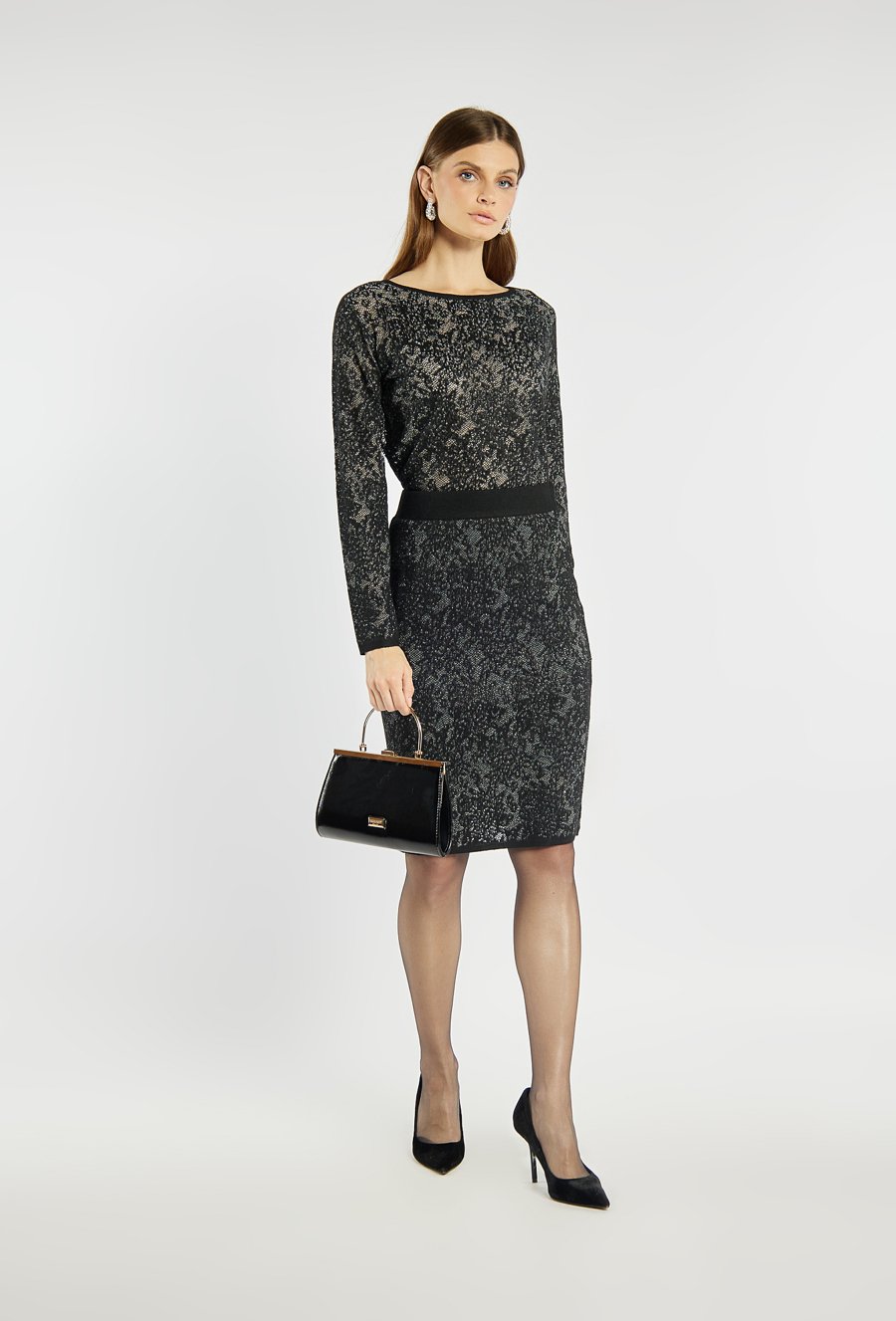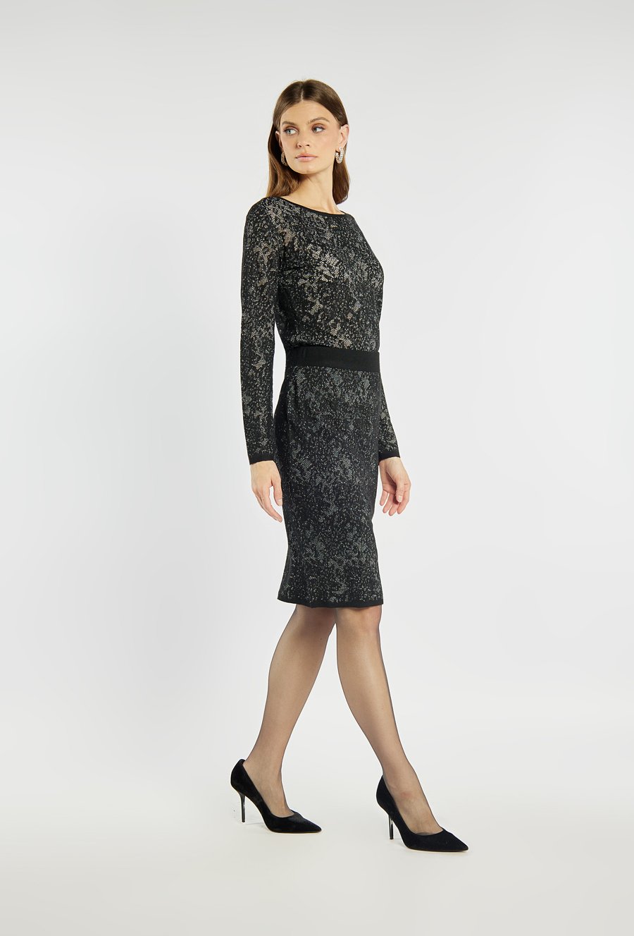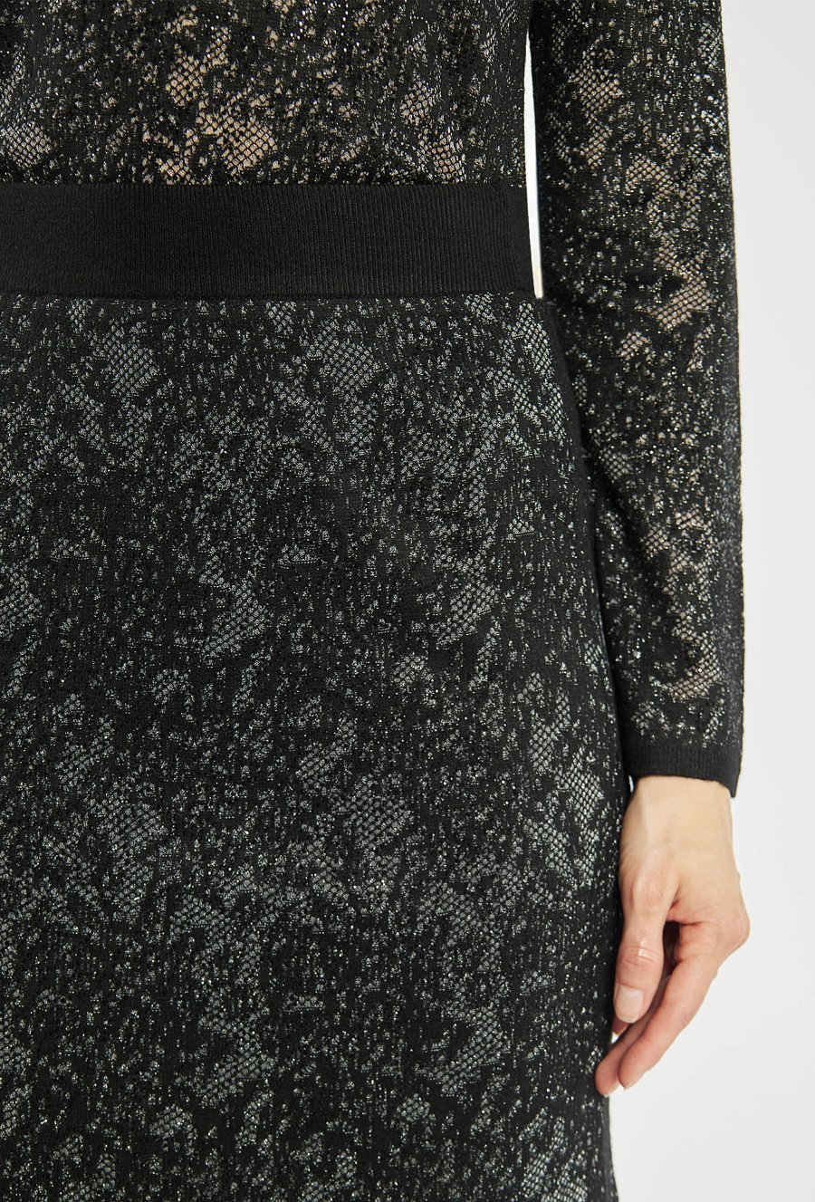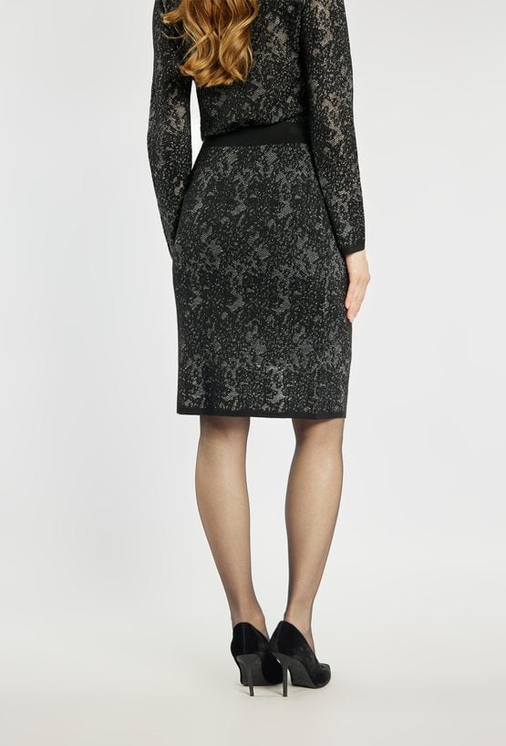 Elegancka spódnica o ołówkowym kroju, wykonana z tkaniny z subtelnym połyskiem, która pięknie dopasowuje się do sylwetki. Elastyczny pas zapewnia wygodę, a delikatny wzór dodaje całości wyjątkowego charakteru. Doskonała na święta, sylwestra czy inne uroczyste okazje. Można ją zestawić z pasującą górą. Kod do swetra 25Z-SWE2640. Modelka na zdjęciu ma 177 cm wzrostu i prezentuje rozmiar 36.
