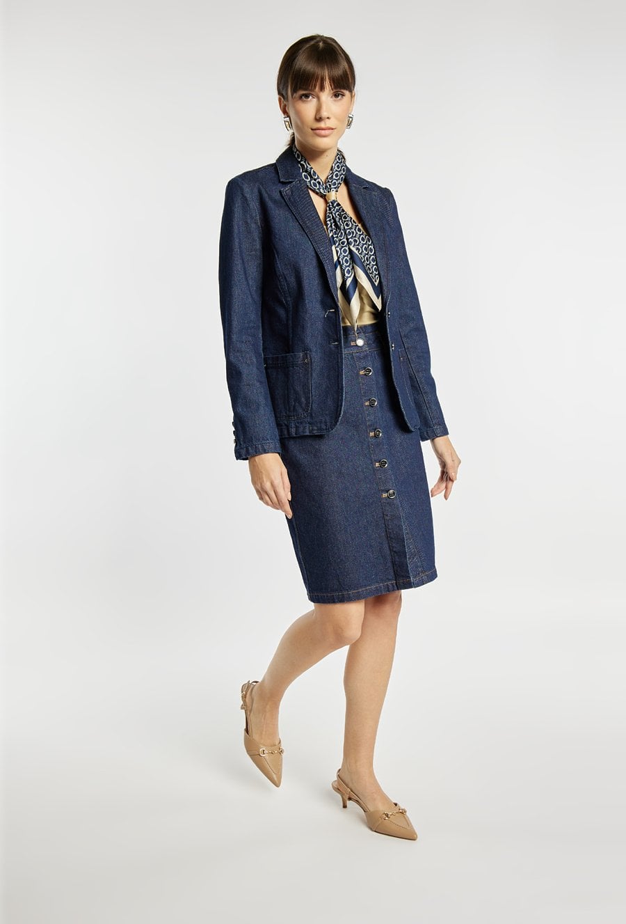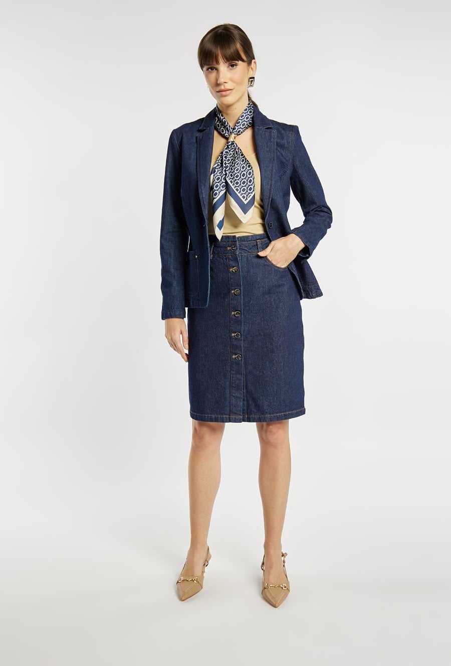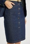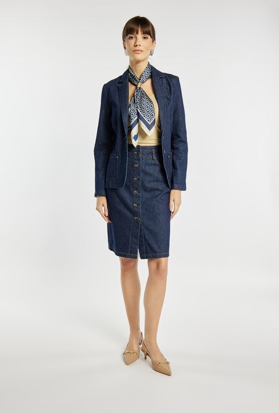 Spódnica damska wykonana z klasycznego denimu. Spódnica o prostym kroju zapinana na guziki z przodu to ponadczasowy model, który świetnie sprawdzi się na co dzień. Uniwersalna długość i fason ułatwiają tworzenie wielu stylizacji. Modelka na zdjęciu ma 177 cm wzrostu i prezentuje rozmiar 36.