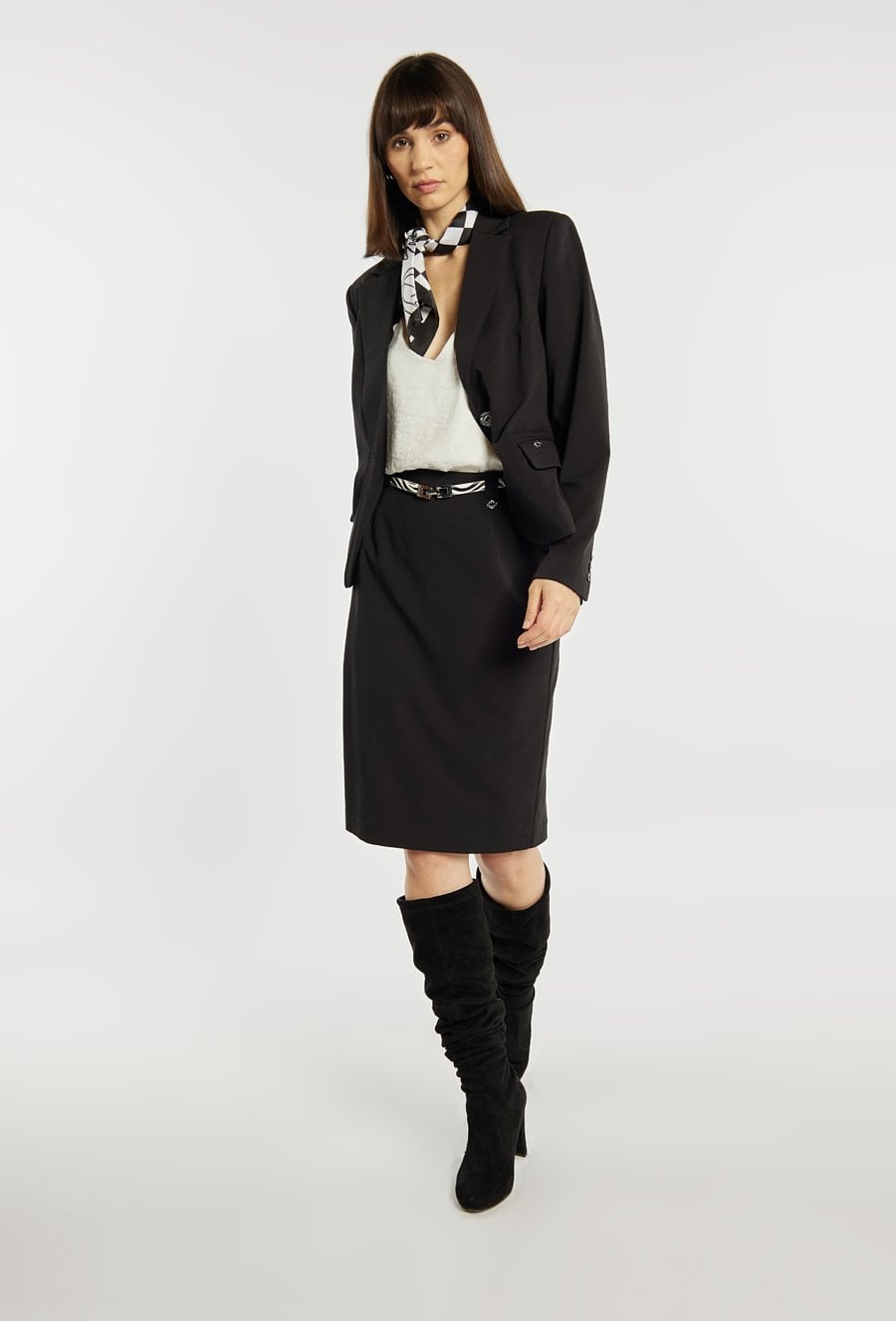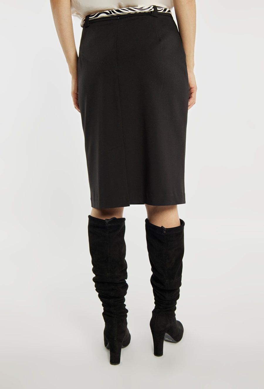 Spódnica ołówkowa o klasycznej długości do kolan subtelnie podkreśla sylwetkę, a tylne zapięcie na kryty suwak zapewnia estetyczne wykończenie. Model doskonały do stylizacji biznesowych – świetnie komponuje się z dopasowaną marynarką. Kod do marynarki: 26W-BZR0050. Modelka na zdjęciu ma 177 cm wzrostu i prezentuje rozmiar 36.