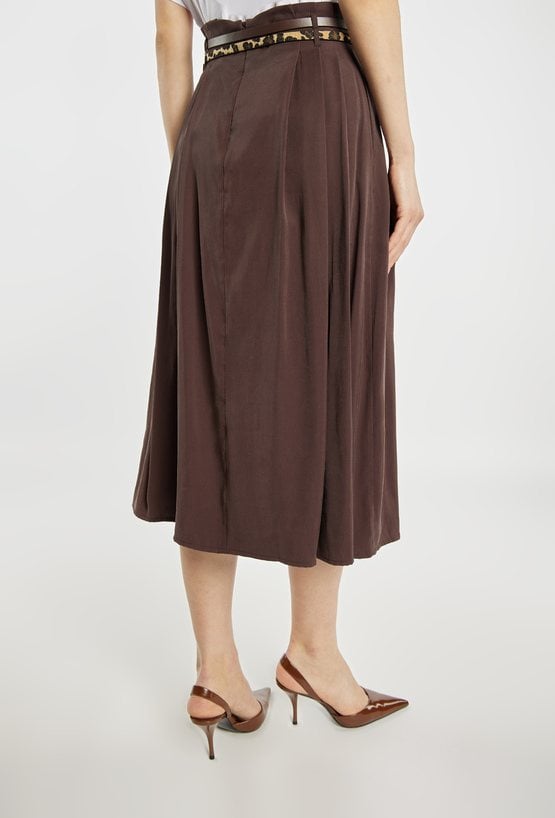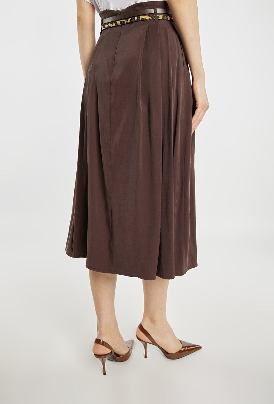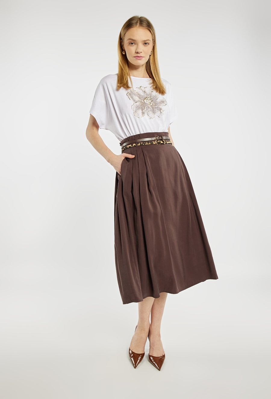 Spódnica damska o eleganckim, rozkloszowanym fasonie. Długość midi nadaje całości klasy i kobiecego charakteru. Idealna do eleganckich i półeleganckich stylizacji- doskonale komponuje się z bluzkami, koszulami oraz marynarką. Modelka na zdjęciu ma 177 cm wzrostu i prezentuje rozmiar 36.