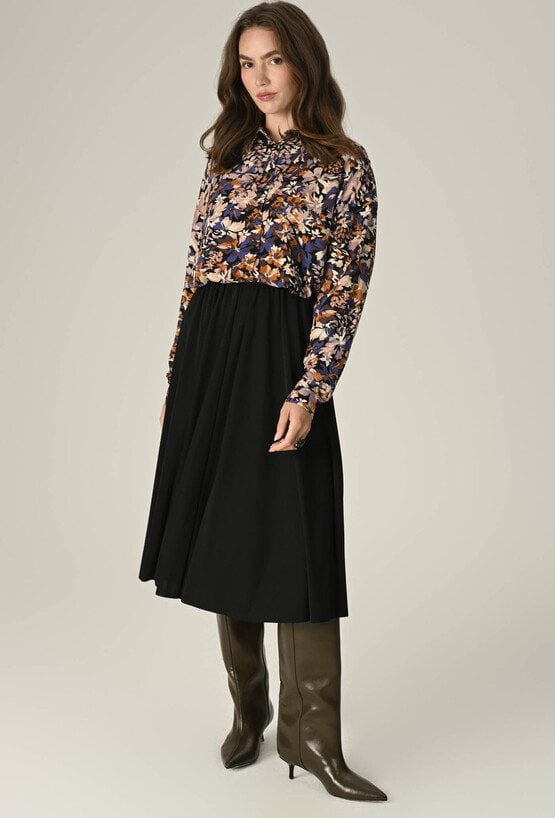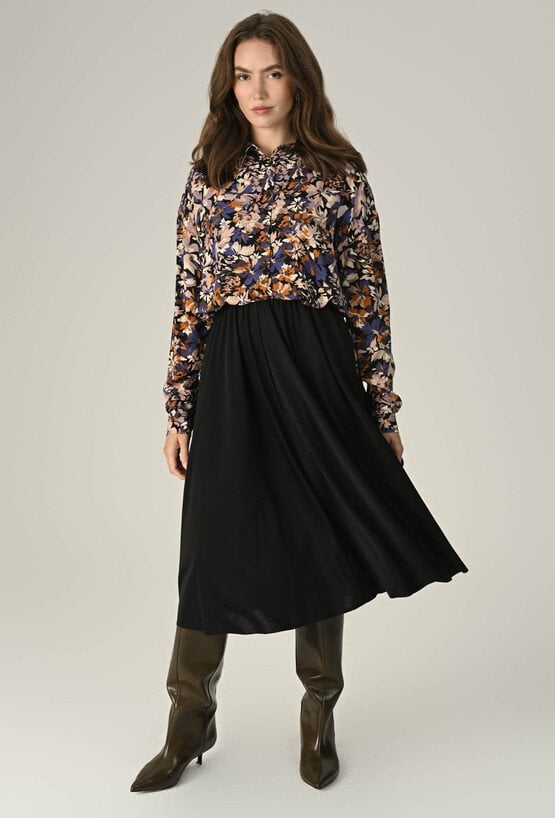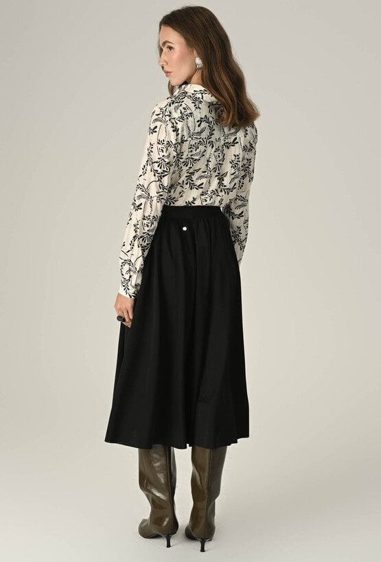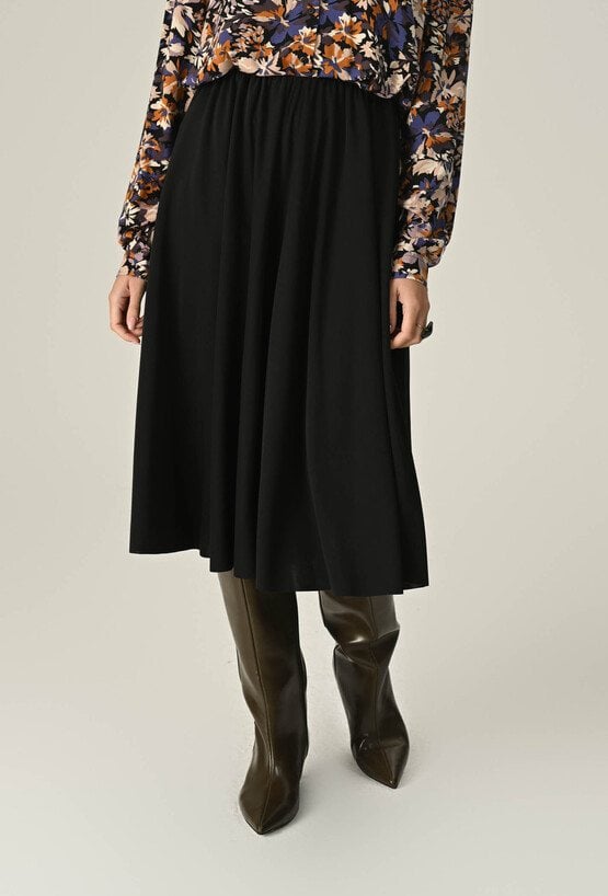 Damska spódnica z elastyczną gumą w pasie, zapewniająca komfort i idealne dopasowanie. Doskonała na codzienne stylizacje, łącząc wygodę z prostą elegancją. Modelka na zdjęciu ma 174 cm wzrostu i prezentuje rozmiar 36.