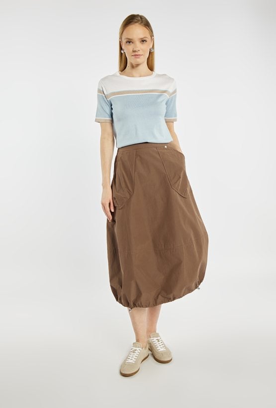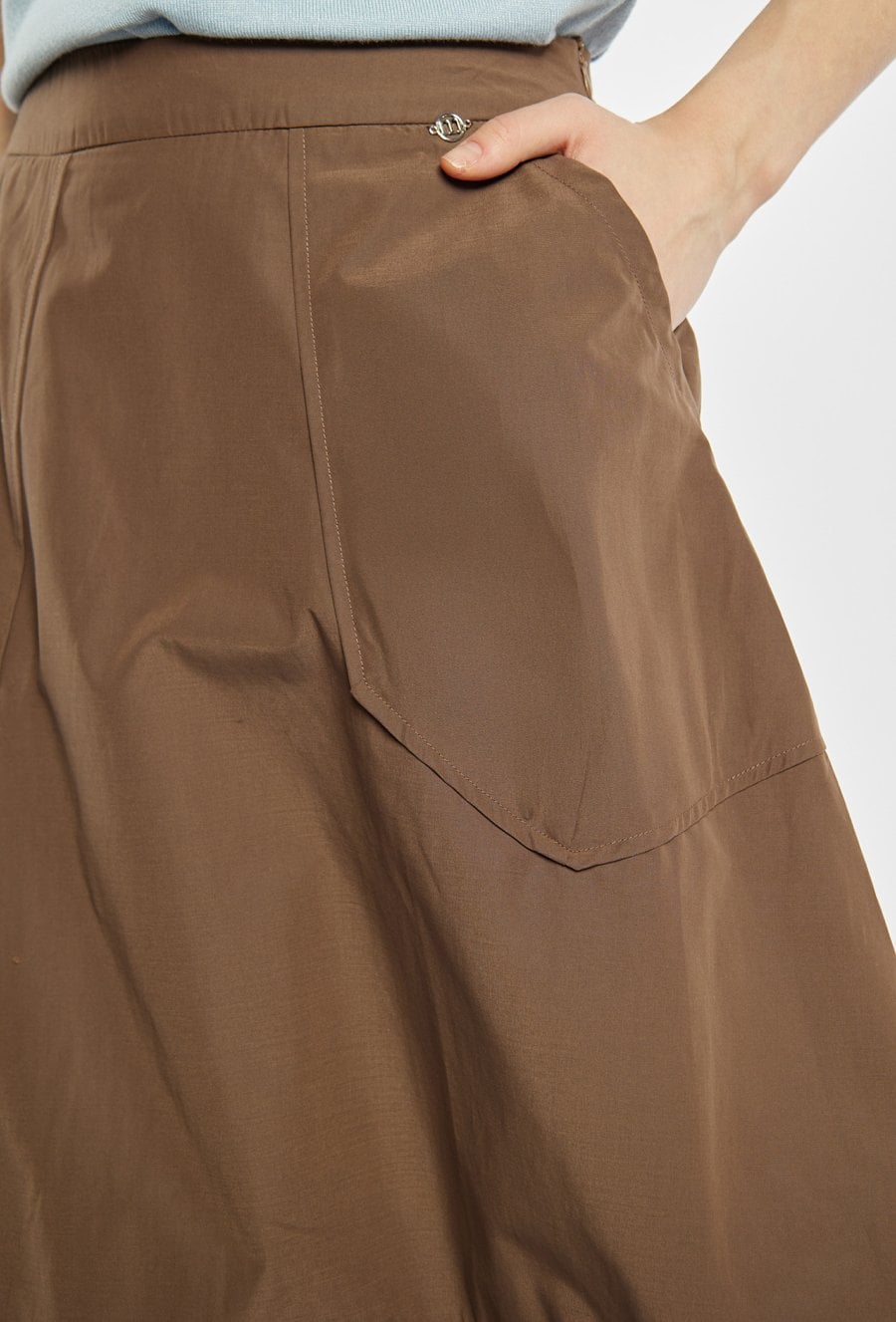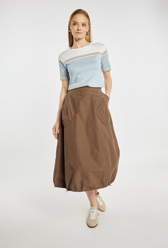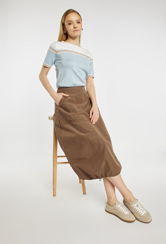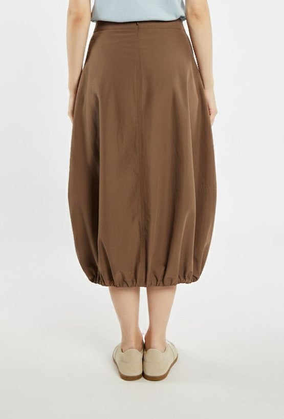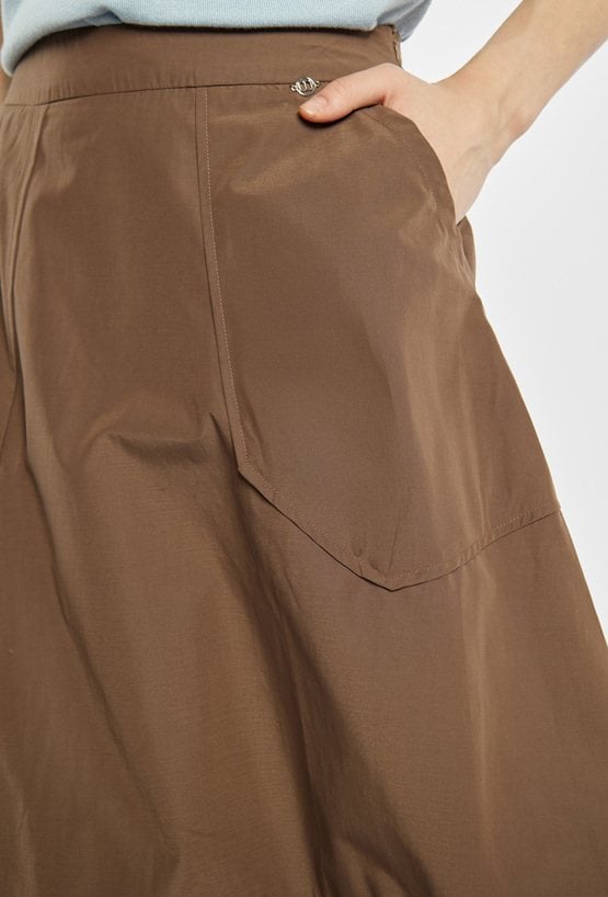 Spódnica o długości midi, o charakterystycznym, lekko balonowym kroju z delikatnie marszczonym dołem. Model z praktycznymi kieszeniami. Swobodny fason zapewnia komfort noszenia i nadaje stylizacji casualowy, nowoczesny charakter. Doskonała do codziennych zestawów, świetnie komponuje się z prostą bluzką lub sportowym obuwiem. Modelka na zdjęciu ma 177 cm wzrostu i prezentuje rozmiar 36.