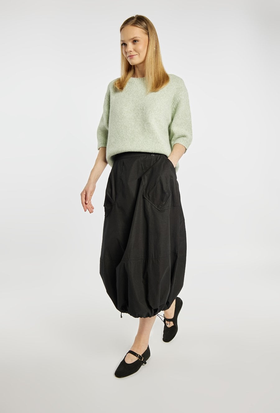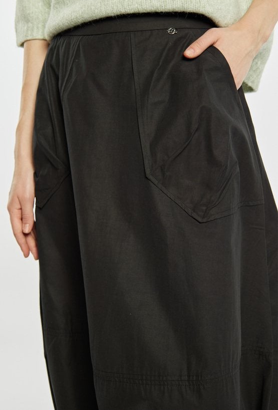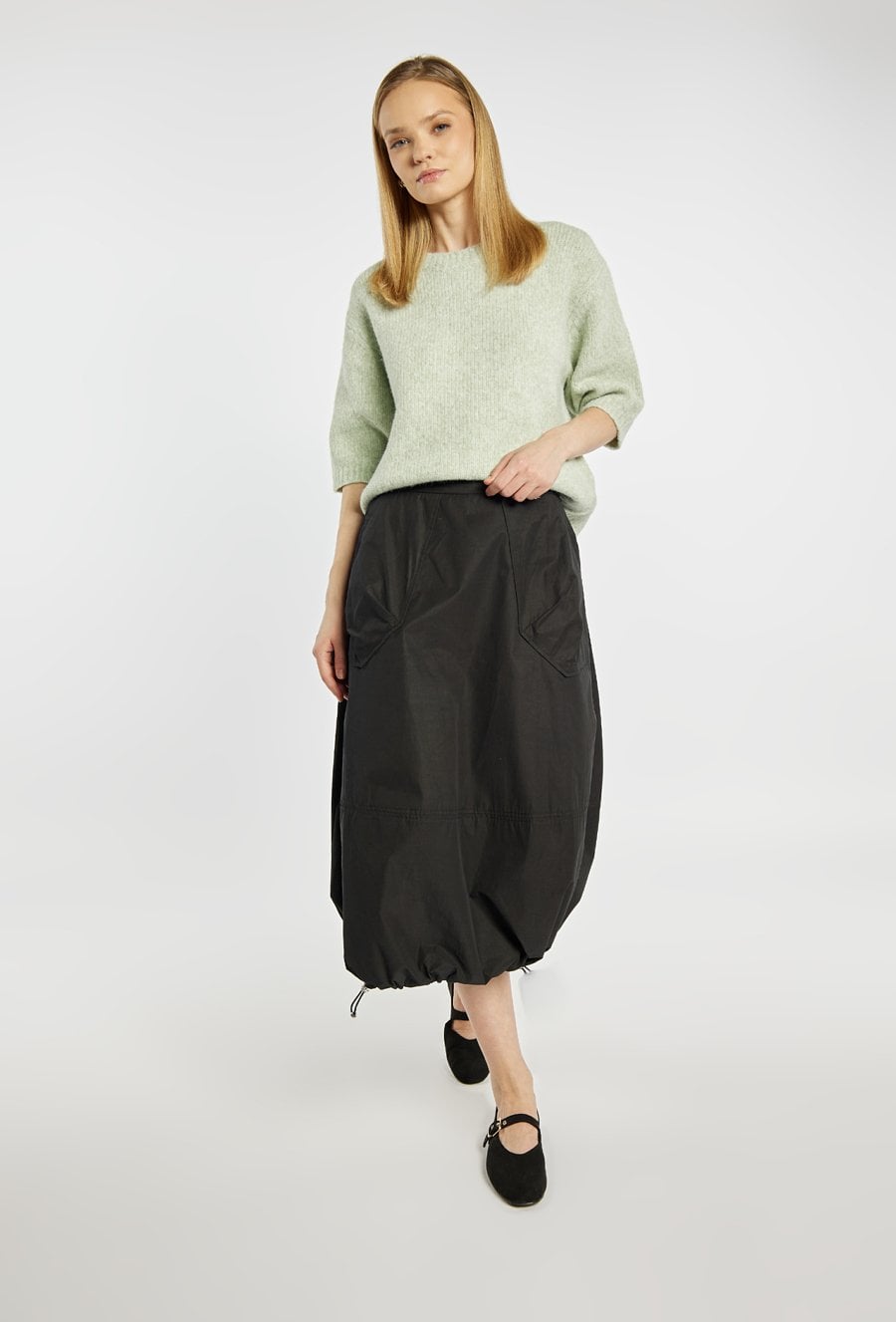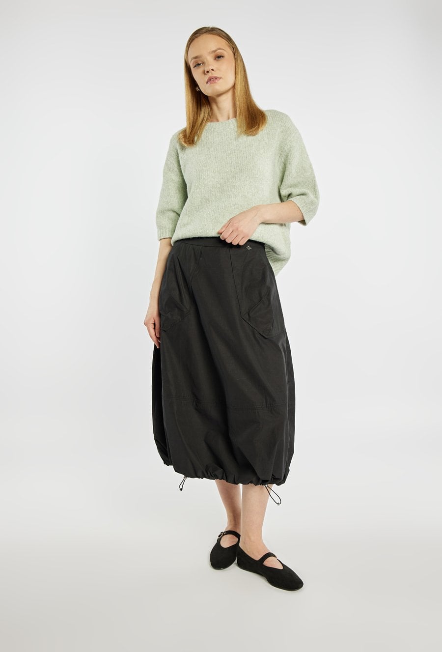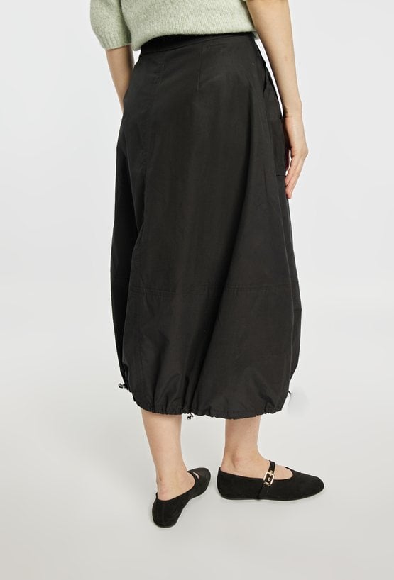 Spódnica o długości midi, o charakterystycznym, lekko balonowym kroju z delikatnie marszczonym dołem. Model z praktycznymi kieszeniami. Swobodny fason zapewnia komfort noszenia i nadaje stylizacji casualowy, nowoczesny charakter. Doskonała do codziennych zestawów, świetnie komponuje się z prostą bluzką lub sportowym obuwiem. Modelka na zdjęciu ma 177 cm wzrostu i prezentuje rozmiar 36.