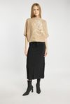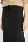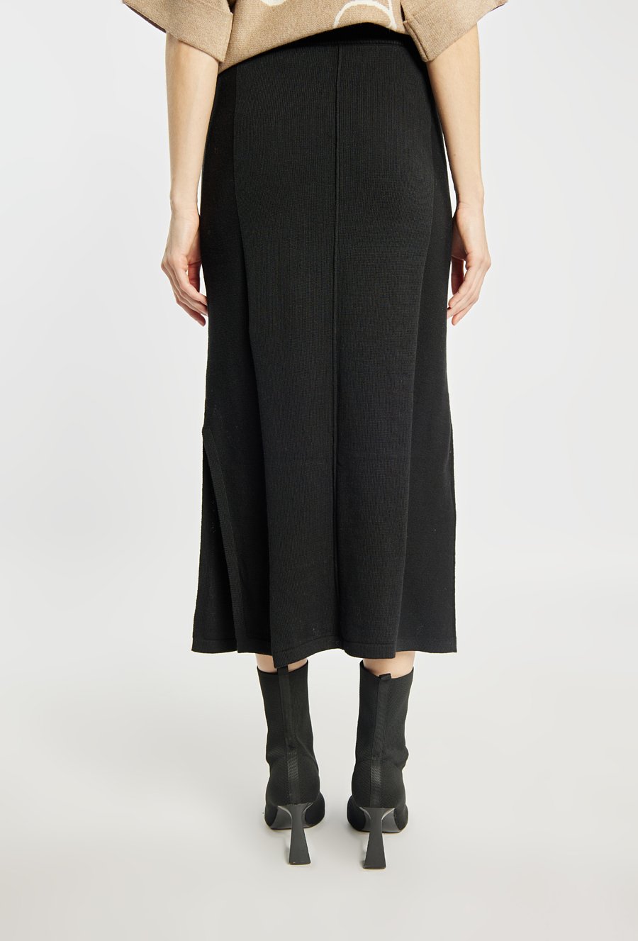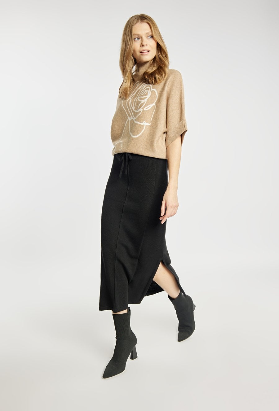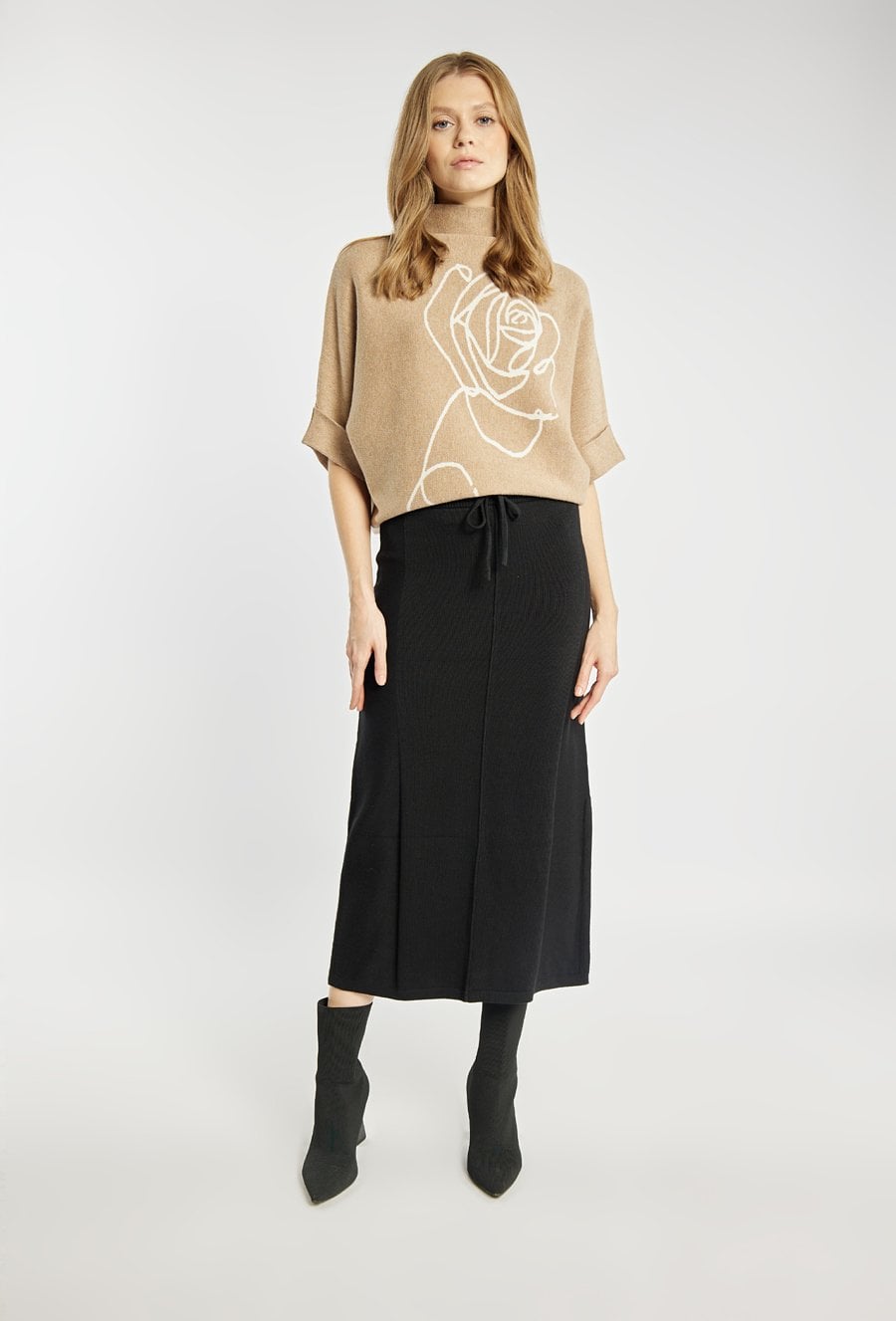 Spódnica damska o długości midi z prostym fasonem i subtelnym wiązaniem w pasie. Elastyczna talia zapewnia wygodę noszenia, a miękka tkanina pięknie układa się na sylwetce. Uniwersalny krój sprawia, że idealnie sprawdzi się zarówno w codziennych, jak i bardziej eleganckich stylizacjach. Modelka na zdjęciu ma 177 cm wzrostu i prezentuje rozmiar 36.