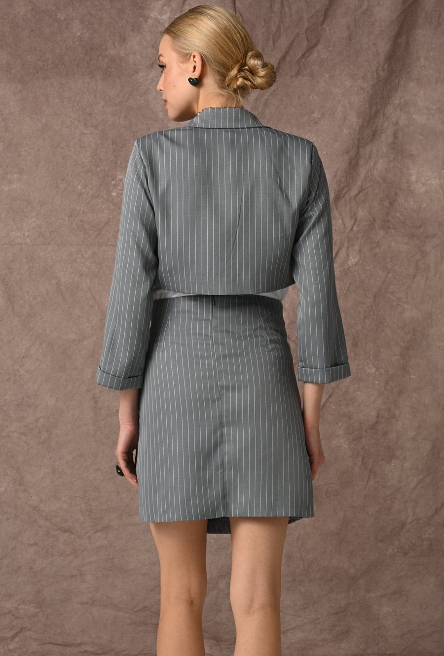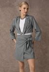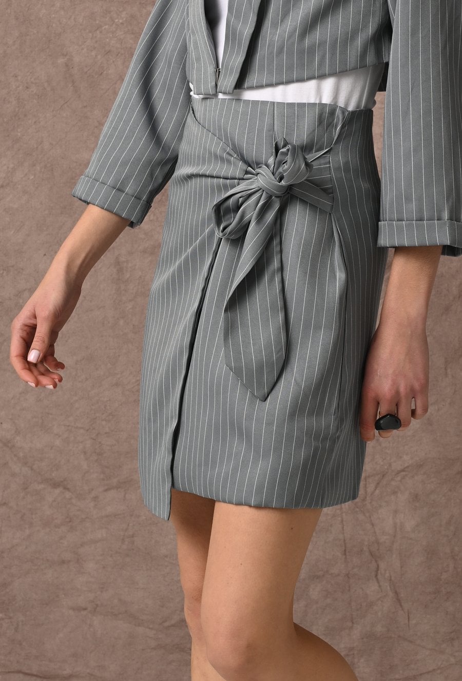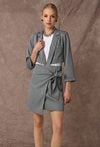Krótka spódnica w klasyczny prążek, która łączy elegancję z modowym charakterem. Tworzy stylowy zestaw z marynarką, a wygodna podszewka zapewnia komfort noszenia. Kryty zamek z tyłu ułatwia zakładanie, a efektowne wiązanie na przodzie dodaje całości nowoczesnego i wyrazistego akcentu. Idealna do biura, jak i na stylowe wyjścia. Modelka na zdjęciu ma 177 cm wzrostu i prezentuje rozmiar 36.