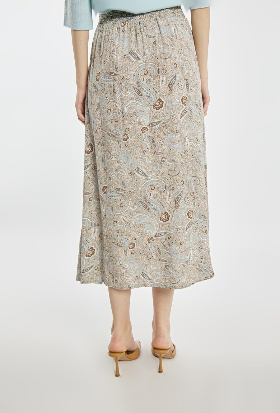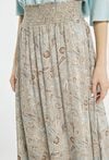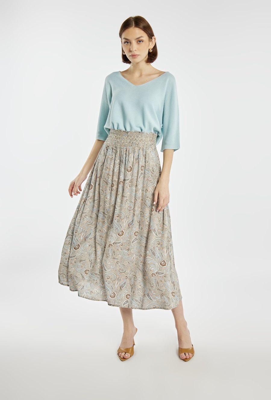Spódnica damska o lekkim, zwiewnym fasonie. Model z elastyczną, marszczoną talią, która zapewnia komfort noszenia i dobre dopasowanie do sylwetki. Długość midi nadaje całości kobiecego i eleganckiego charakteru. Idealna do codziennych oraz letnich stylizacji. Modelka na zdjęciu ma 177 cm wzrostu i prezentuje rozmiar 36.