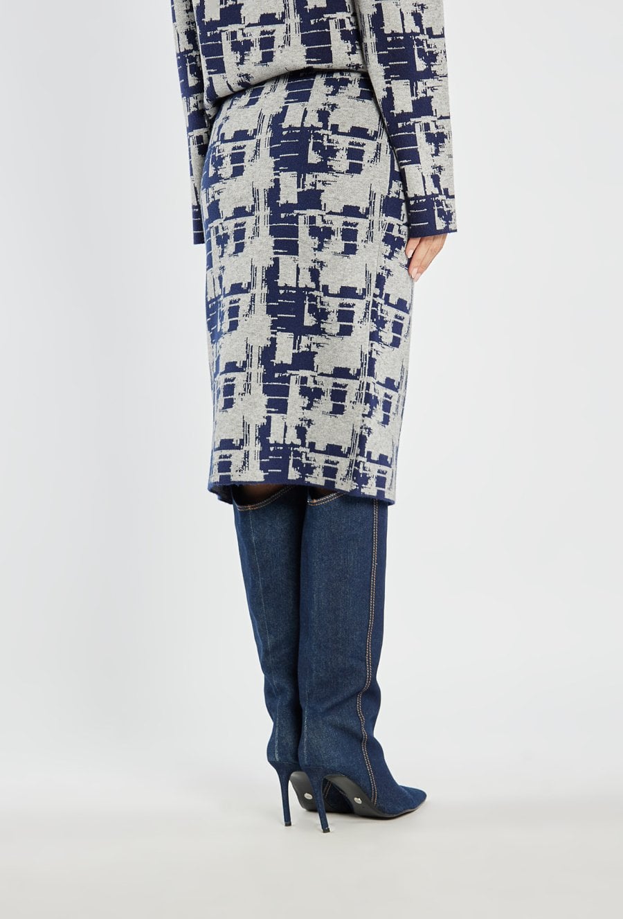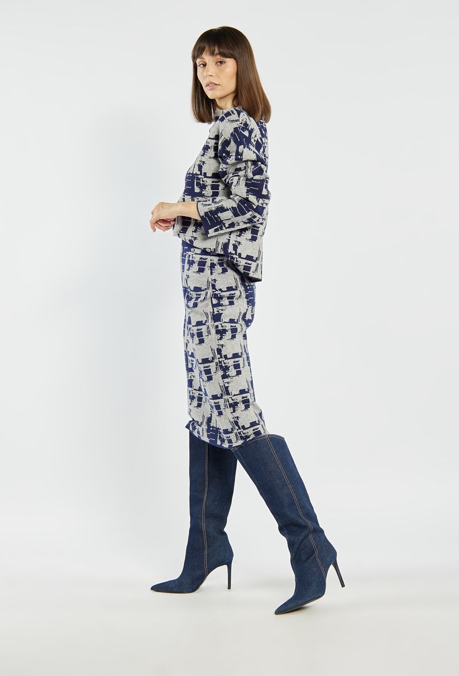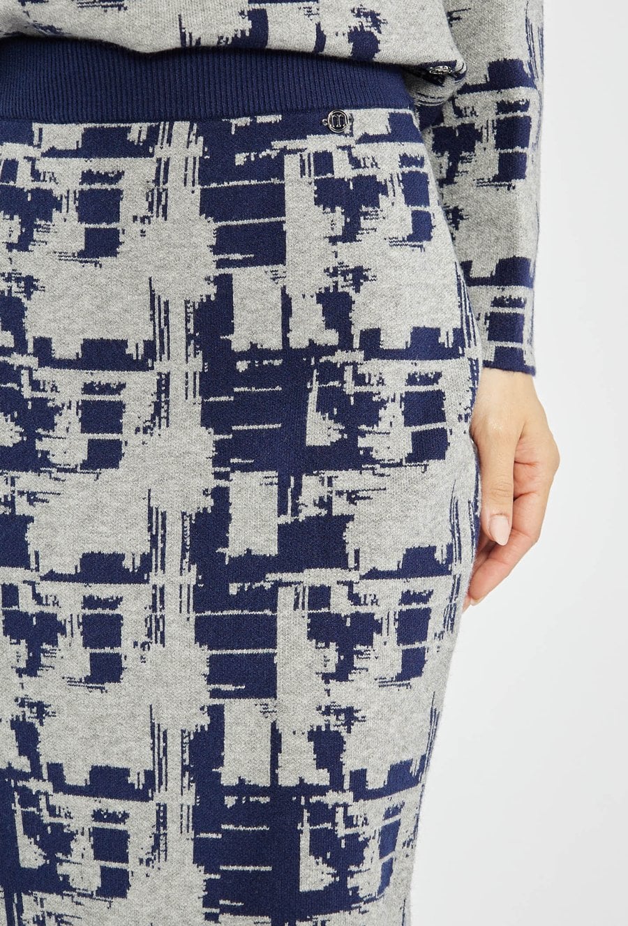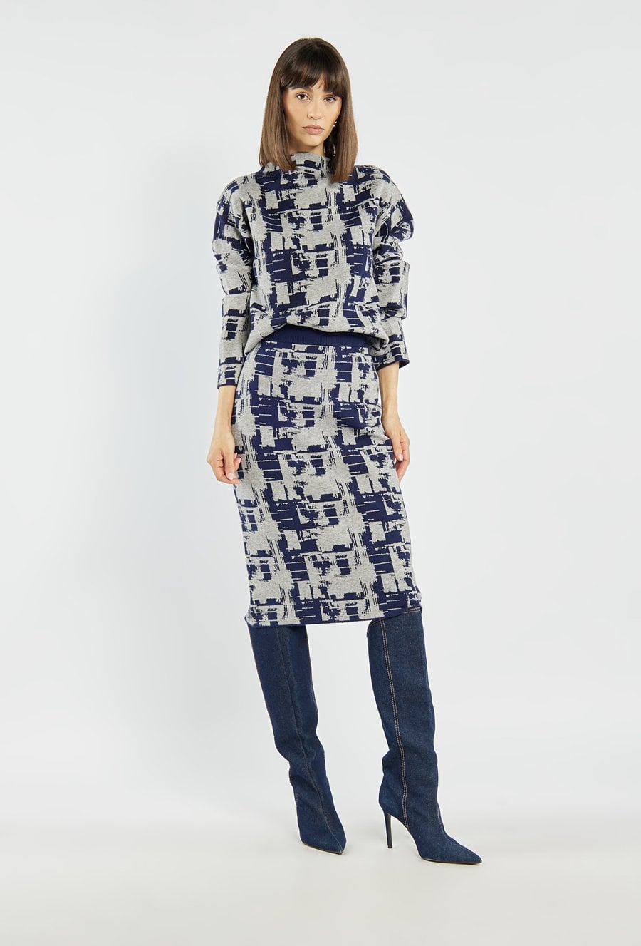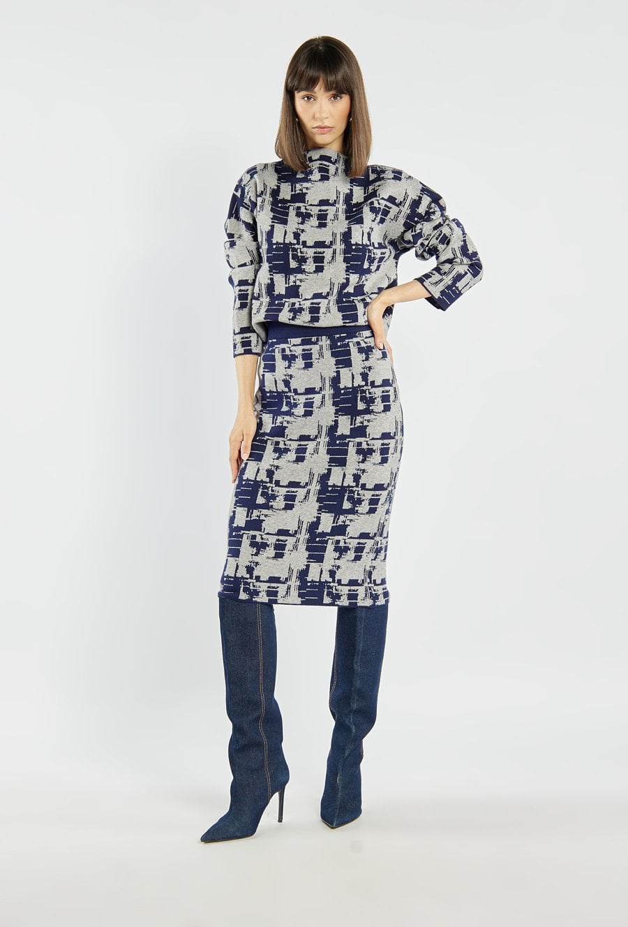 Spódnica ołówkowa o długości midi to elegancka propozycja z graficznym wzorem. Spódnica dopasowuje się do sylwetki, podkreślając kobiece kształty, a miękki materiał zapewnia wygodę noszenia. Polecamy zestawić z pasującym swetrem z tym samym wzorem. Kod do swetra: 25Z-SWE2350-KM13.
