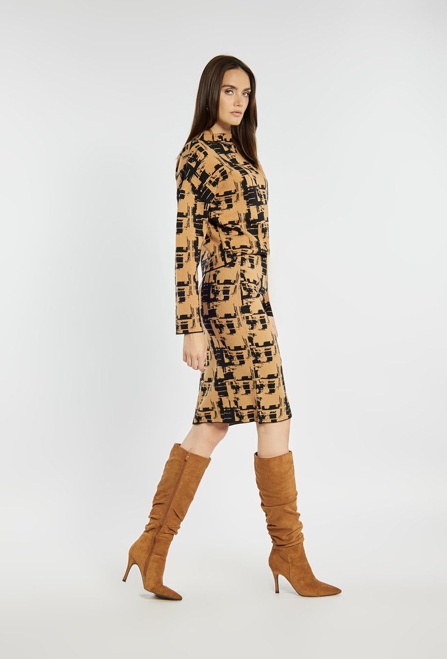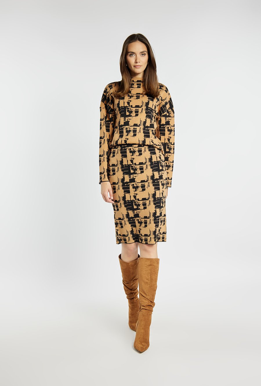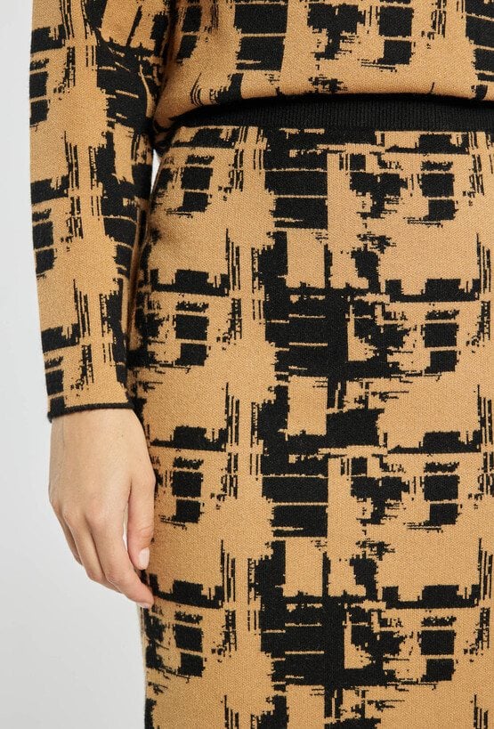Spódnica ołówkowa o długości midi to elegancka propozycja z graficznym wzorem. Spódnica dopasowuje się do sylwetki, podkreślając kobiece kształty, a miękki materiał zapewnia wygodę noszenia. Polecamy zestawić z pasującym swetrem z tym samym wzorem. Kod do swetra: 25Z-SWE2350-KM16.
