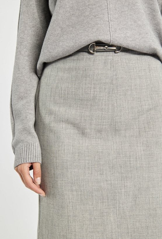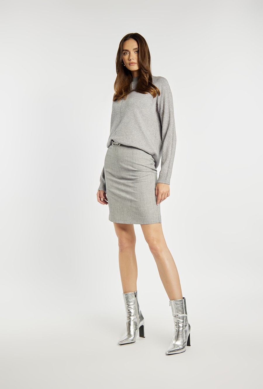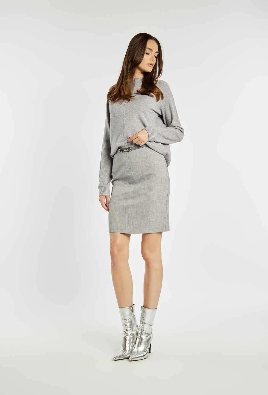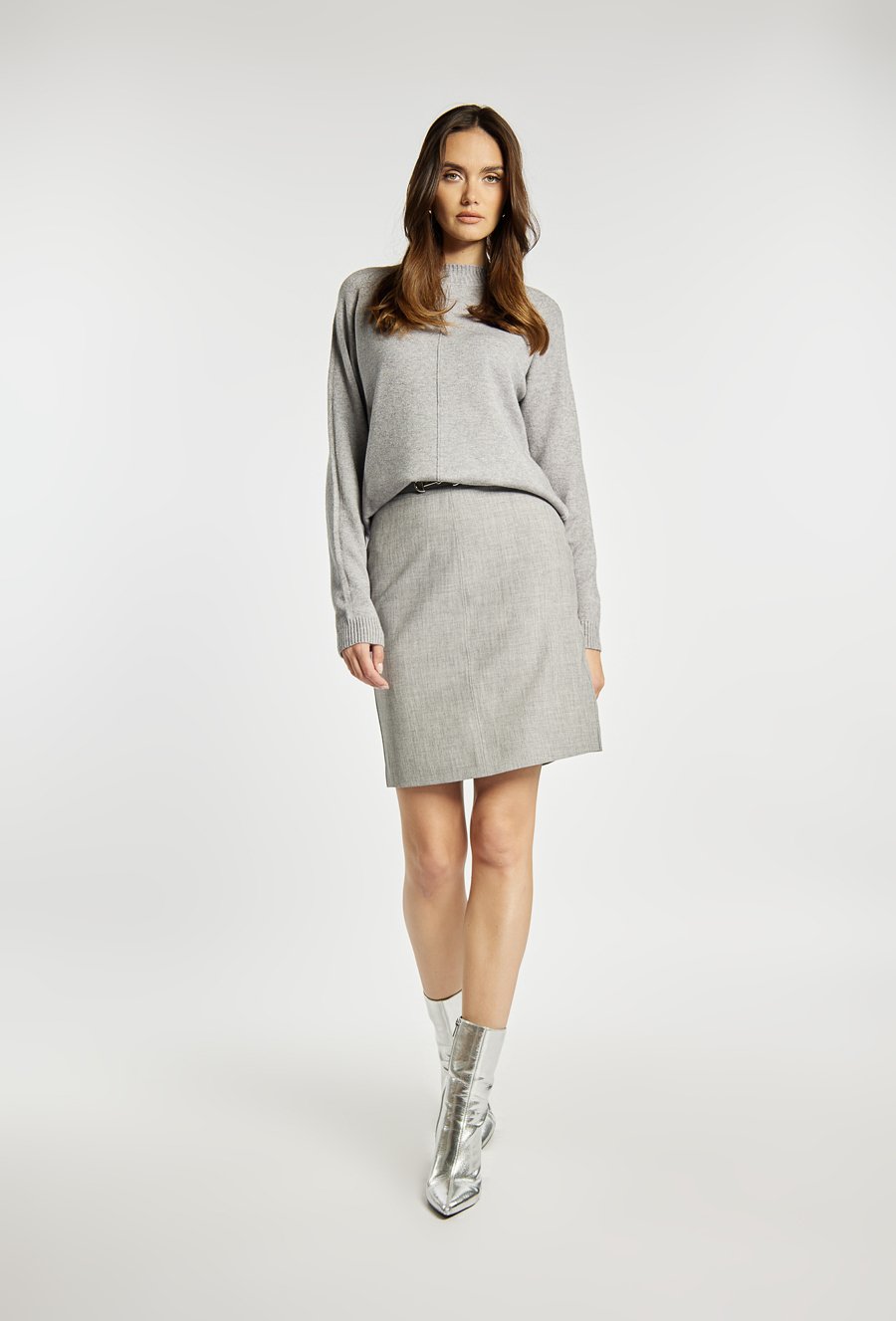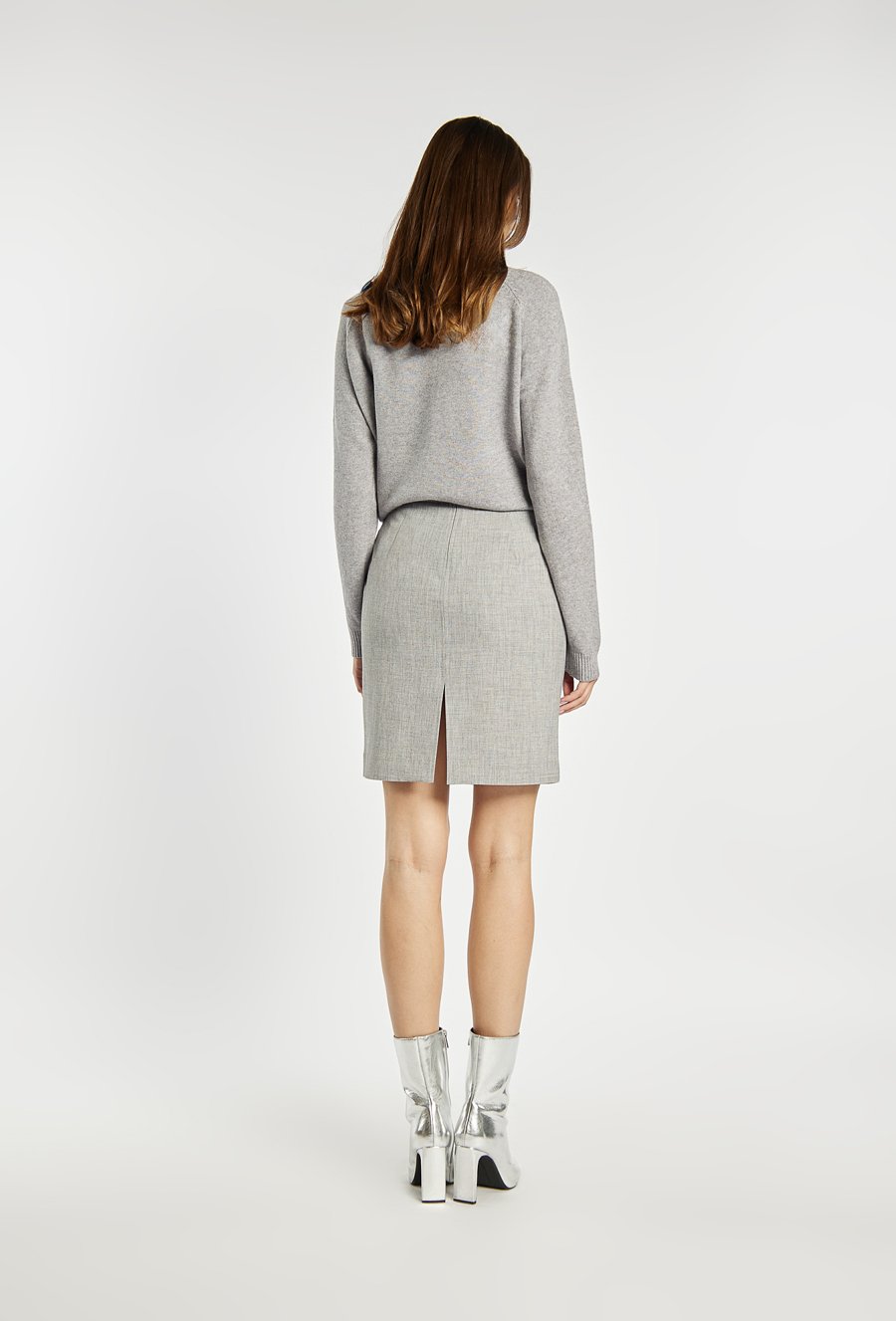 Uniwersalna spódnica o prostym, dopasowanym fasonie i długości mini to świetna propozycja do stylizacji biurowych i codziennych. Minimalistyczna forma pozwala na łatwe łączenie z eleganckimi koszulami, dzianinami czy marynarkami. Idealna baza dla nowoczesnych, klasycznych zestawów. Kod do pasującej marynarki: 25J-BZR0690-K018. Modelka na zdjęciu ma 177 cm wzrostu i prezentuje rozmiar 36.