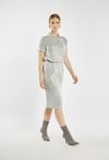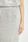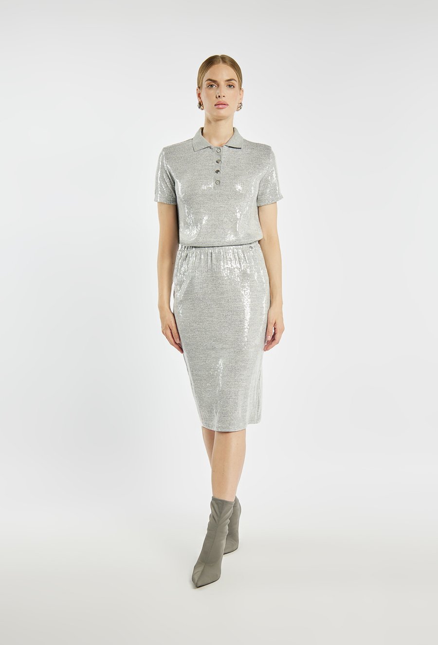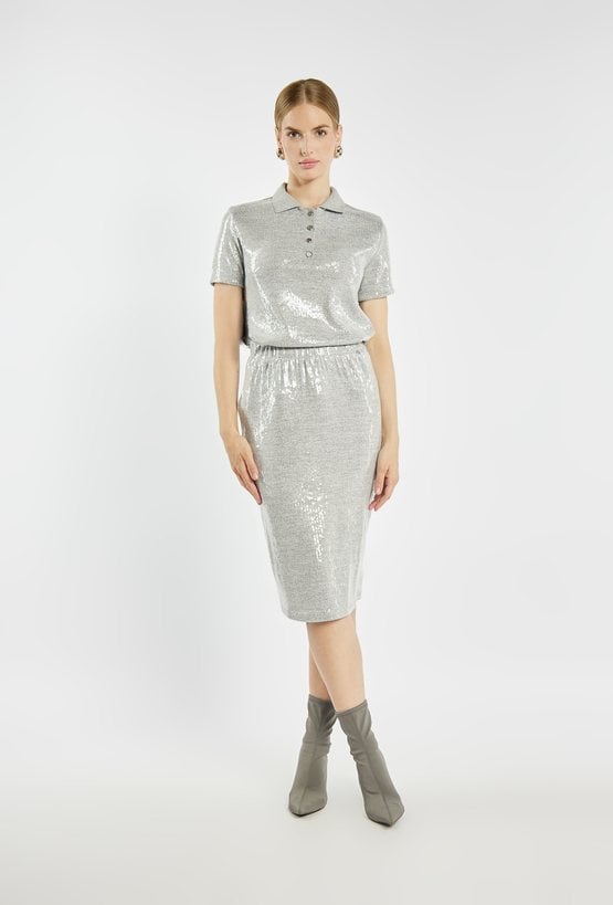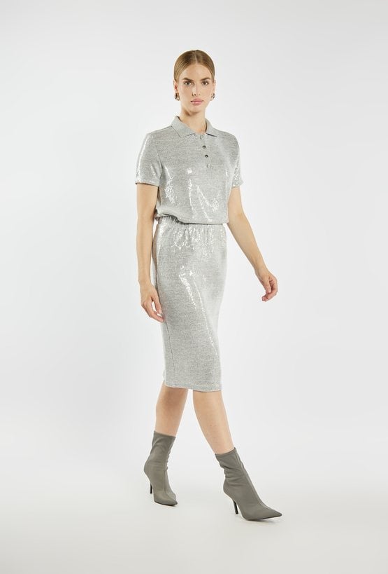 Cekinowa spódnica ołówkowa o długości do kolan. Elastyczna talia zapewnia wygodę, a połyskujące cekiny nadają całości efektownego, wieczorowego charakteru. Idealna propozycja na wyjątkowe okazje i eleganckie stylizacje. Polecamy zestawić z pasującą bluzką. Kod do niej: 25Z-BLU3130. Modelka na zdjęciu ma 177 cm wzrostu i prezentuje rozmiar 36.