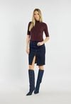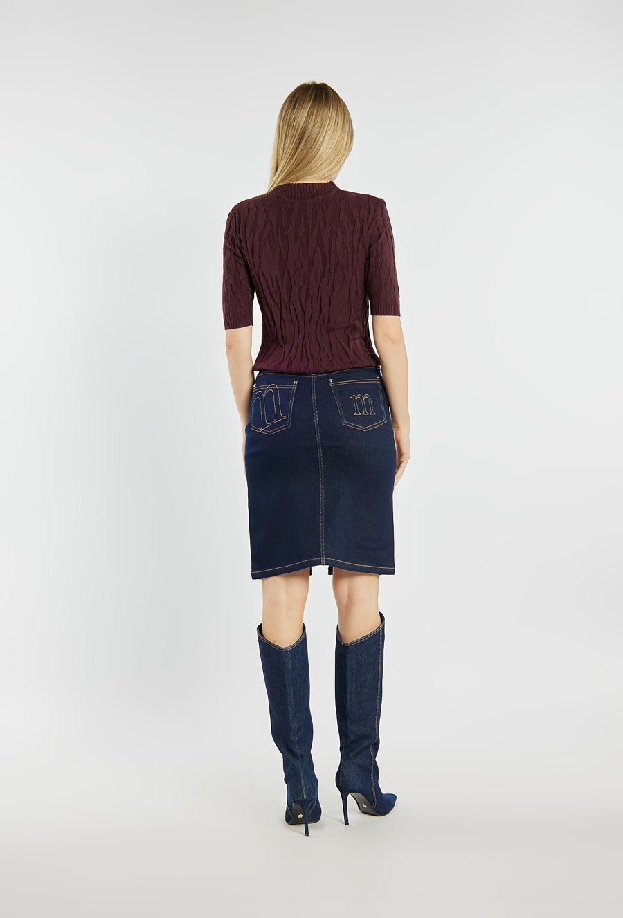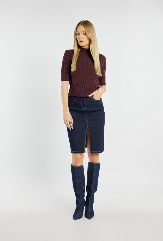 Spódnica o ołówkowym kroju z klasycznym rozcięciem z przodu to połączenie kobiecej elegancji i casualowego stylu. Kontrastowe przeszycia dodają jej charakteru, a elastyczny materiał zapewnia wygodę noszenia. Idealna do codziennych stylizacji. Modelka na zdjęciu ma 177 cm wzrostu i prezentuje rozmiar 36.