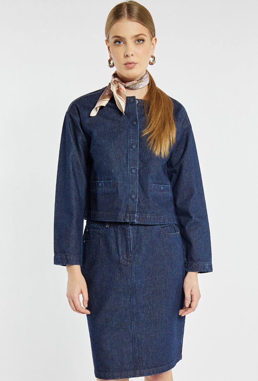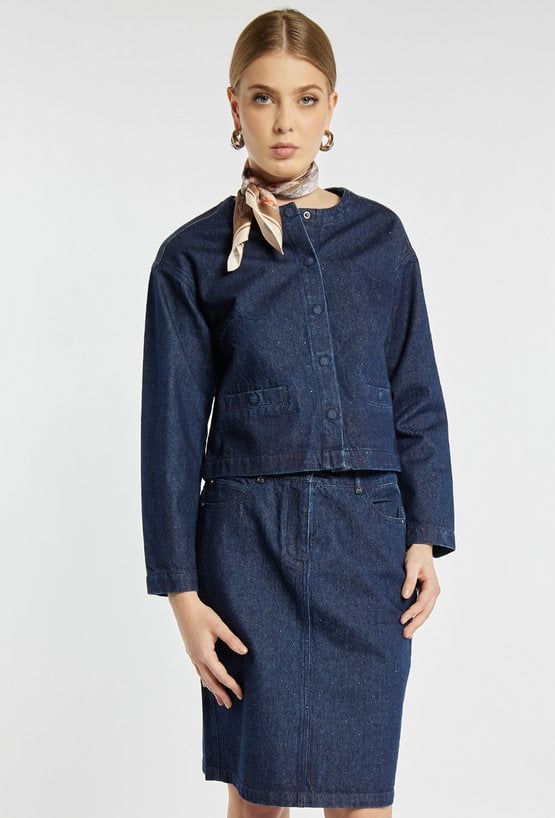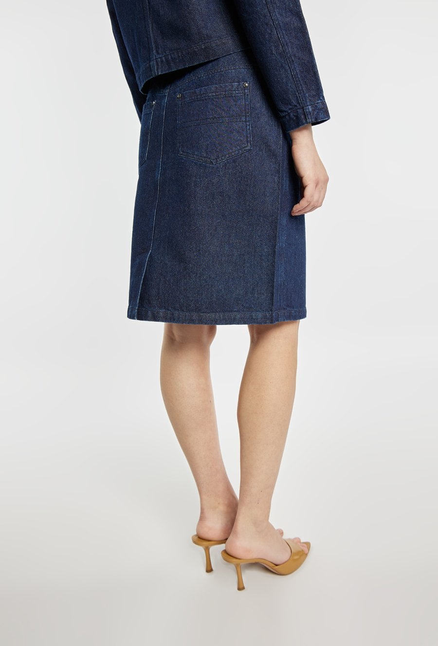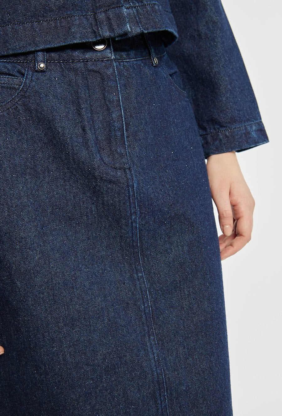 Spódnica damska o klasycznym kroju, wykonana z materiału o delikatnym, subtelnym połysku. Spódnica z praktycznymi szlufkami, zapinana na suwak i guzik, ładnie układa się na sylwetce i zapewnia komfort noszenia. Model sprawdzi się zarówno w codziennych stylizacjach, jak i w bardziej eleganckich zestawach. Modelka na zdjęciu ma 177 cm wzrostu i prezentuje rozmiar 36.