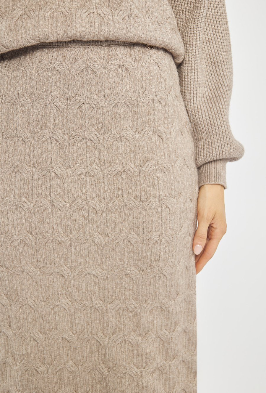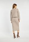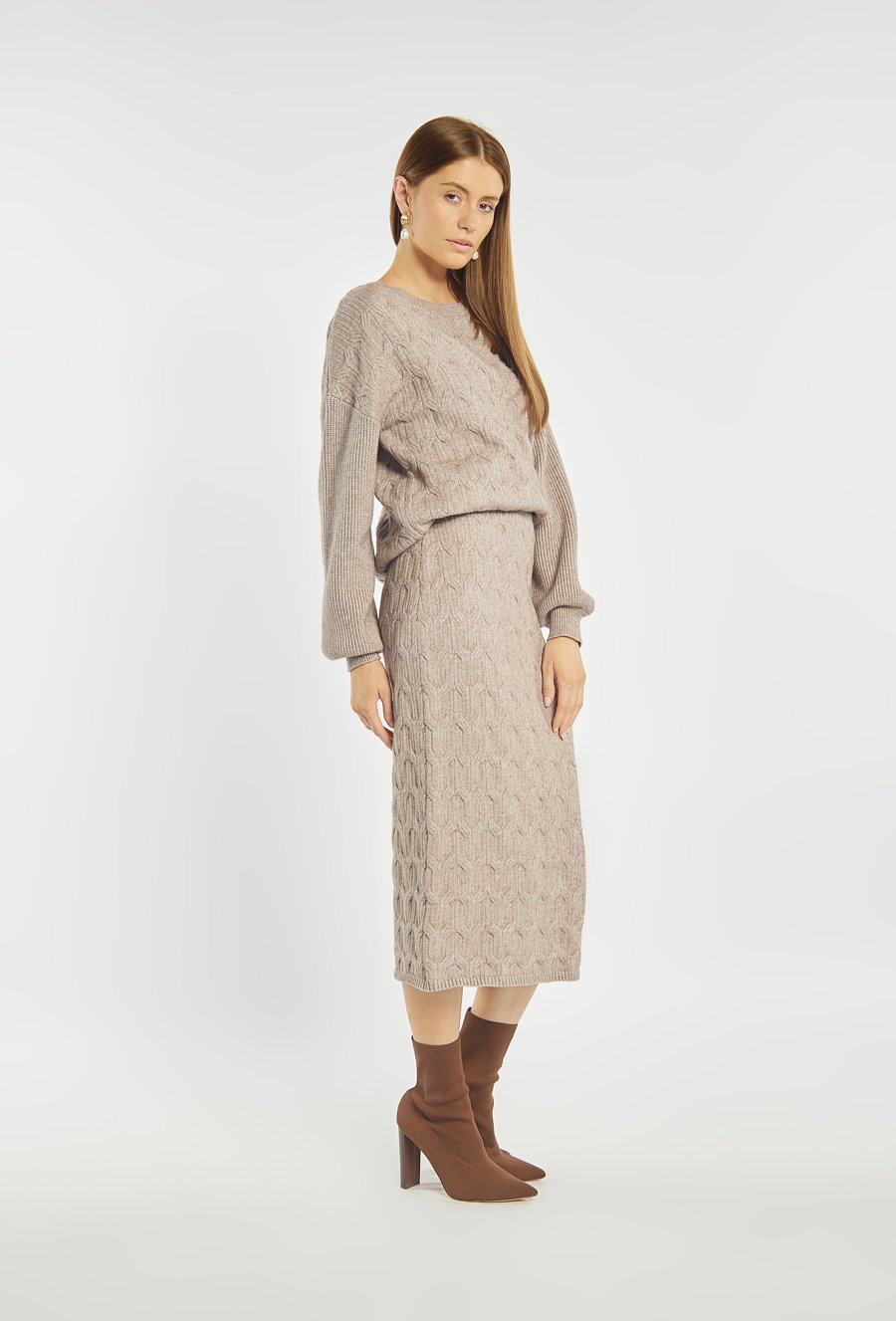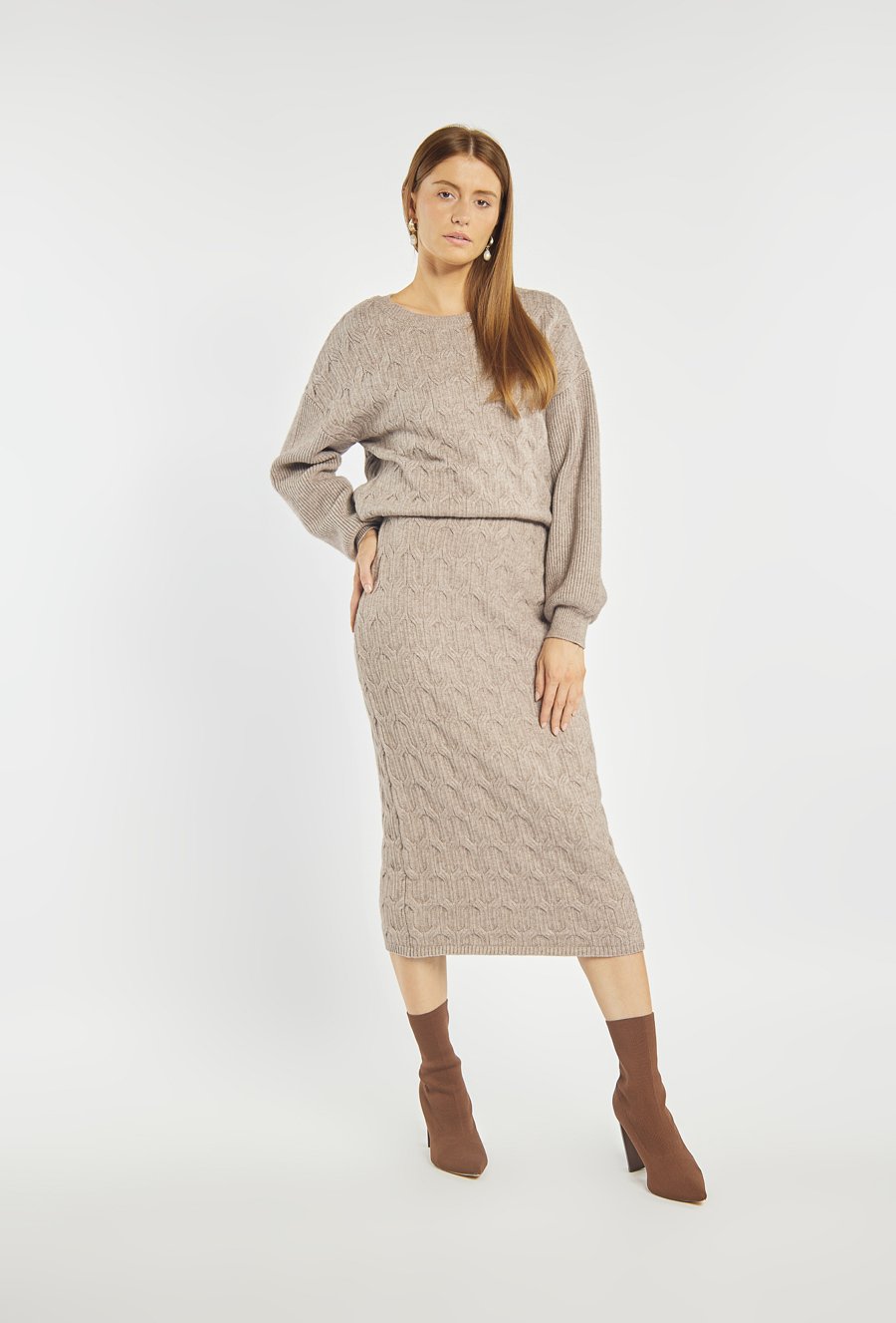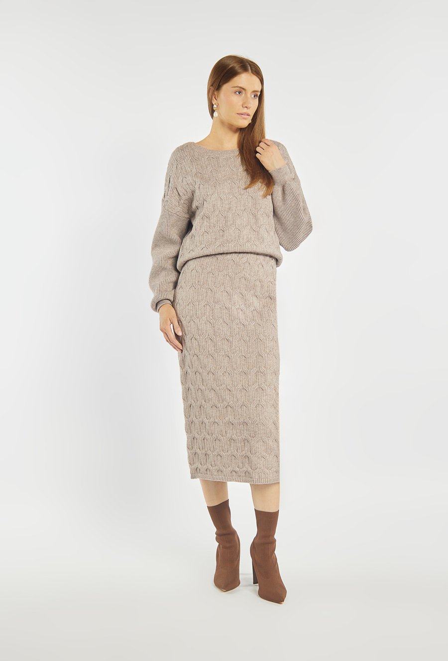Ołówkowa spódnica z wzorem. Model o długości midi z elastyczną talią, która zapewnia wygodę noszenia i doskonałe dopasowanie. Spódnica idealnie sprawdzi się w zestawie ze swetrem z tej samej kolekcji, tworząc stylowy komplet. Kod do swetra: 25Z-SWE2190. Modelka na zdjęciu ma 177 cm wzrostu i prezentuje rozmiar 36.