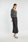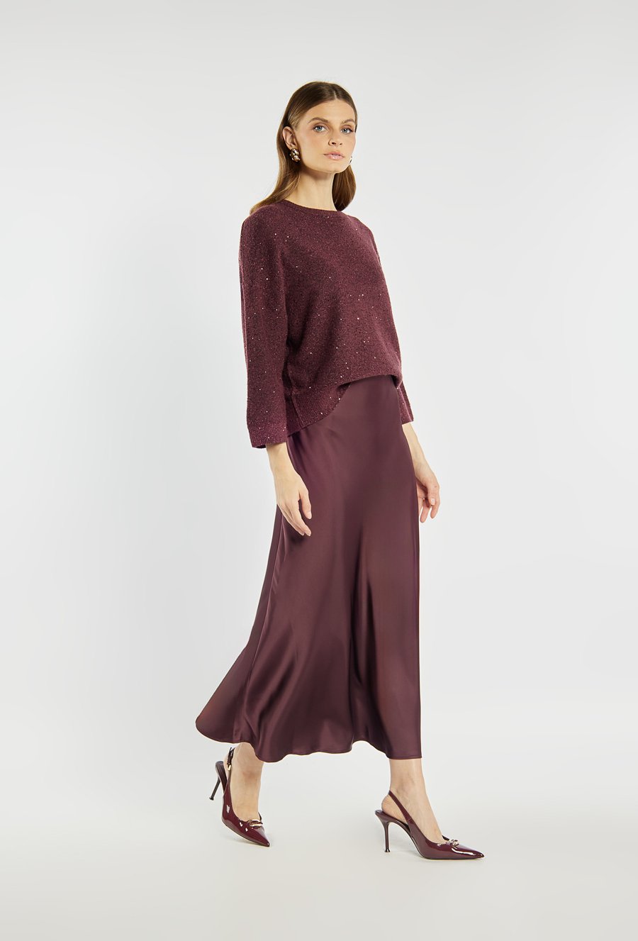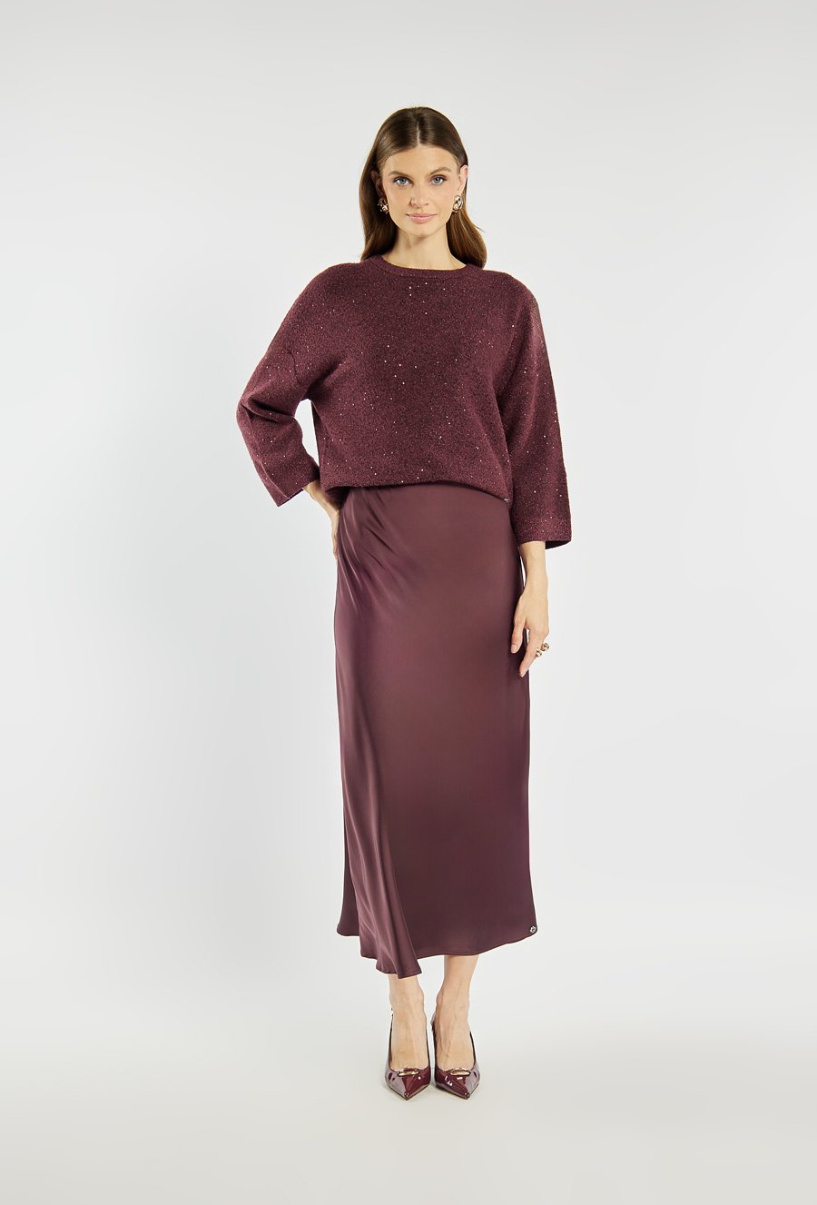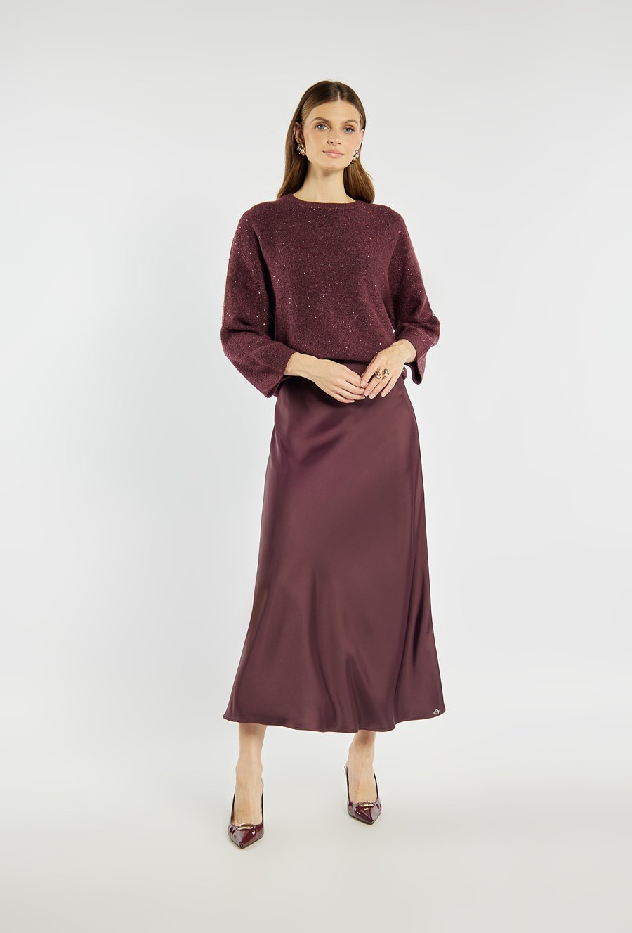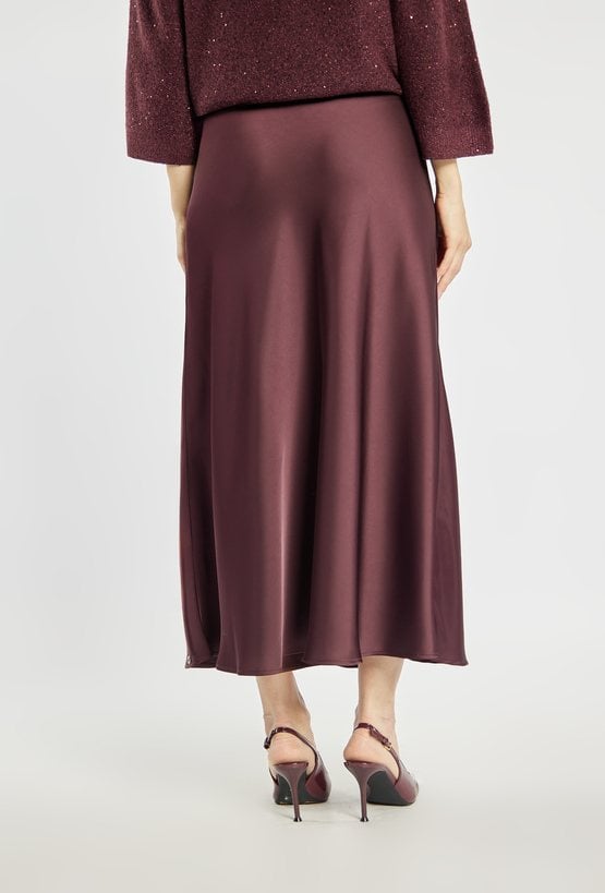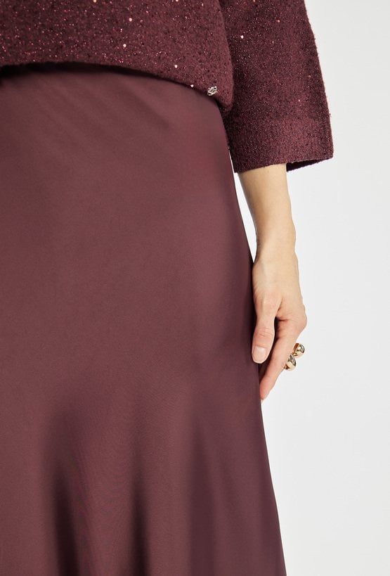 Spódnica o długości midi uszyta z połyskującej, satynowej tkaniny. Prosty krój pięknie układa się na sylwetce, a delikatny materiał nadaje całości lekkości i subtelnej elegancji. To uniwersalny model, który sprawdzi się zarówno w codziennych, jak i bardziej formalnych stylizacjach. Modelka na zdjęciu ma 177 cm wzrostu i prezentuje rozmiar 36.