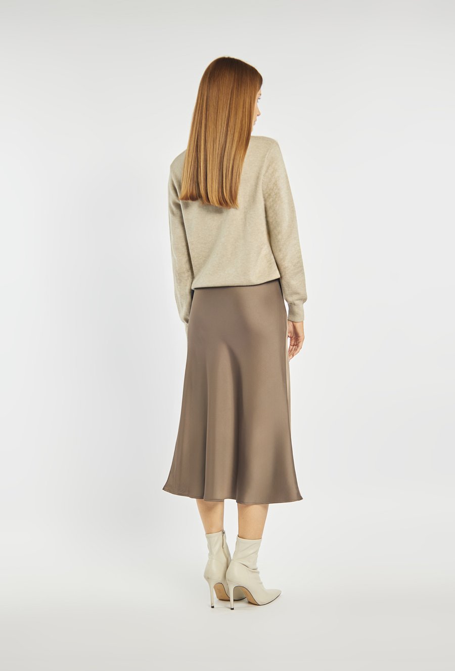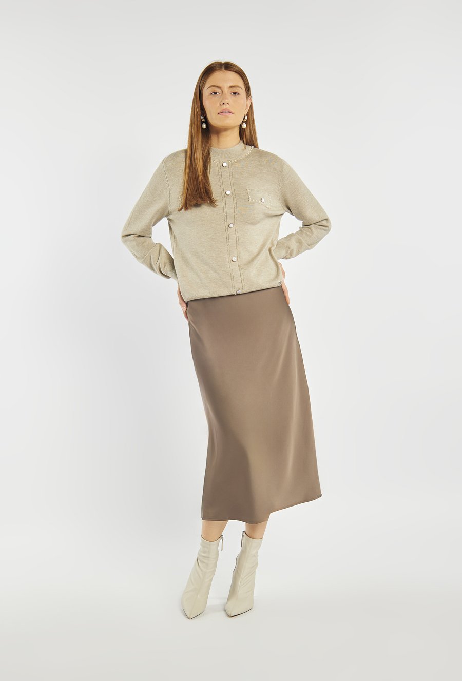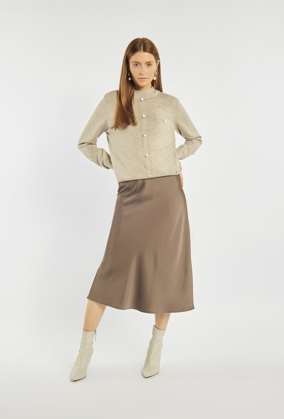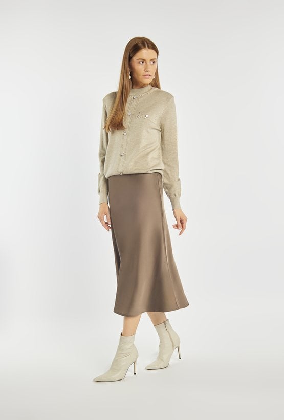 Spódnica damska o długości midi. Spódnica o delikatnym, satynowym połysku. Klasyczny, lekko rozszerzany fason subtelnie układa się na sylwetce, dodając jej lekkości i elegancji. Idealna propozycja zarówno na co dzień, jak i na wyjątkowe okazje. Modelka na zdjęciu ma 177 cm wzrostu i prezentuje rozmiar 36.